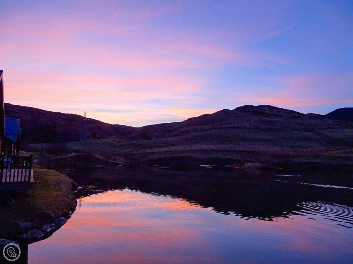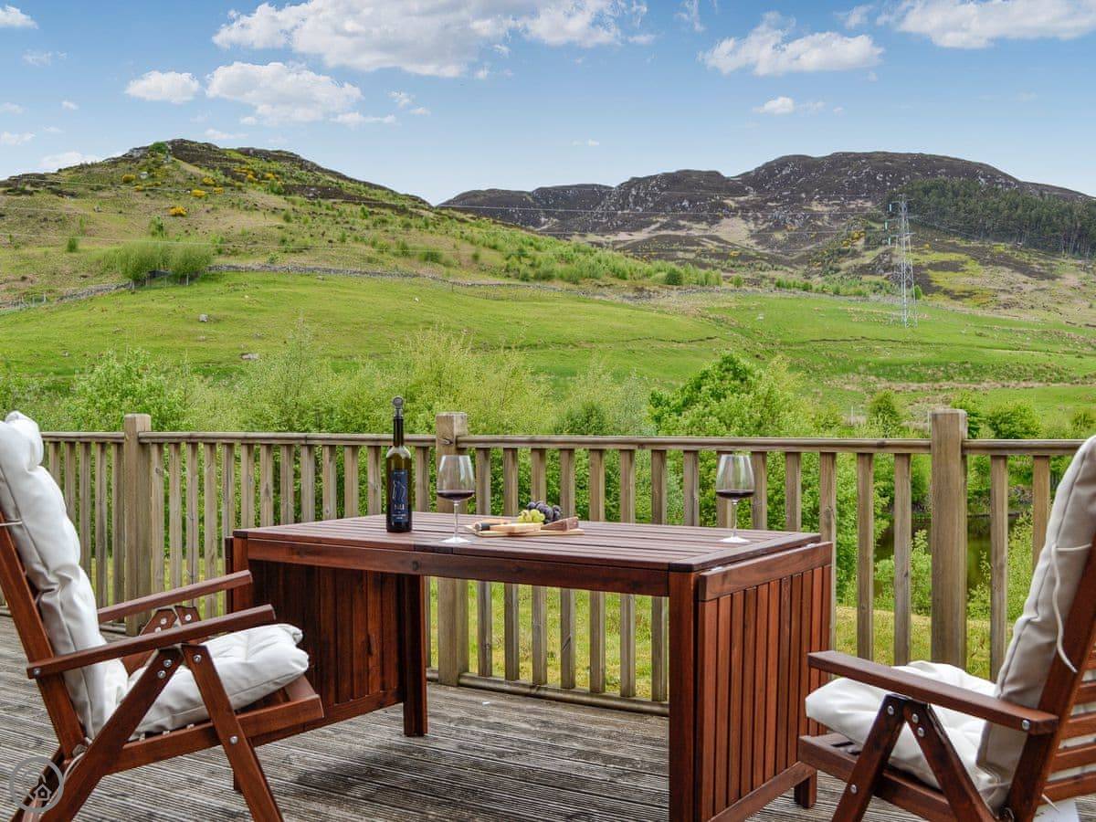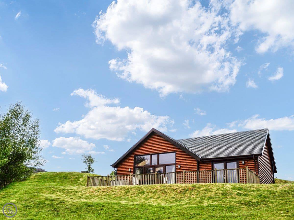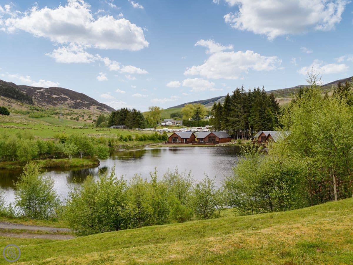 Glengoulandie Lodge is near Keltneyburn, between Aberfeldy and Pitlochry. It's a detached bungalow, so all on one level. You look out over a loch and a deer park. The view is good, lots of hills and water, and it changes with the weather.