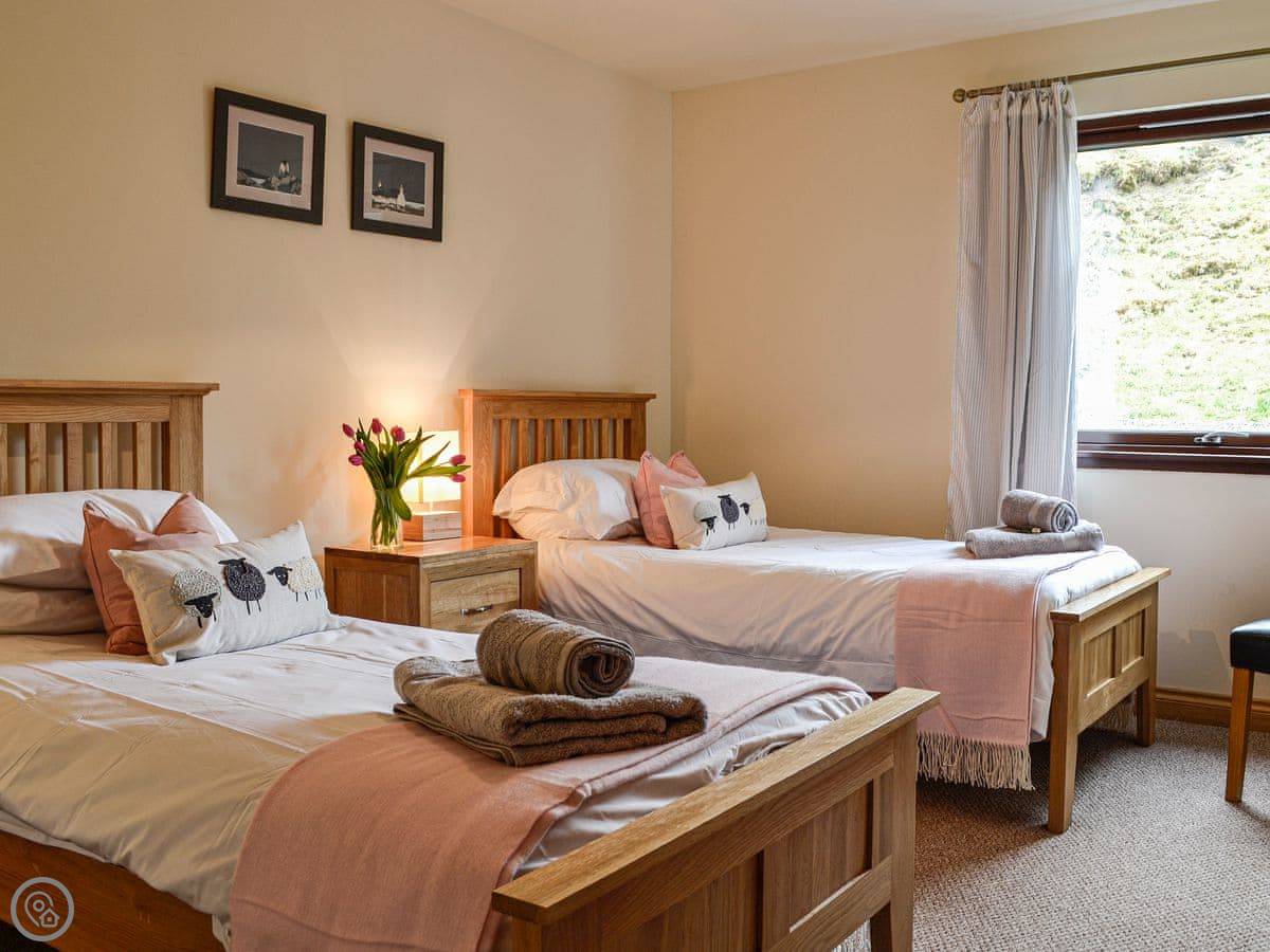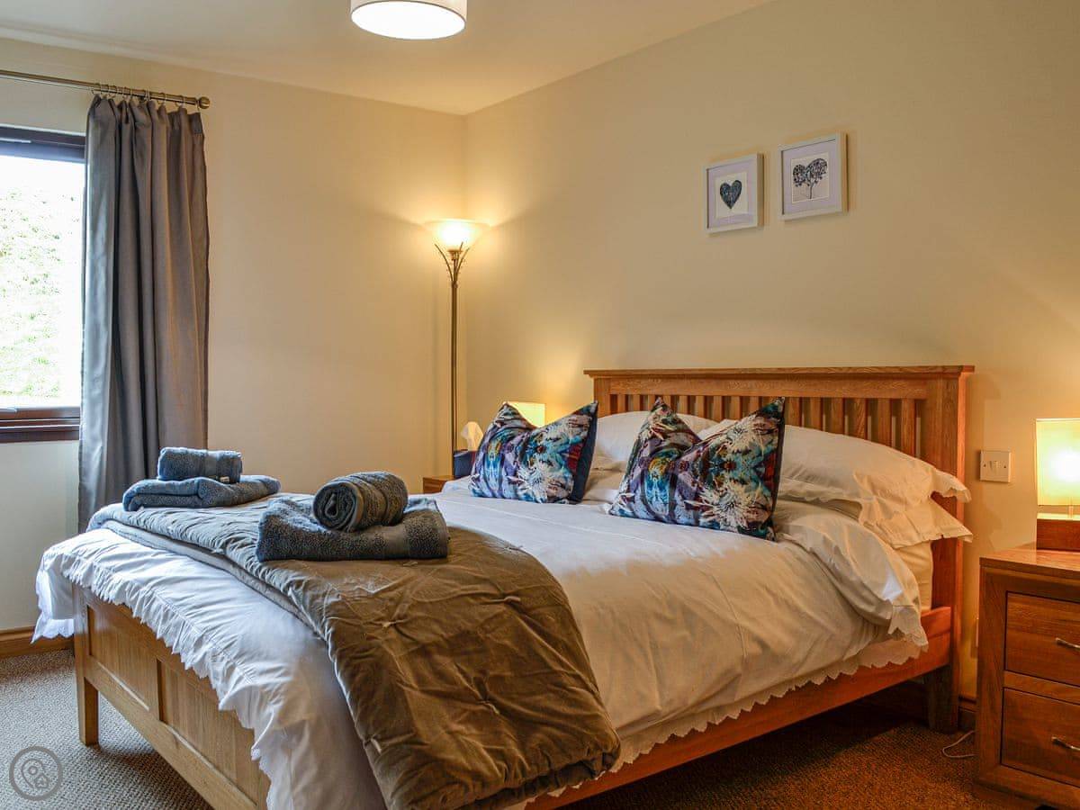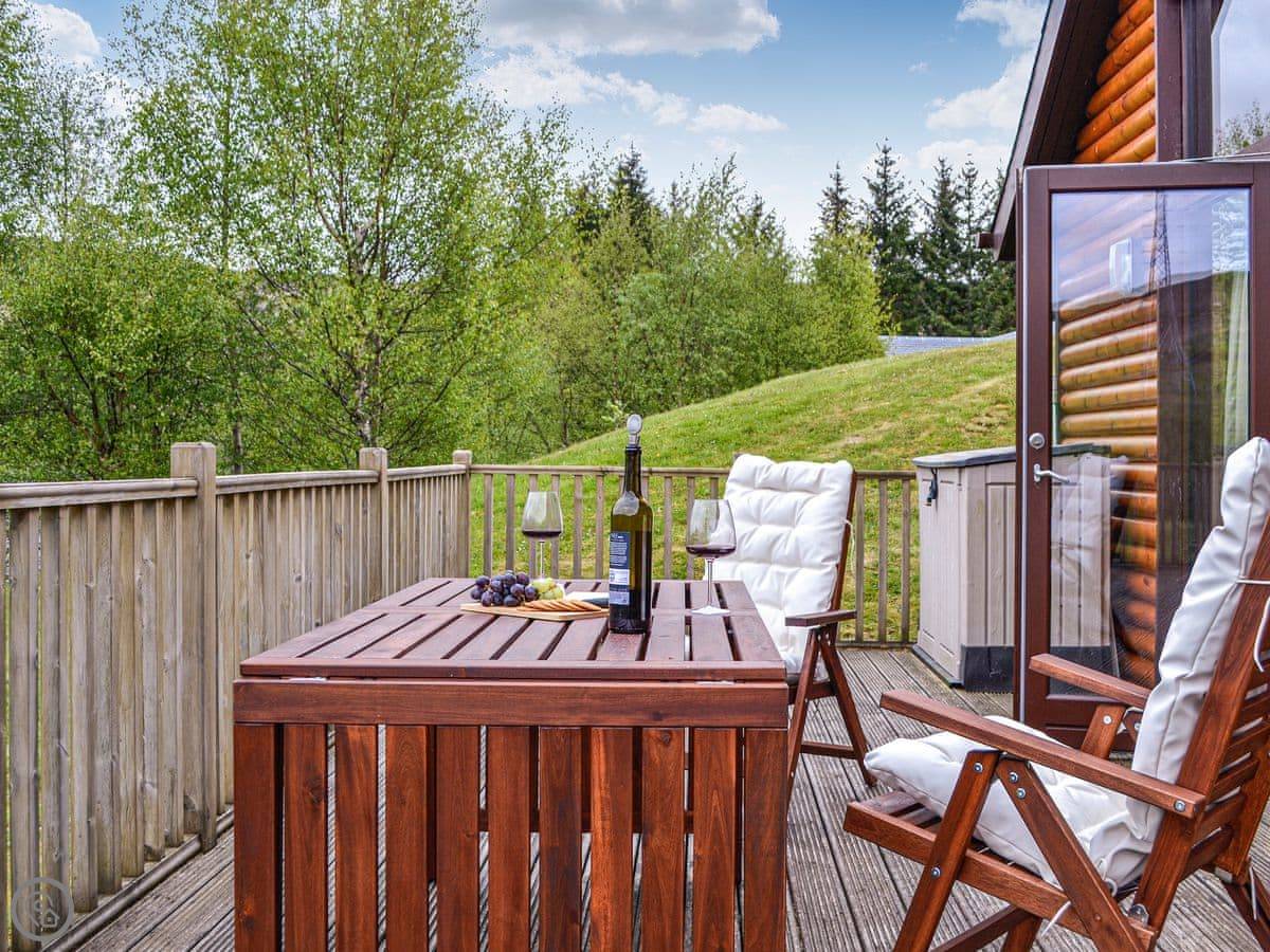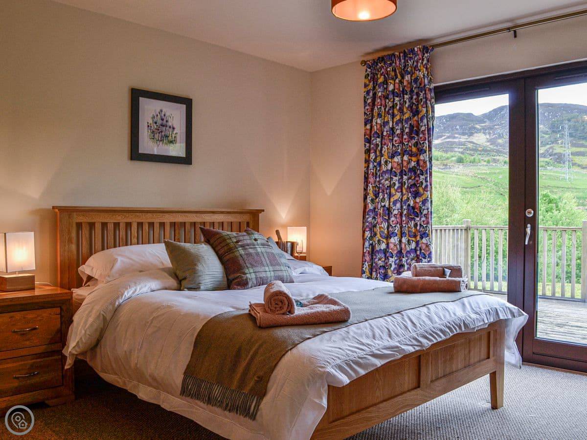 Glengoulandie Lodge is near Keltneyburn, between Aberfeldy and Pitlochry. It's a detached bungalow, so all on one level. You look out over a loch and a deer park. The view is good, lots of hills and water, and it changes with the weather.