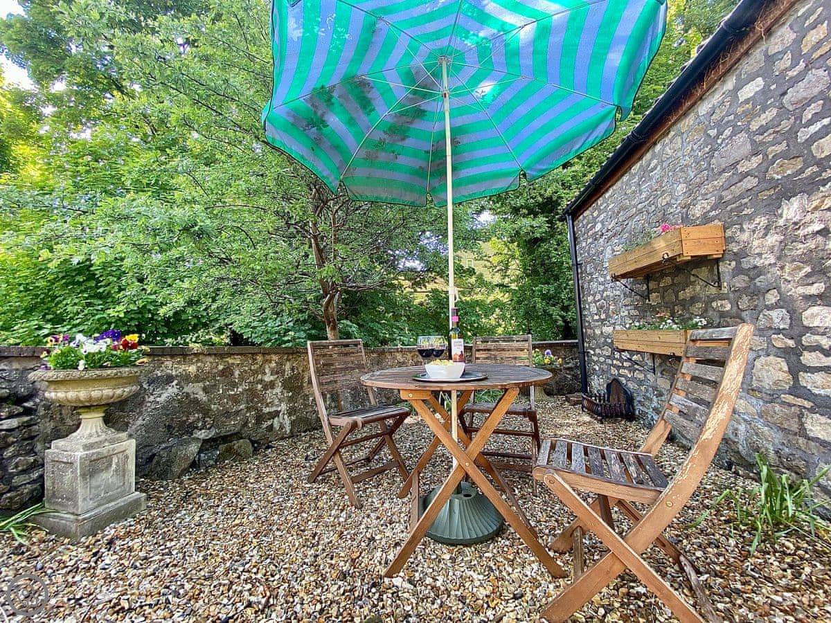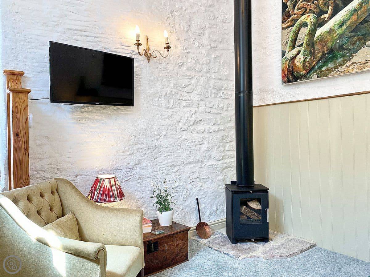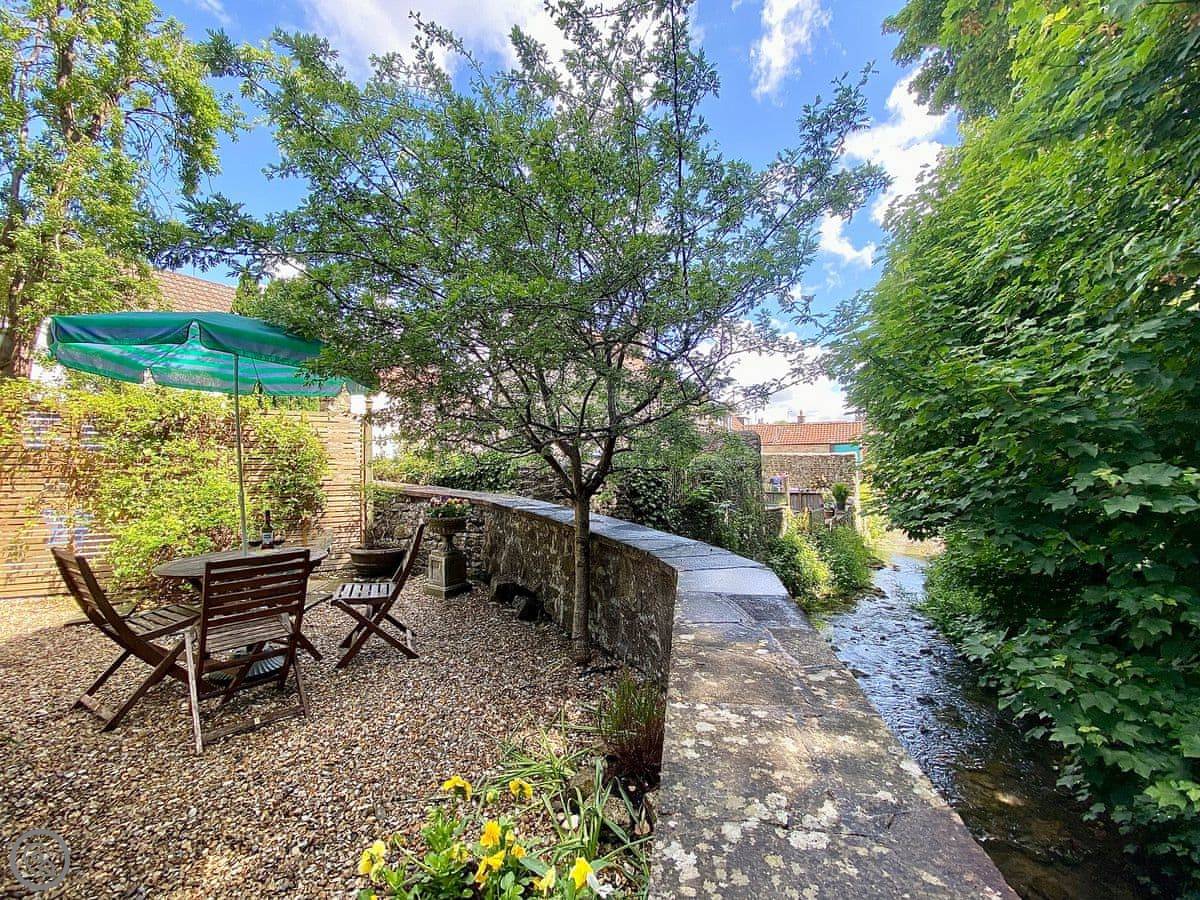 Downstairs is a small living room with a wood burner. The kitchen has what you need. Opposite the road there's a little private courtyard. It's got a table, chairs, a barbecue and a firepit. It looks over the river.