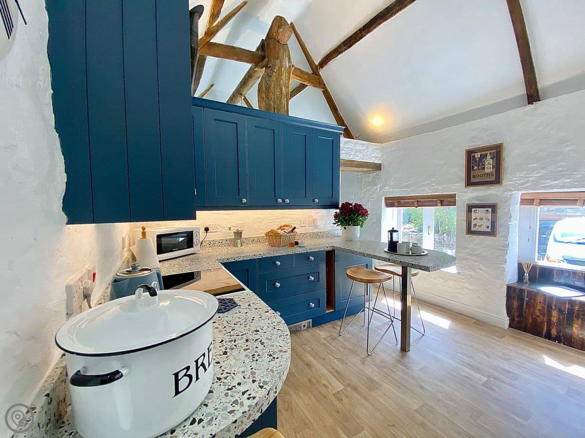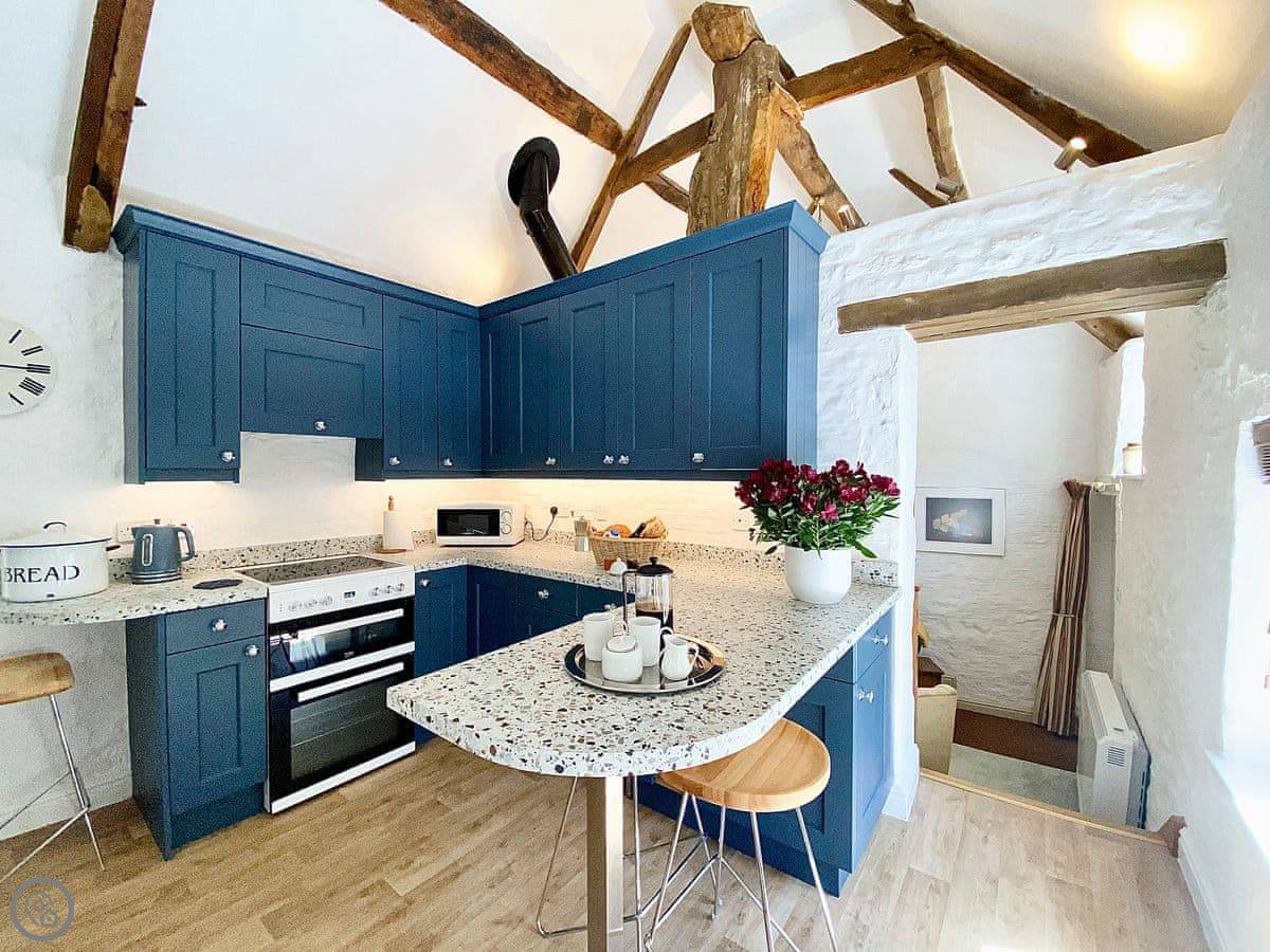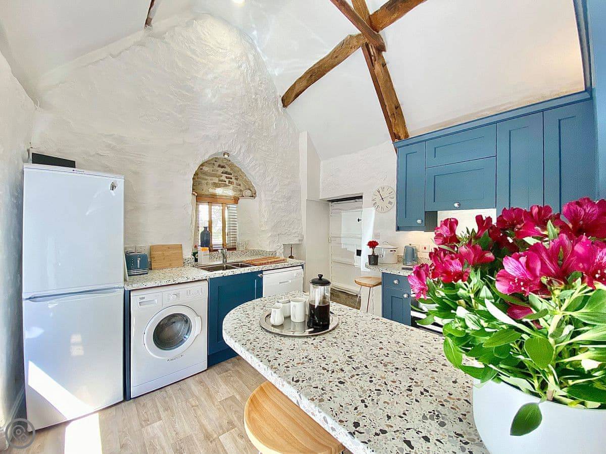 Downstairs is a small living room with a wood burner. The kitchen has what you need. Opposite the road there's a little private courtyard. It's got a table, chairs, a barbecue and a firepit. It looks over the river.