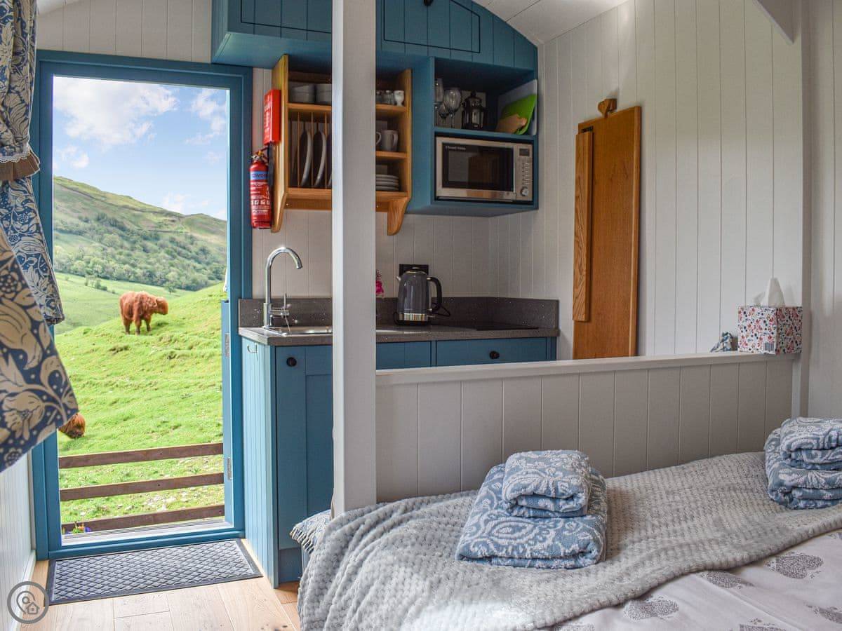 As soon as you open the door on this cute Shepherds hut you can see comfort and quality in a compact space but with surprisingly little sacrifice, the main feature is the comfy double bed which welcomes you and promises a cosy night’s sleep and long lie ins if you want them. There is a kitchen area with a fridge, two ring hob and microwave so you can cook a romantic meal which you can enjoy as you sit on the bench seat with a drop-down table in front of you. There is even a fully plumbed en-suite bathroom with shower. You certainly are cosy with the underfloor heating and electric fire if you want an additional boost of heat. There is no TV, but the fantastic views from the window are enough to sit and watch as the ever-changing light gives you an infinite number of scenes to enjoy. There is Wi-Fi if you want to share your holiday with your friends and family. The Hut is set up in the hills. Within 1 mile of the hut, you will find yourself in beautiful Ambleside which offers a wide selection of independent shops, pubs, restaurants and not one but two cinemas. Waterhead Pier, which dates back to 1845, is the gateway to ferries that can take you to Bowness, Lakeside Pier near Newby Bridge, Wray Castle and Brockhole Visitor Centre, or you can hire a boat to explore the lake yourself. The outdoor enthusiast will find activities ranging from abseiling and climbing to bushcraft and sailing. Alternatively, a short walk from Ambleside will lead you to Stagshaw Gardens, a National Trust property, or Stock Ghyll Force, a spectacular 70-foot waterfall that can be viewed from a railing. There are a wide variety of other attractions within easy reach, including the Motor Museum, Beatrix Potter attraction, Segway’s, aquarium, animal parks and many more, you’ll be spoilt for choice.