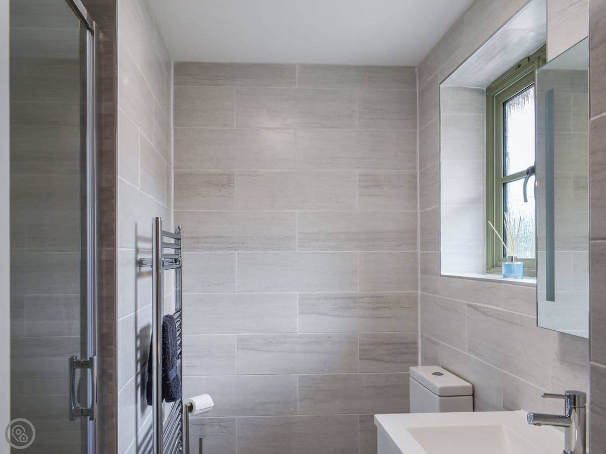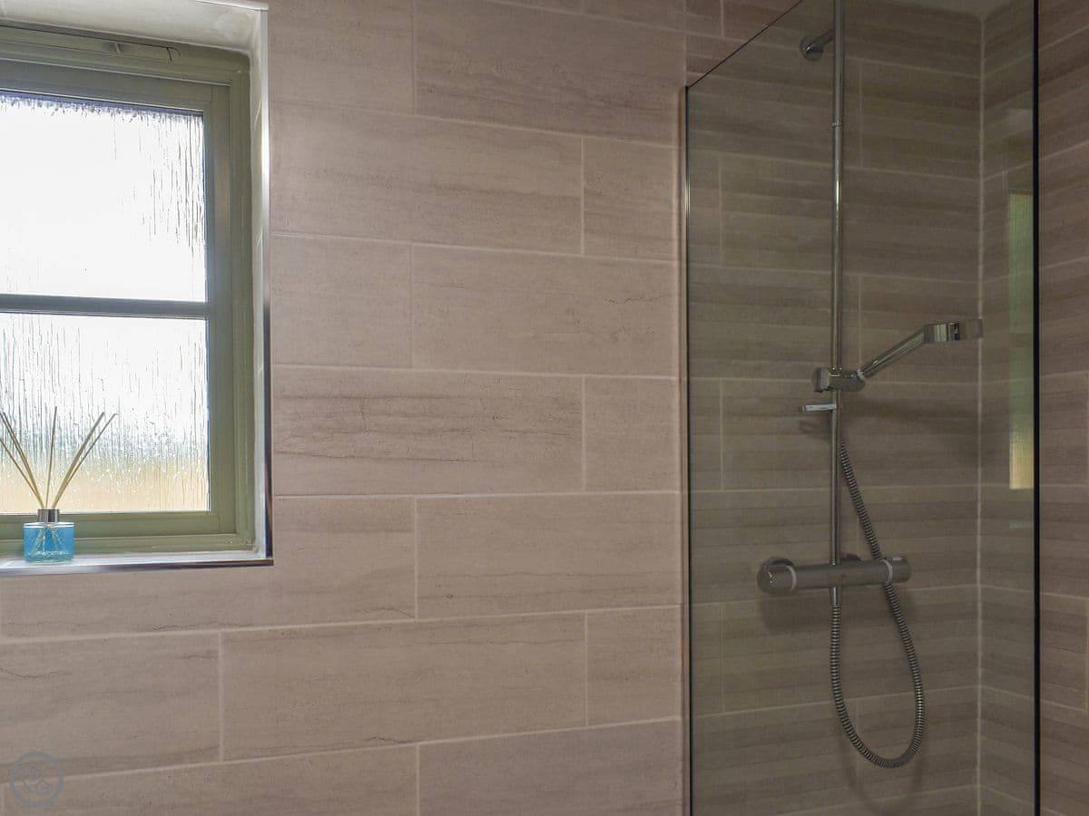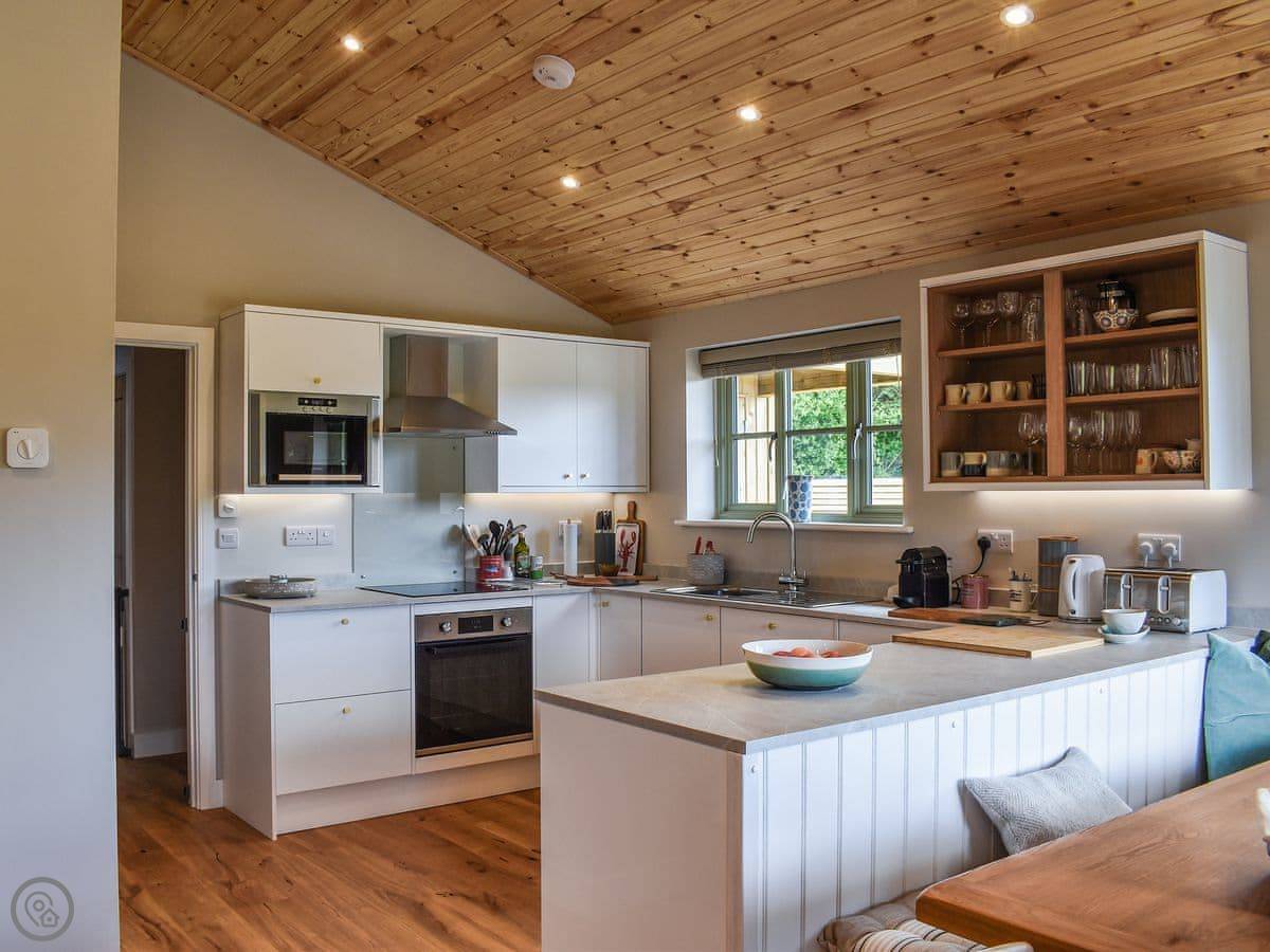 It sleeps six. Three bedrooms, two bathrooms. Both have walk-in showers. One bedroom has its own shower room. There's a wood burner in the living area. The kitchen is fine, it has a dishwasher and a washing machine.