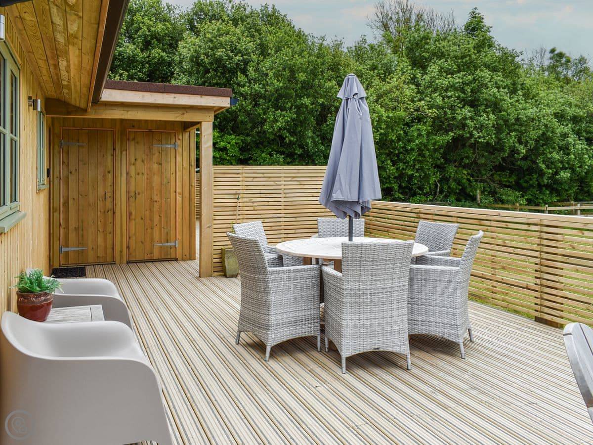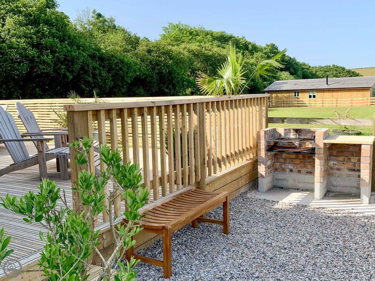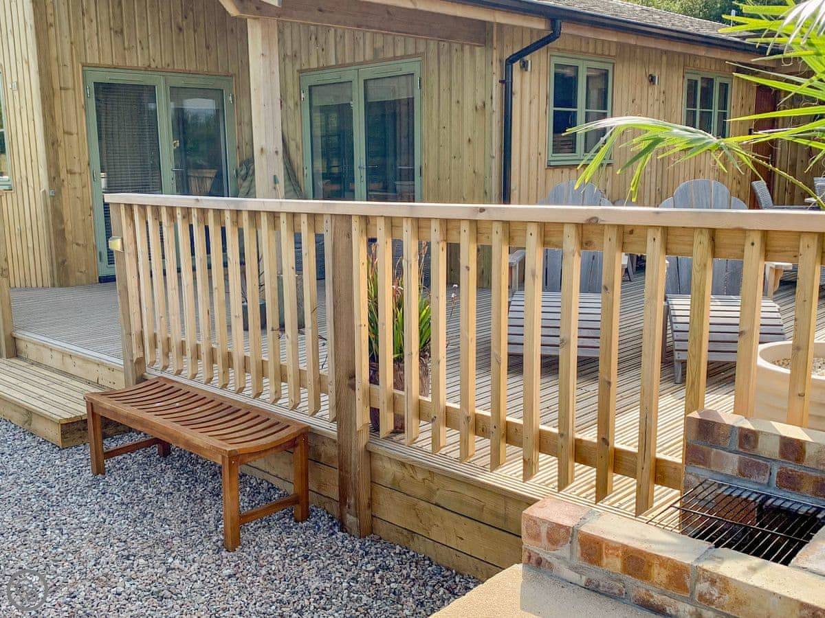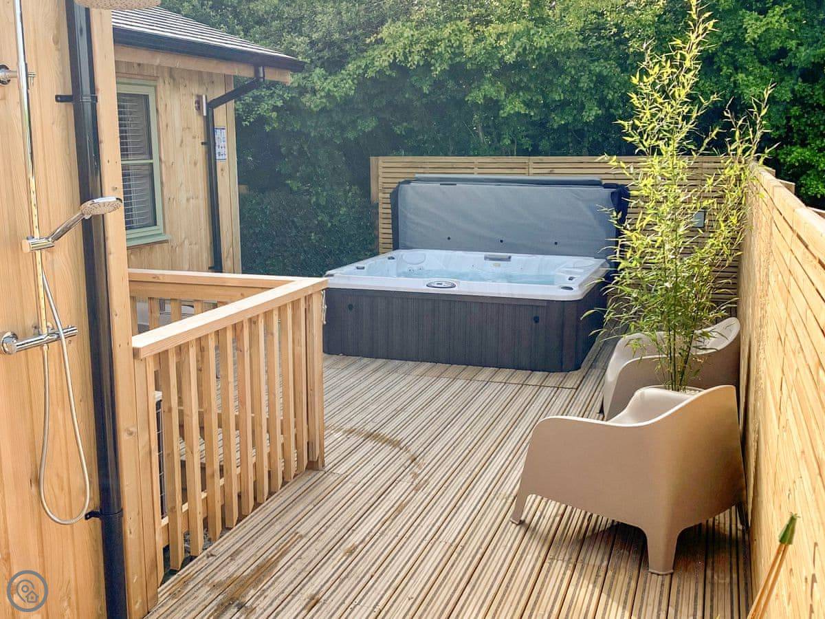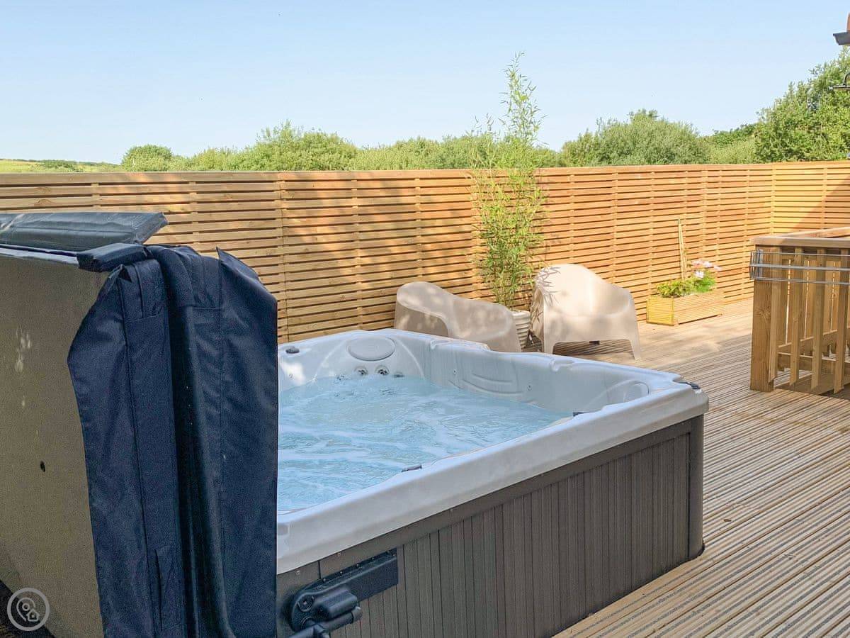 Outside, there's a deck with garden furniture and a built-in barbecue. The garden is enclosed with a solid fence and gate. There's an outside shower, which is good for washing off sand. It's not fancy, just practical. There's a hot tub sunk into the deck.