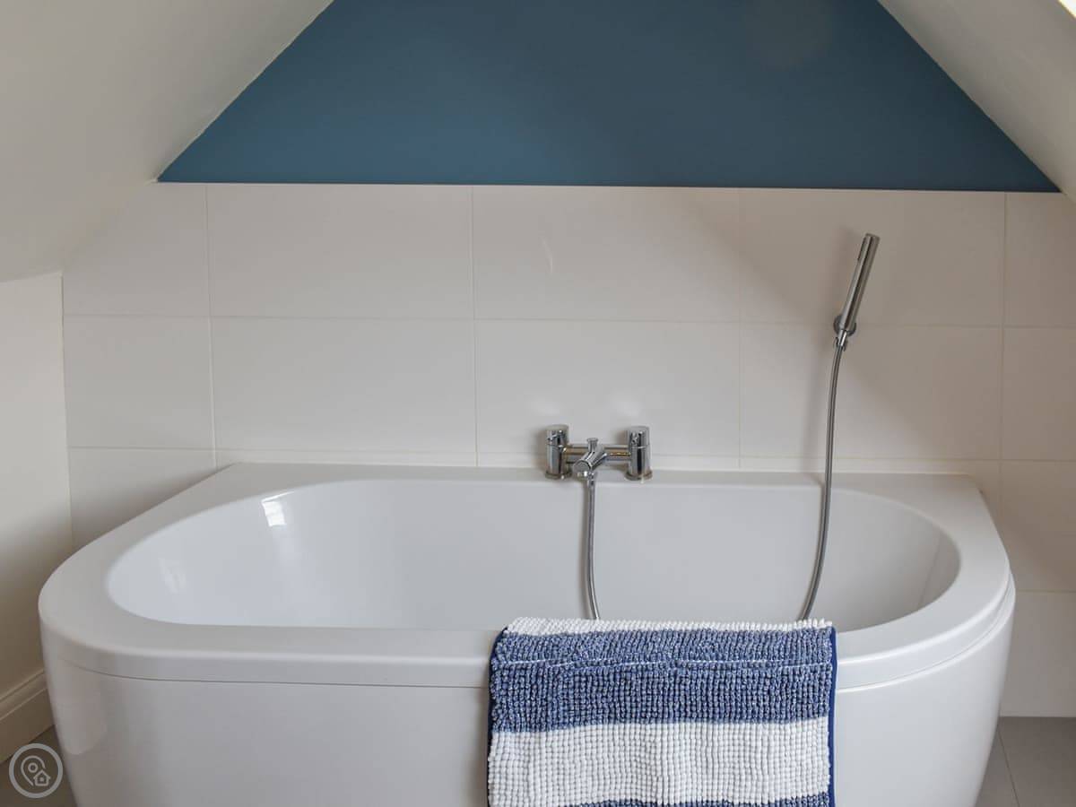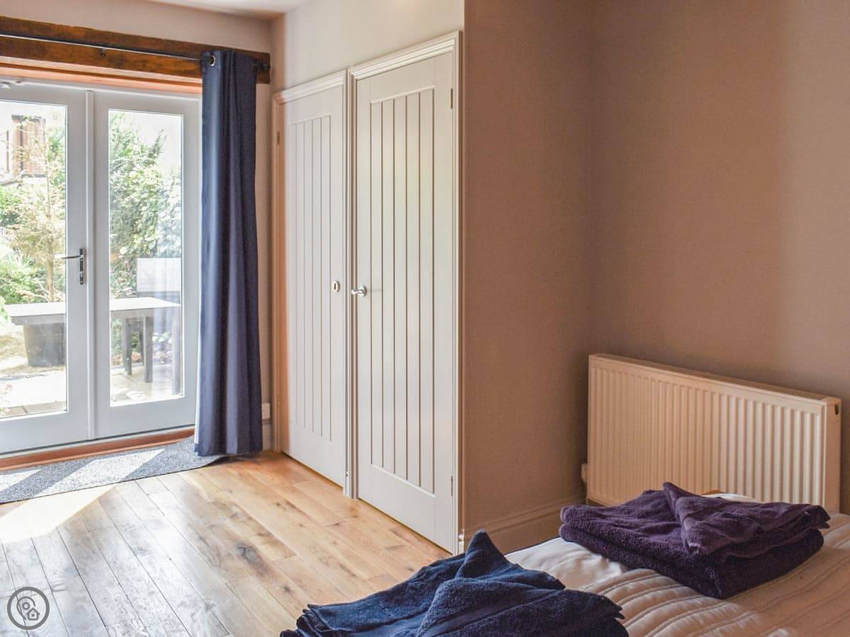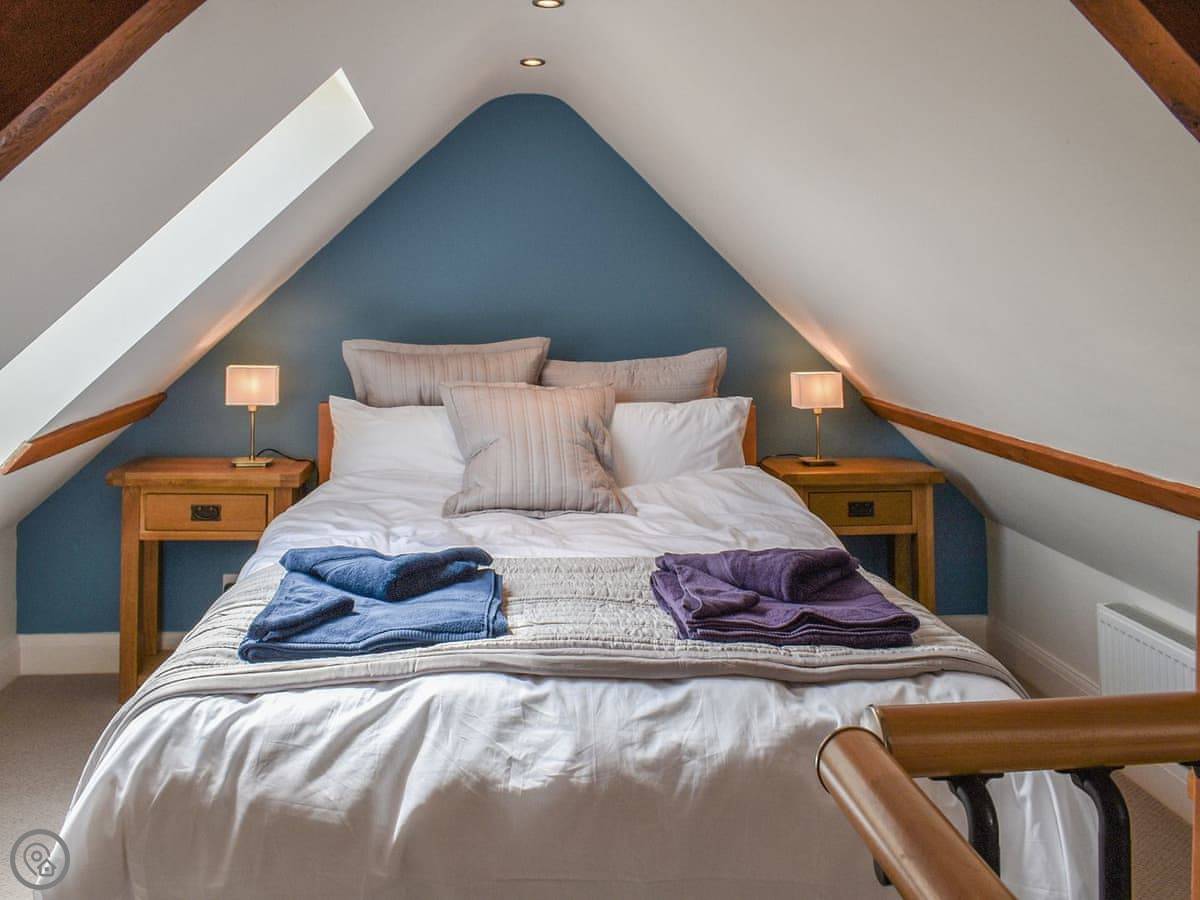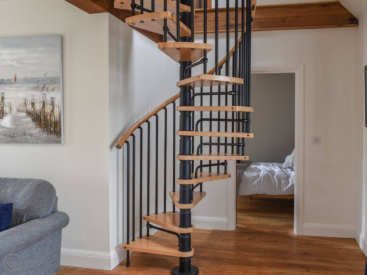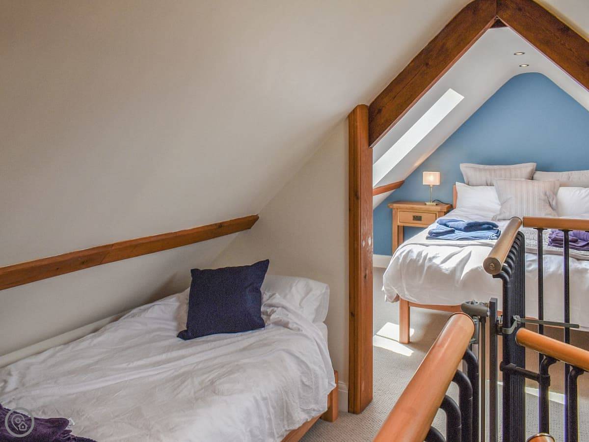 There are two bedrooms and two bathrooms. The main bedroom is downstairs and has its own shower room. Upstairs there's a family room with three single beds and another bathroom. The stairs are steep and narrow, like in a lot of old barns, but there's a handrail.