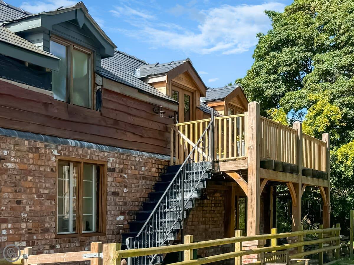 The Red House is in Stapeley, near Minsterley. It's a first-floor apartment for two people. You get your own balcony with a couple of chairs. The view from it is good, especially at sunrise.