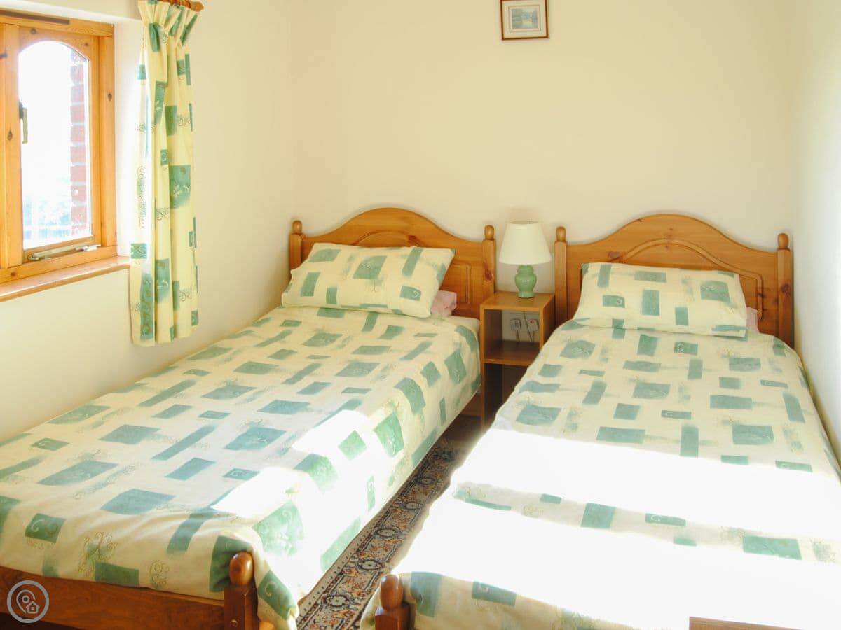It sleeps six. Three bedrooms, one bathroom. It's got a 3 Star rating, so it's comfortable and clean. The farm is small, organic. We've got cattle and sheep. You'll see the animals about. There's about 15 acres of woodland valley you can walk in, with a nature trail. It's quiet here, away from the main farm traffic.