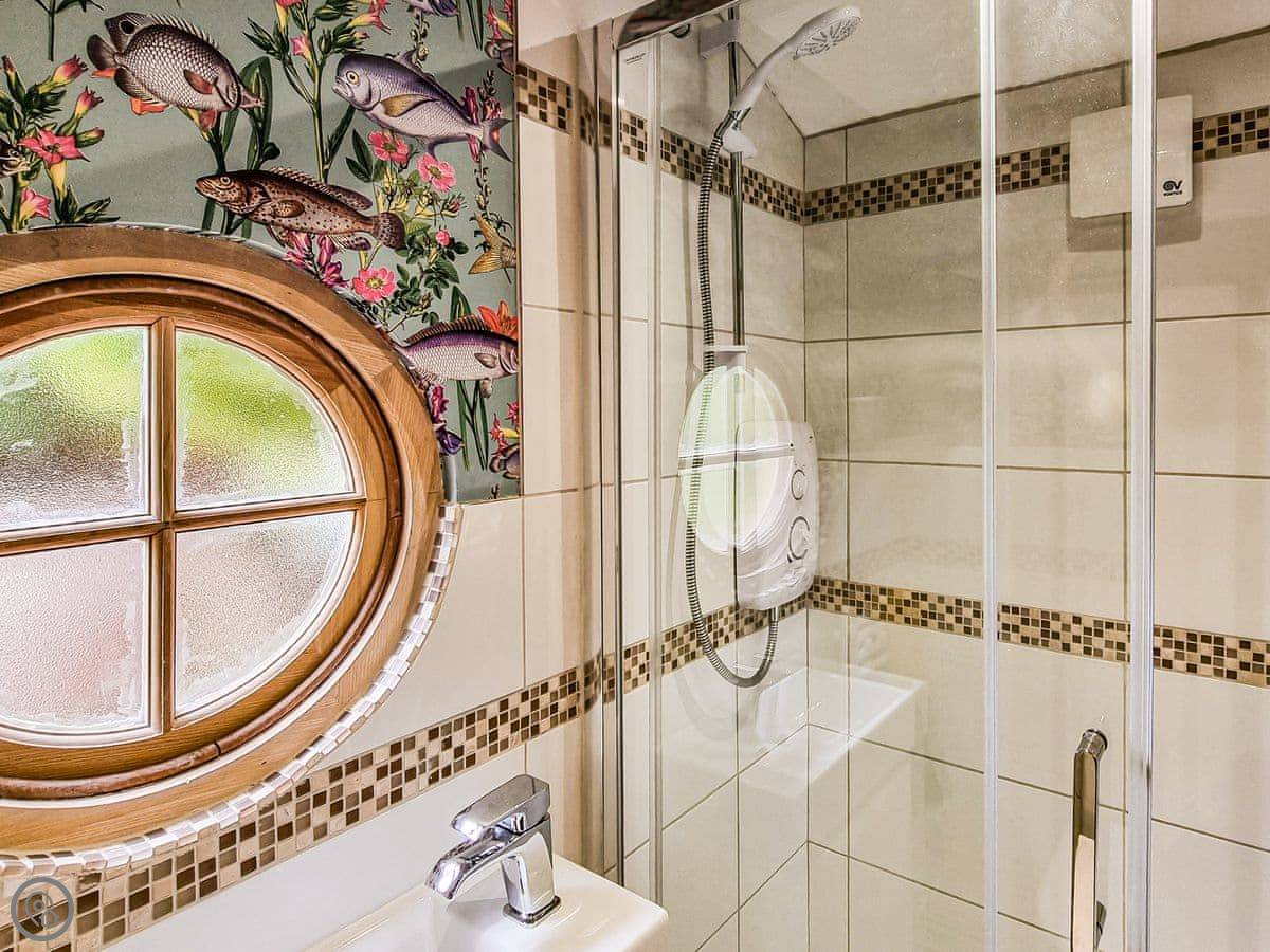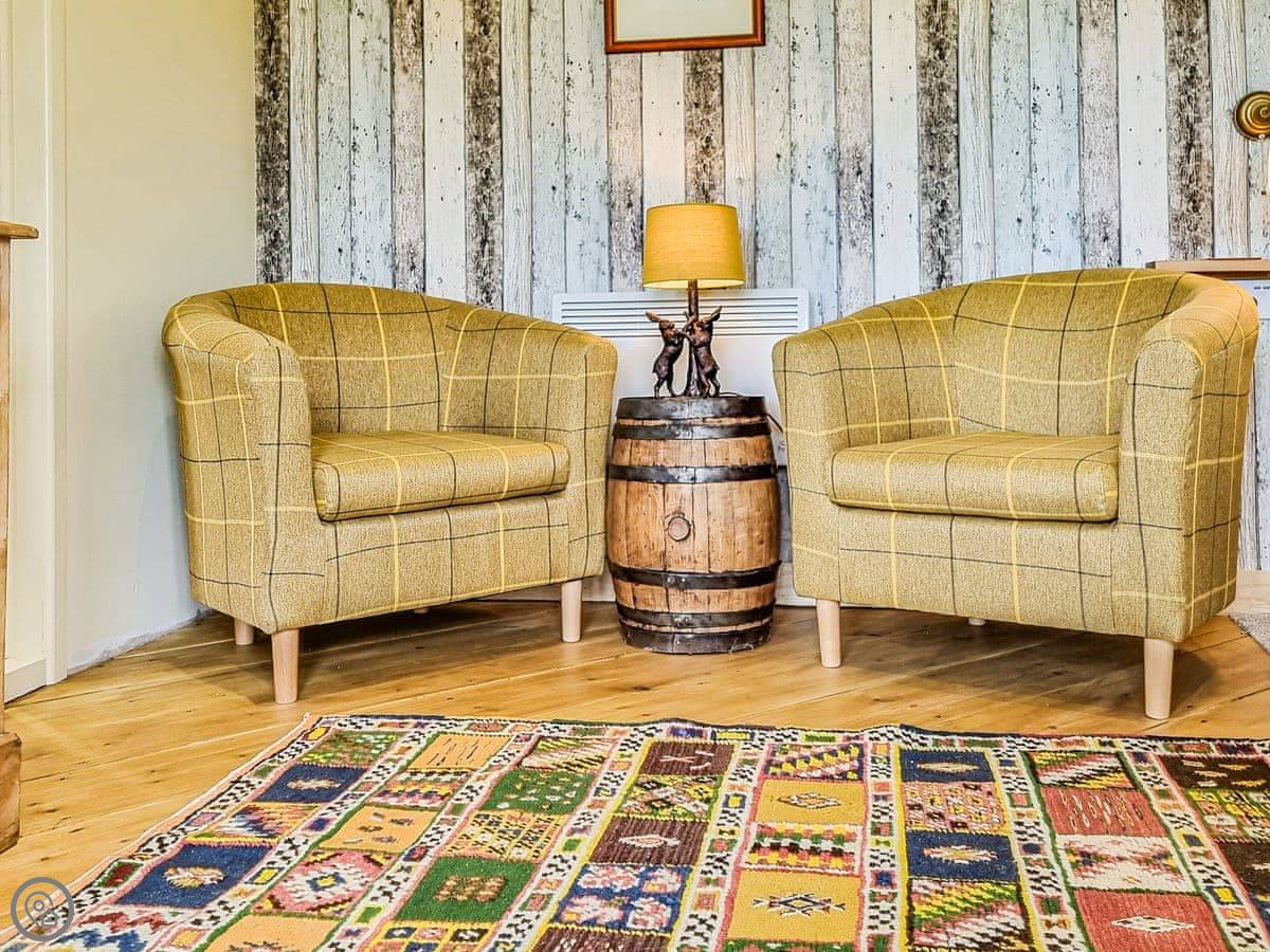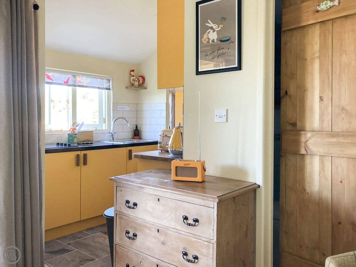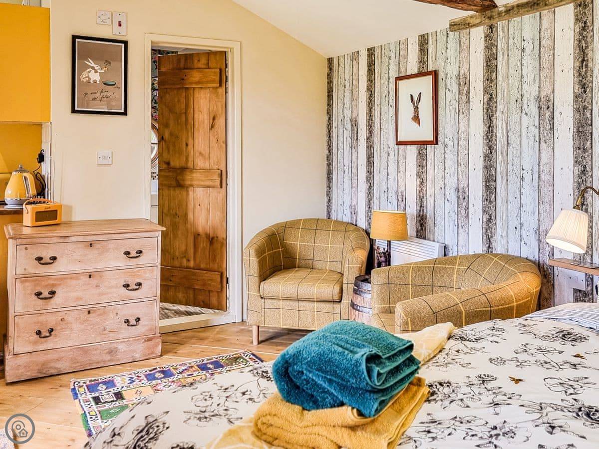 The comfortable kingsized bed has views from the window to the Tor. Off the living area is your shower room with a large shower and heated towel rail. Open the French doors to your covered veranda area which has a bistro set and is the perfect spot for a leisurely breakfast or a sundowner after a day exploring the area, the veranda leads to you good sized lawned garden which has a further seating area and a firepit to enjoy while you soak in the views and gaze at the stars, with no light pollution here it’s the ideal place to lay back and relax under the dark skies.