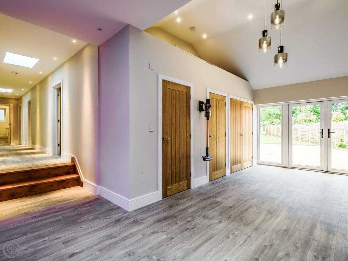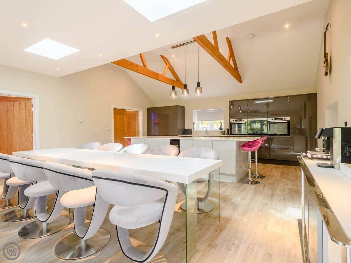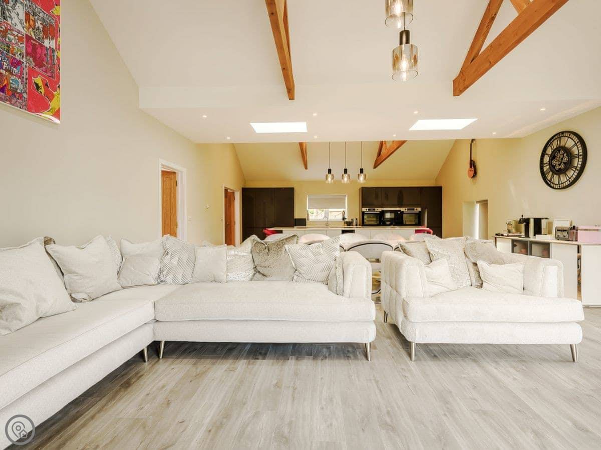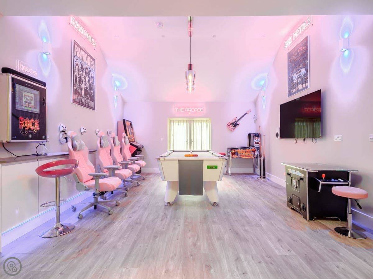 The main thing is the space. It's open plan downstairs, good for a big group. There's a games room as well. Outside, there's an enclosed garden and a patio area with a hot tub.