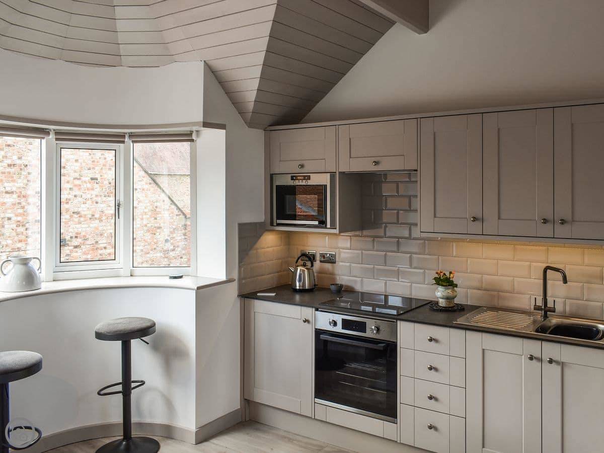 The Turret has recently been renovated to a high standard and has been stylishly decorated and furnished by the owner offering you a luxurious stay. The Turret overlooks the pretty market place, which is packed full of independent shops, cafés, pubs, and fine dining right on your doorstep. The Turret offers couples a perfect holiday retreat whilst being ideally located to explore all that Yorkshire has to offer, with free on-road parking available. The living and bedroom space is open plan throughout with exception to the lovely bathroom which presents a shower cubicle. The property has a fully equipped kitchen for all your culinary needs along with a cosy sitting area which boasts a comfortable sofa bed for additional sleeping and Smart TV, a great place to kick back and relax in after a day’s adventure. A real feature to the property is the curved window which the owner has made into a stunning little breakfast area, a great place to sit and watch the world pass by whilst having breakfast or a glass of fizz in the evening. Withing the open plan area is also a plush double bed with fresh linen guaranteeing a perfect night’s sleep.