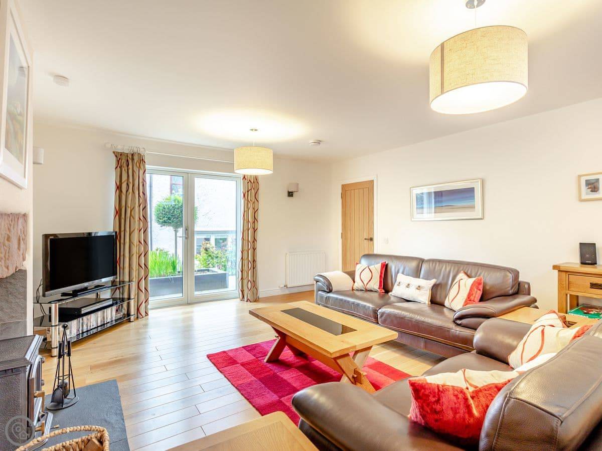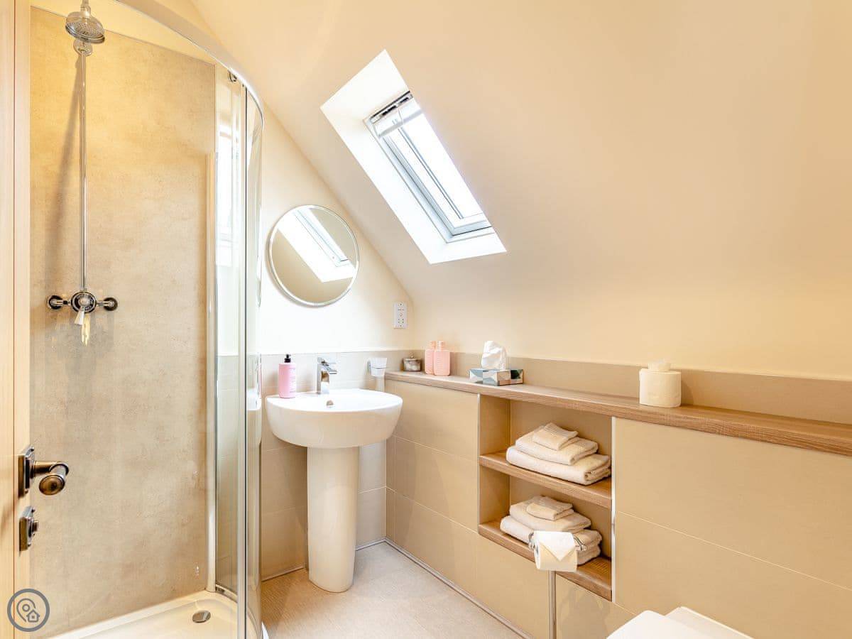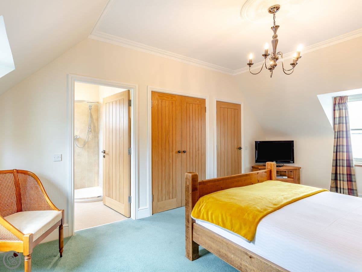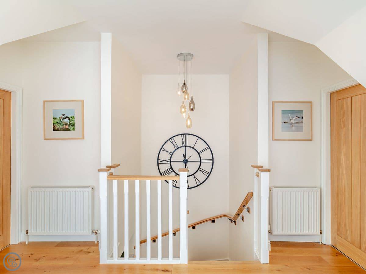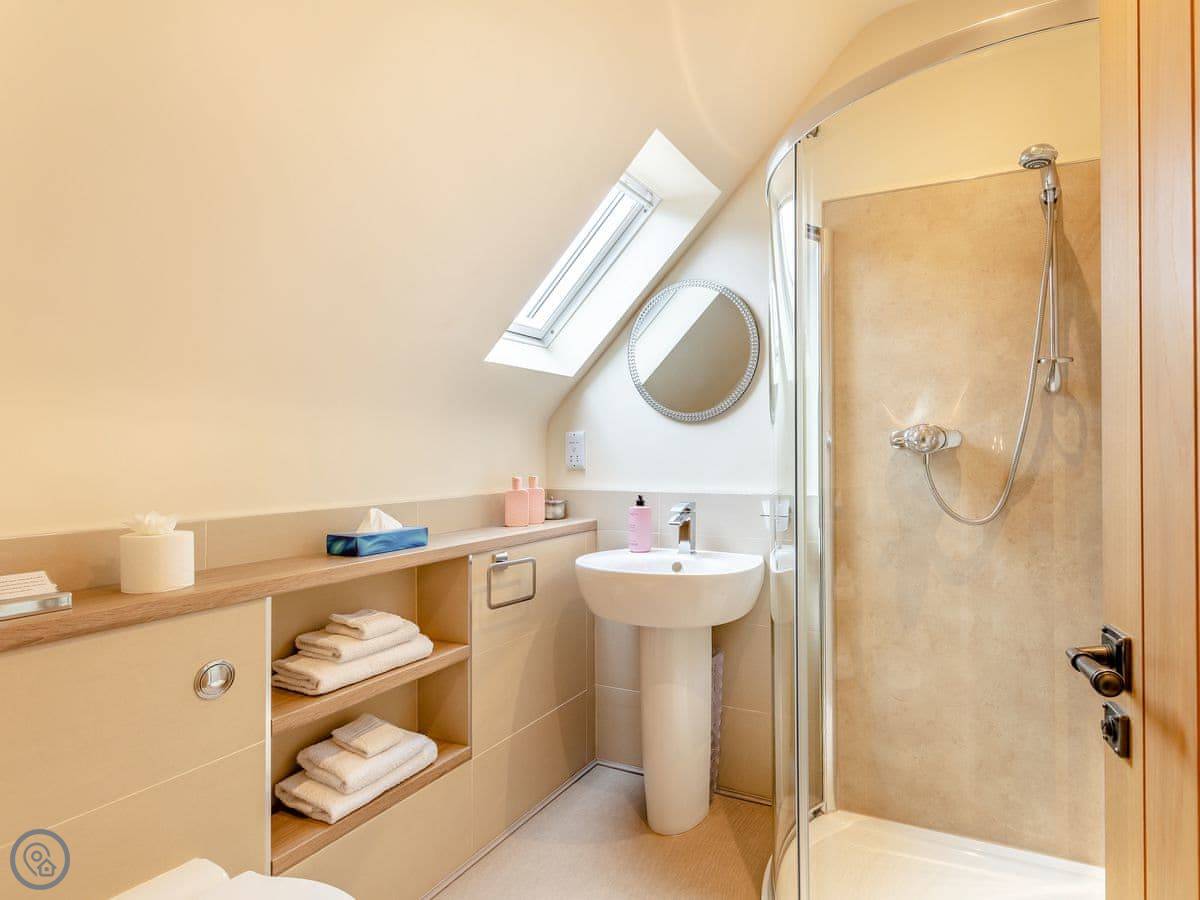 It sleeps four. Two bedrooms, both with their own shower rooms. There's also a bathroom downstairs with a bath. It's got a 5 Star rating, which means it's well-finished and has everything you'd need. The stairs are a standard flight.