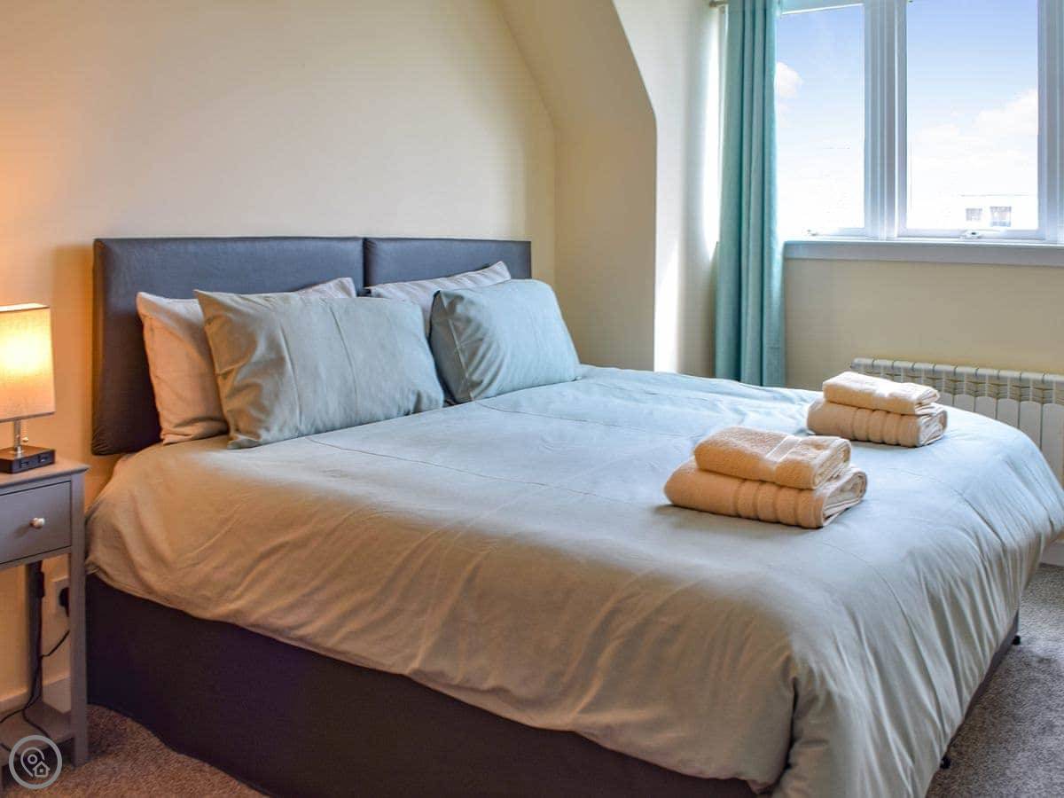 It sleeps four people. Two bedrooms upstairs. One has a kingsize bed, the other has a super kingsize that can be split into two singles if you need it. The stairs are normal.