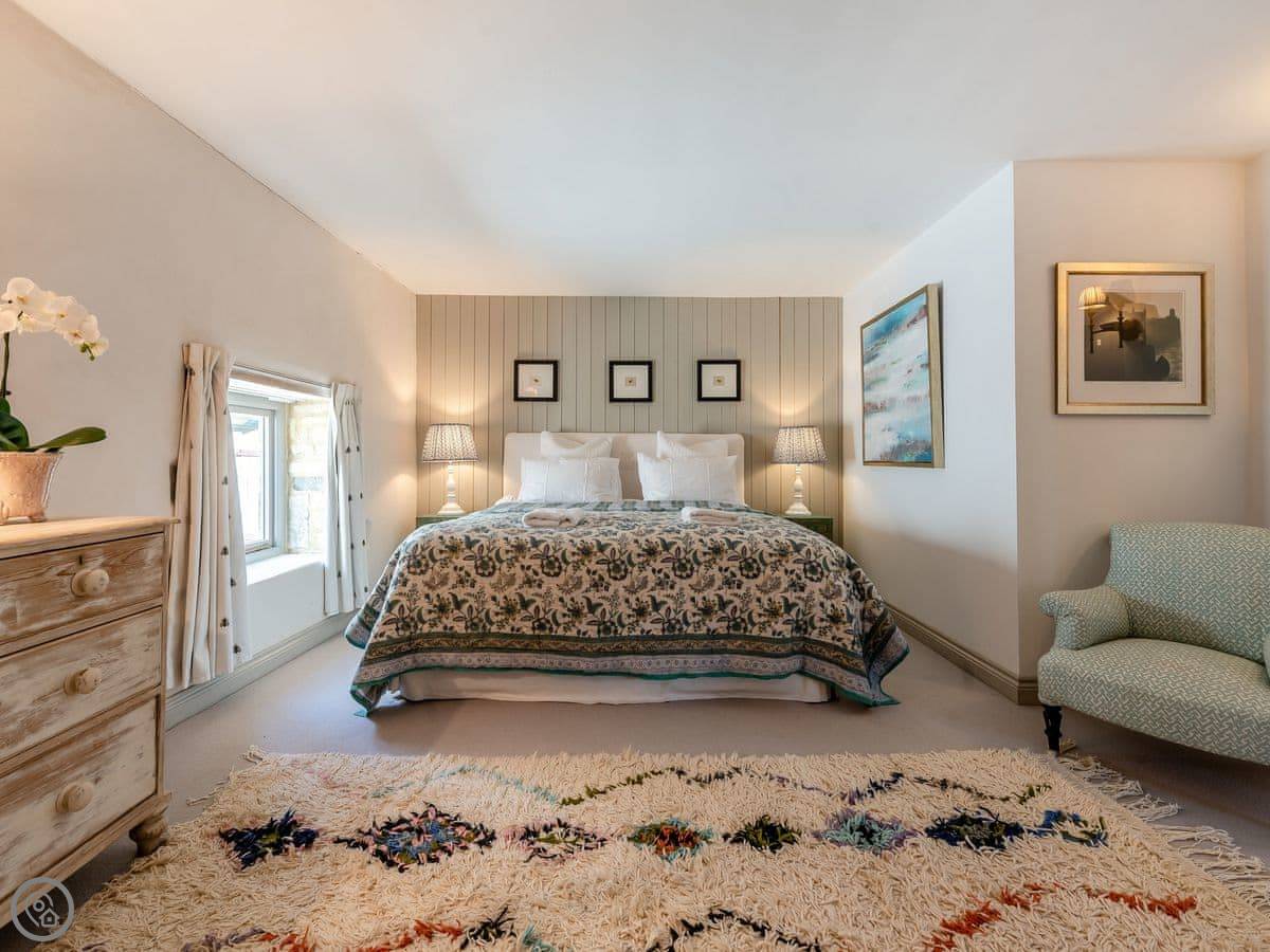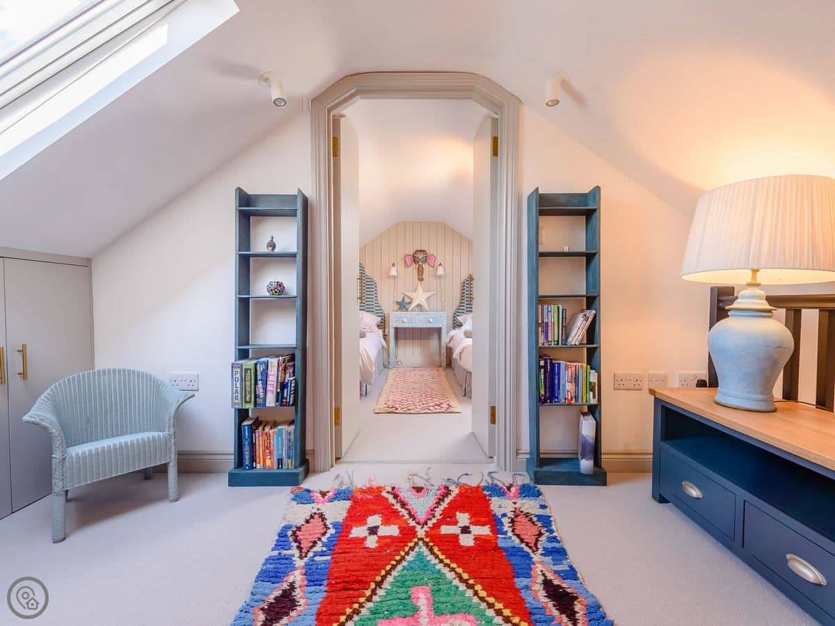 It sleeps four. Two bedrooms. One's on the ground floor, and the other's up on a mezzanine level, which you get to from stairs in the living room. There's one bathroom, also on the ground floor.