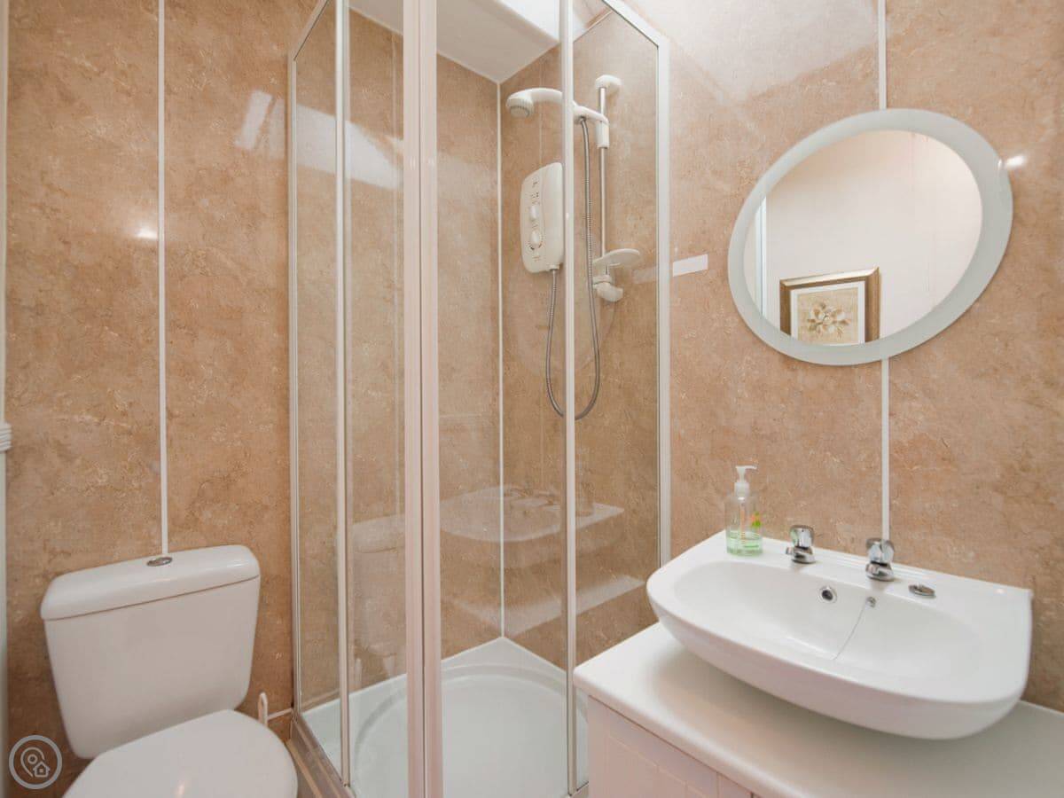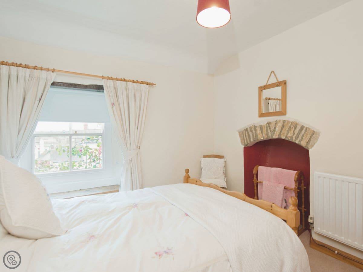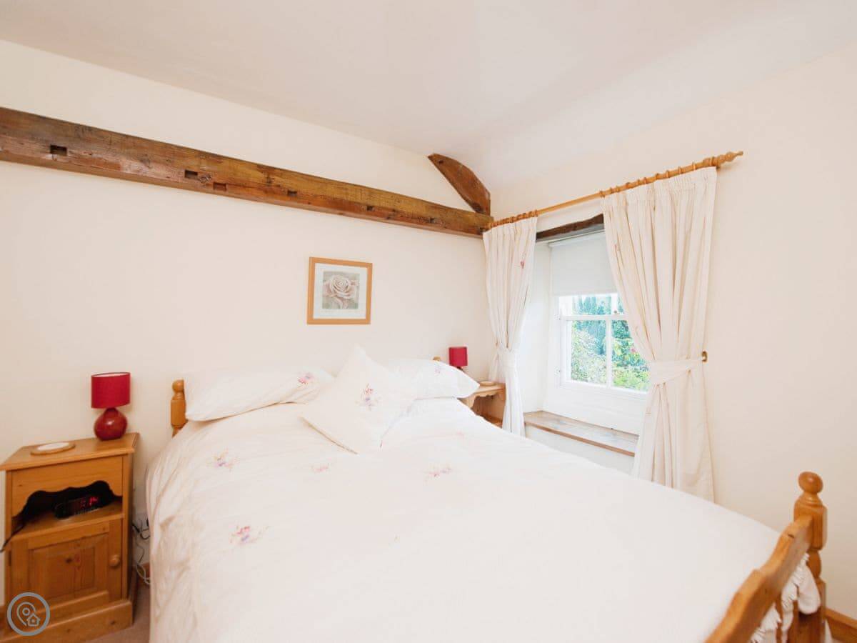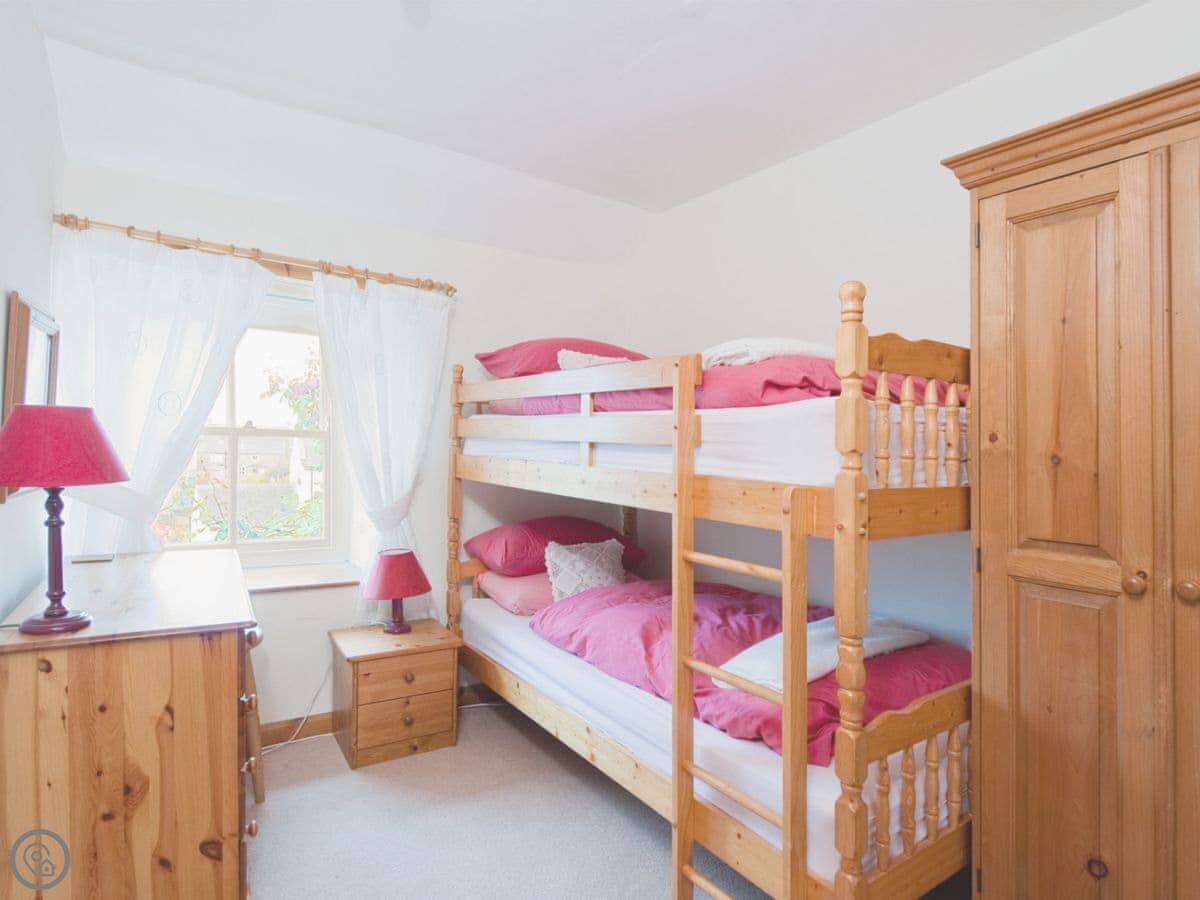 A dining table and chairs are positioned to the rear of the room. Going through to the kitchen, all the appliances, crockery, and utensils you need are available to rustle up some cosy meals while staying at Holly Cottage. The characterful staircase from the living room has uneven, deep treads with a rope banister to guide you up towards the two bedrooms. Both rooms offer comfortable beds, one being a double, the other offering bunk beds suitable for children with attractive quality linen and hand and bath towels available for each Guest. The compact shower room has a shower cubicle with a deep step in/out, toilet, sink and heated towel rail.
