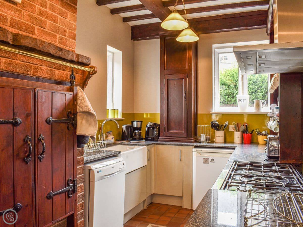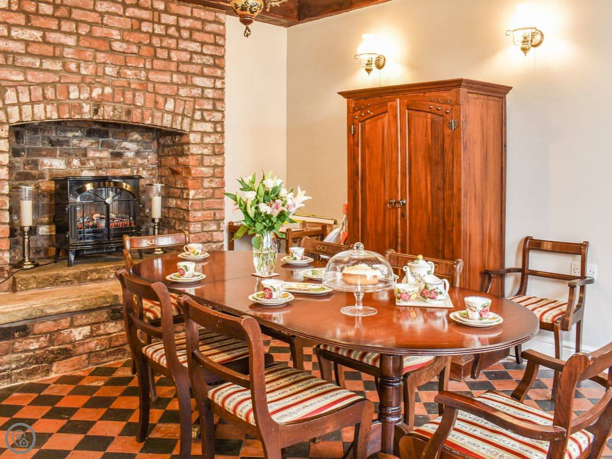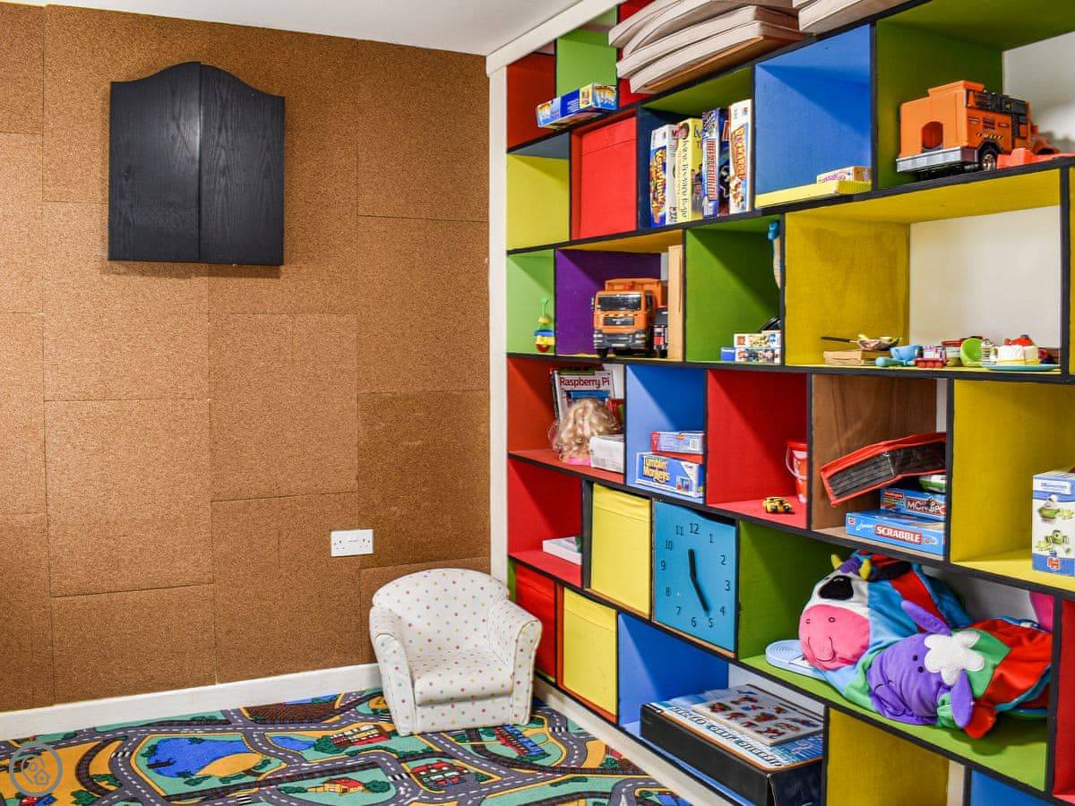 Inside, there's a lot of space. Two big sitting rooms, one with an open fire. The kitchen has a range cooker with seven hobs. The dining room seats eight comfortably. Off the courtyard there's a brightly painted playroom full of toys for kids, and a utility room with a washing machine, tumble dryer, and a big fridge-freezer.
