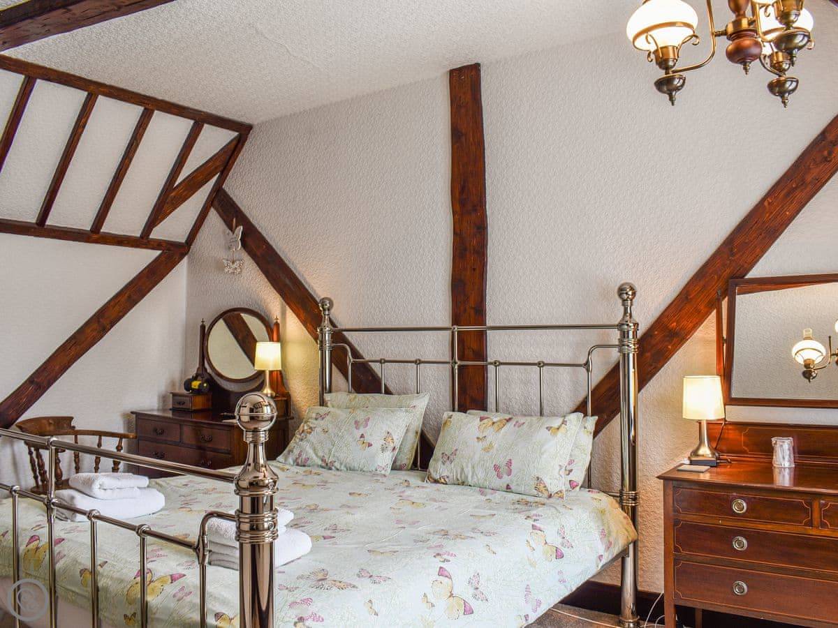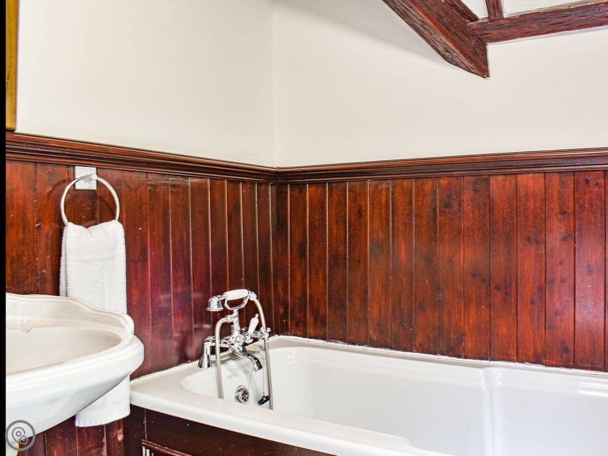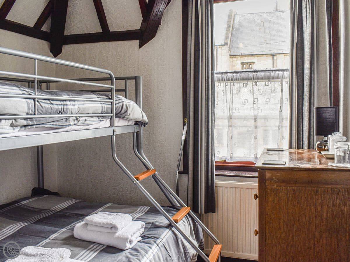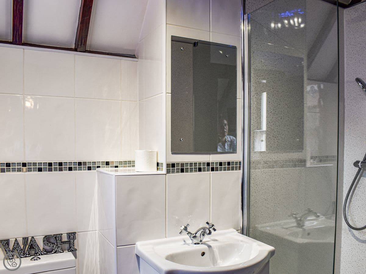 It's got four bedrooms. Two are doubles, one is a twin, and one has a bunk bed with a double on the bottom. There are three bathrooms. One is a wet room downstairs by the playroom, and there are two more family bathrooms upstairs, one with a bath and one with a walk-in shower.