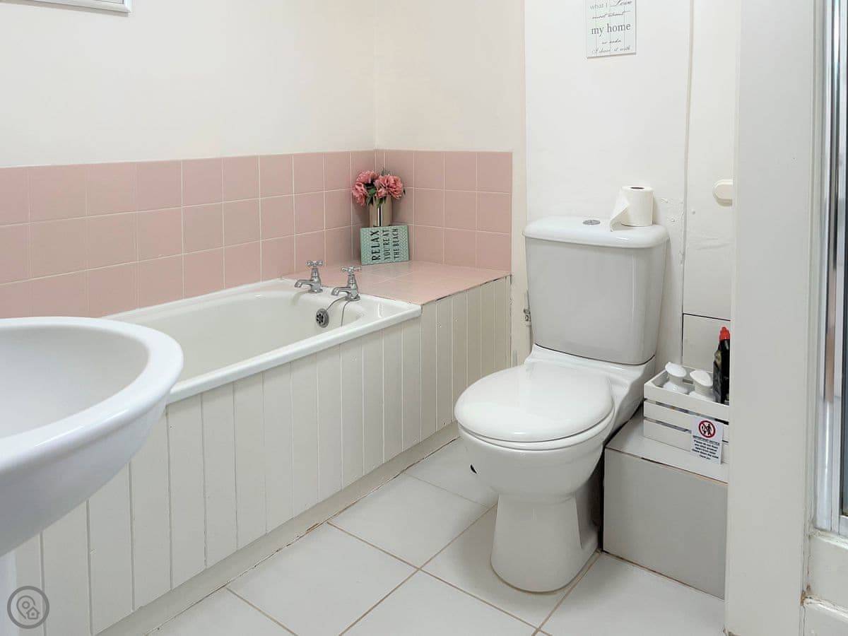The front door has four steps leading down to the fully enclosed south-facing garden which has a small lawn, garden furniture and a parasol. Discover the two cosy bedrooms, the first with a double bed and the other with twin beds. The family bathroom is fitted with a bath, shower cubicle, toilet and sink, offering the choice of a refreshing shower or a relaxing bath after a busy day exploring Devon.