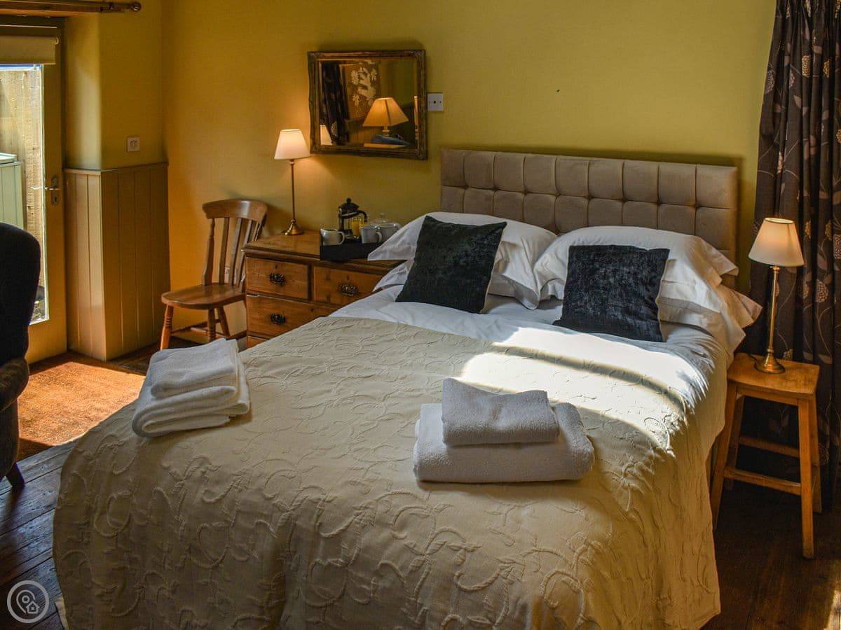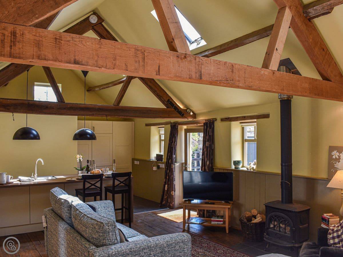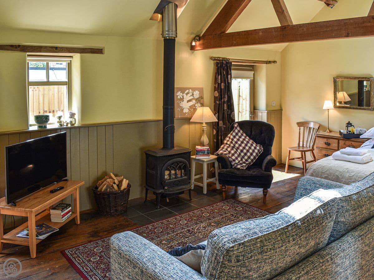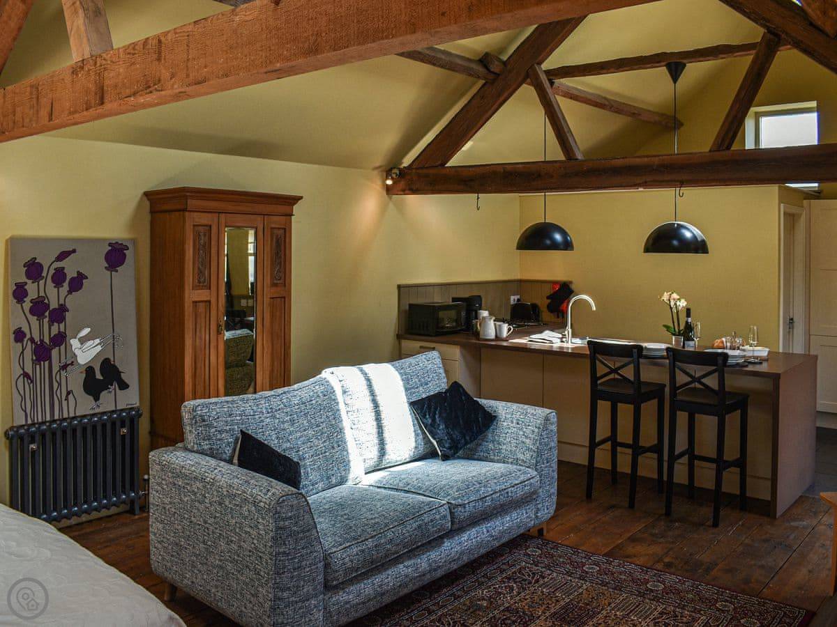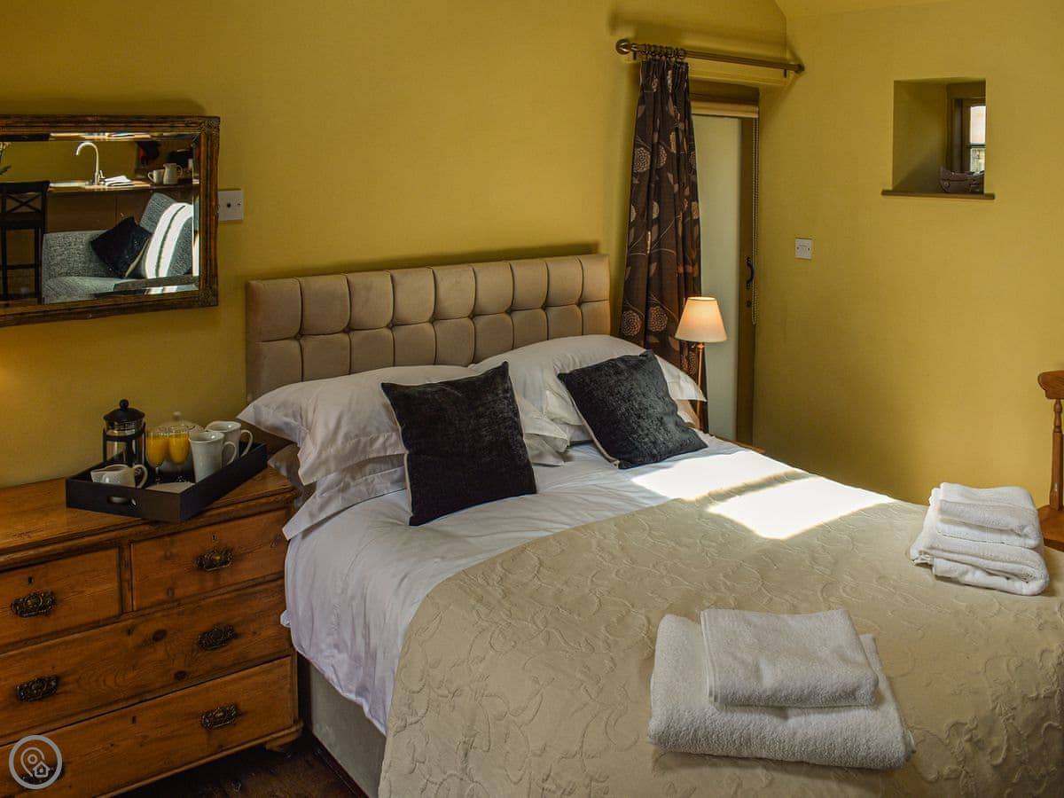 You enter the property into the open plan living/kitchen area. The kitchen is well equipped and well-presented and has all the necessities should you not want to dine out at the many restaurants close by. The living area has a comfortable sofa which is great to snuggle up on in front of the fabulous wood burner on those colder evenings. The property is open plan throughout except for the separate bathroom which offers a shower over the bath and heated towel rail. Towards the back of the property is a plush double bed with cosy linen guaranteeing a perfect night’s sleep after exploring this stunning area. To the side of the property, you also have a lovely little patio area with garden furniture giving you a great place to sit back and relax whilst enjoying a well-deserved glass of fizz. The Byre has plenty of character and has been lovingly decorated and furnished with exposed beams throughout giving you that lovely country home feeling.