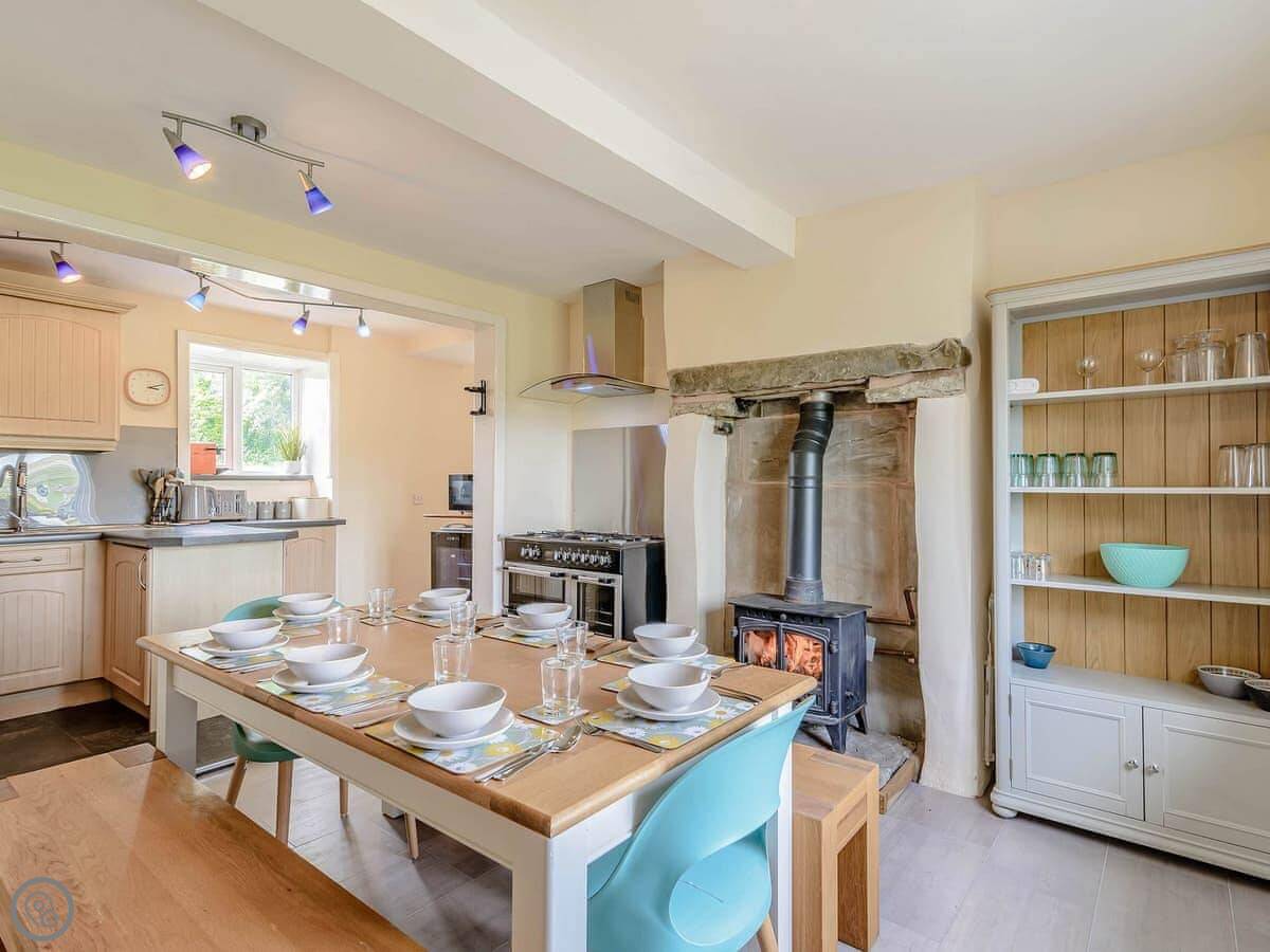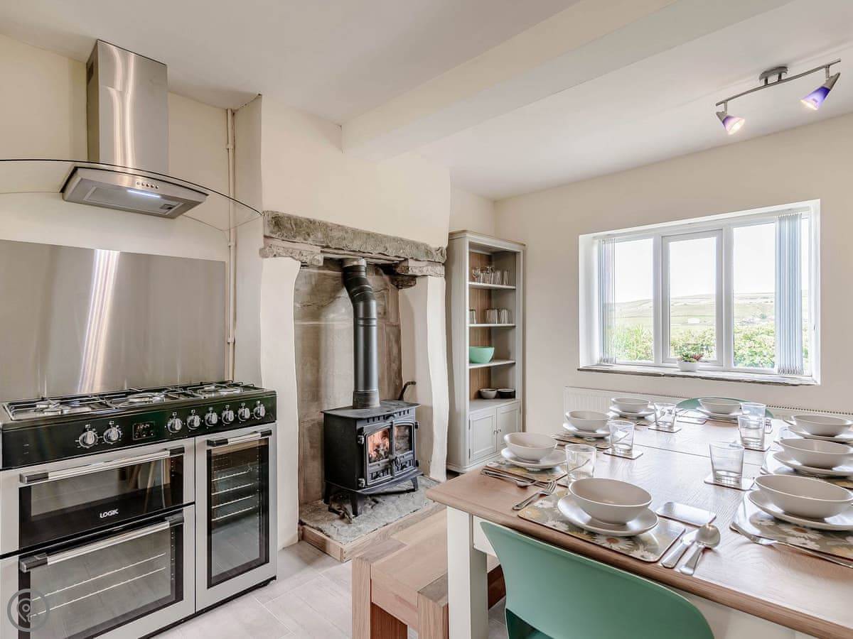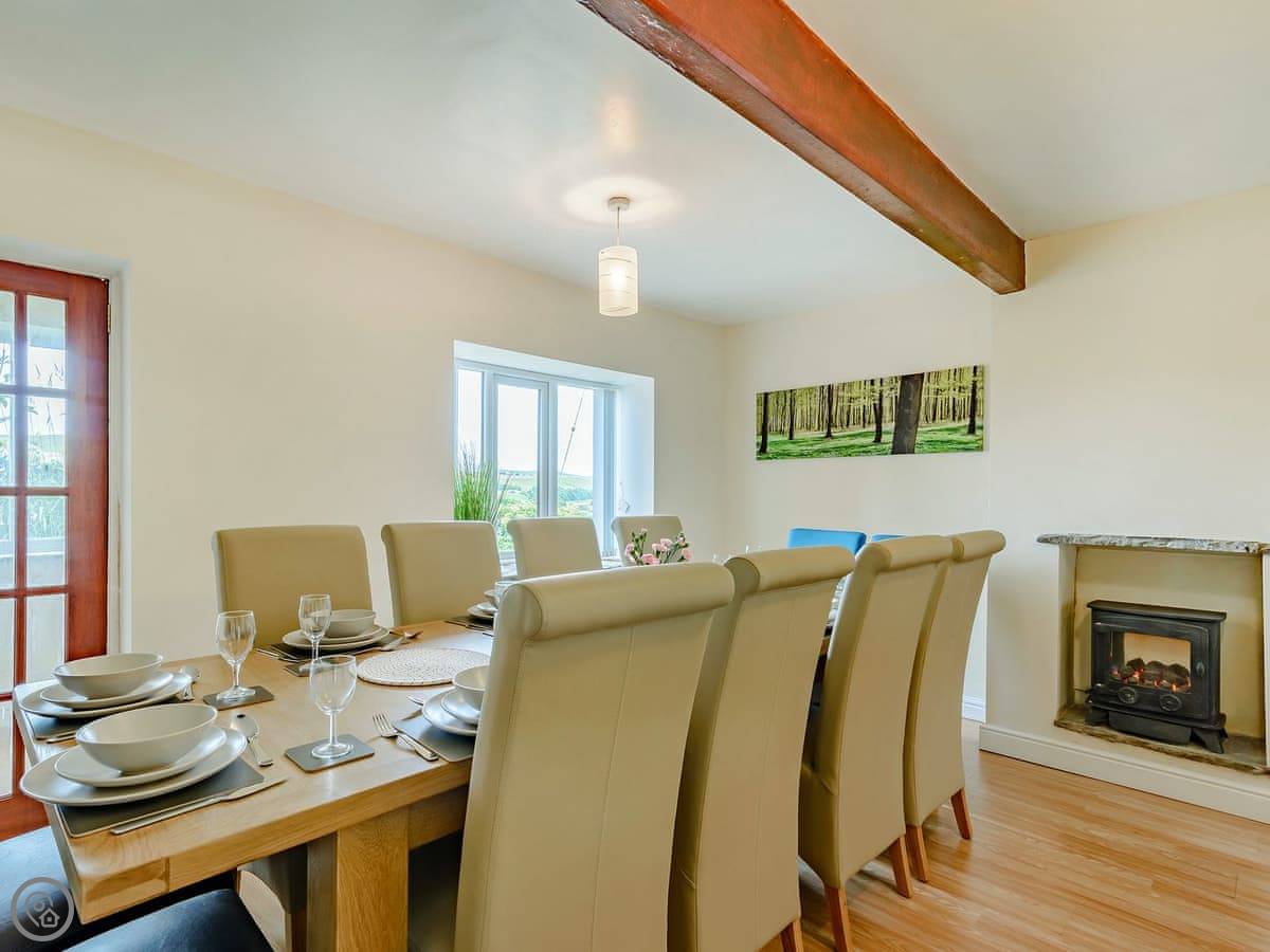 Downstairs, there's a living room with a wood burner. We leave logs for you. The kitchen is large and has a dishwasher. There's a big dining table that seats everyone. The utility room has a washing machine and space for boots and coats.