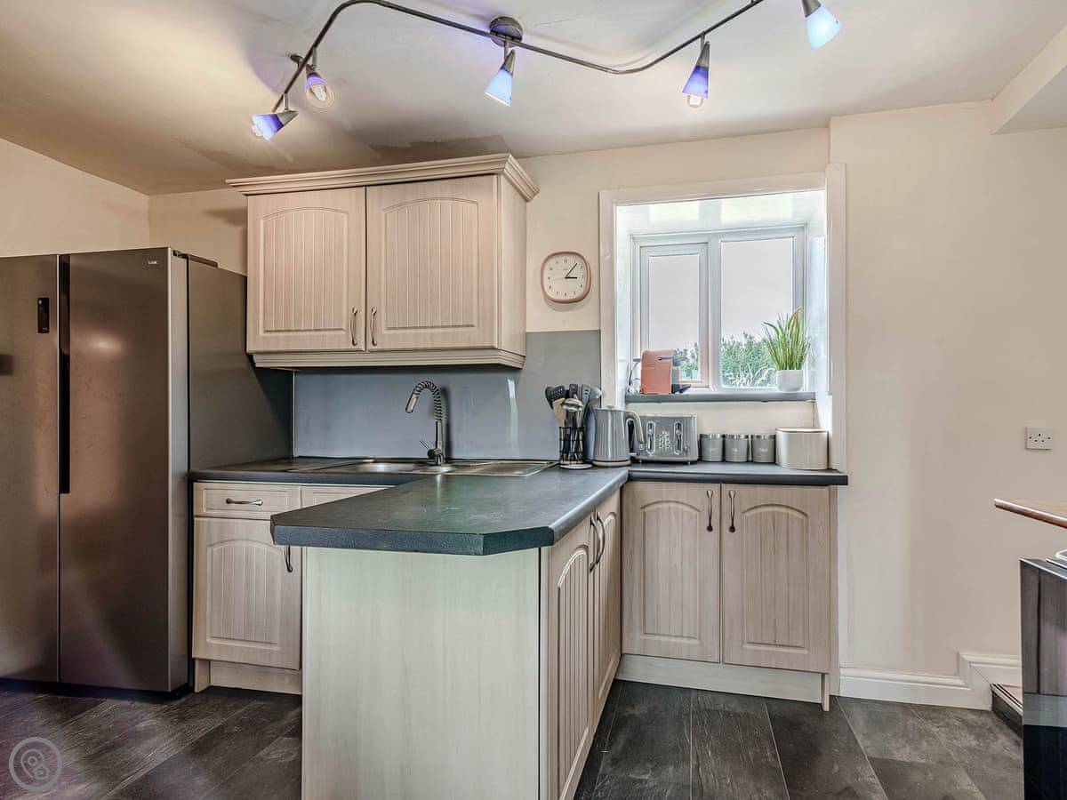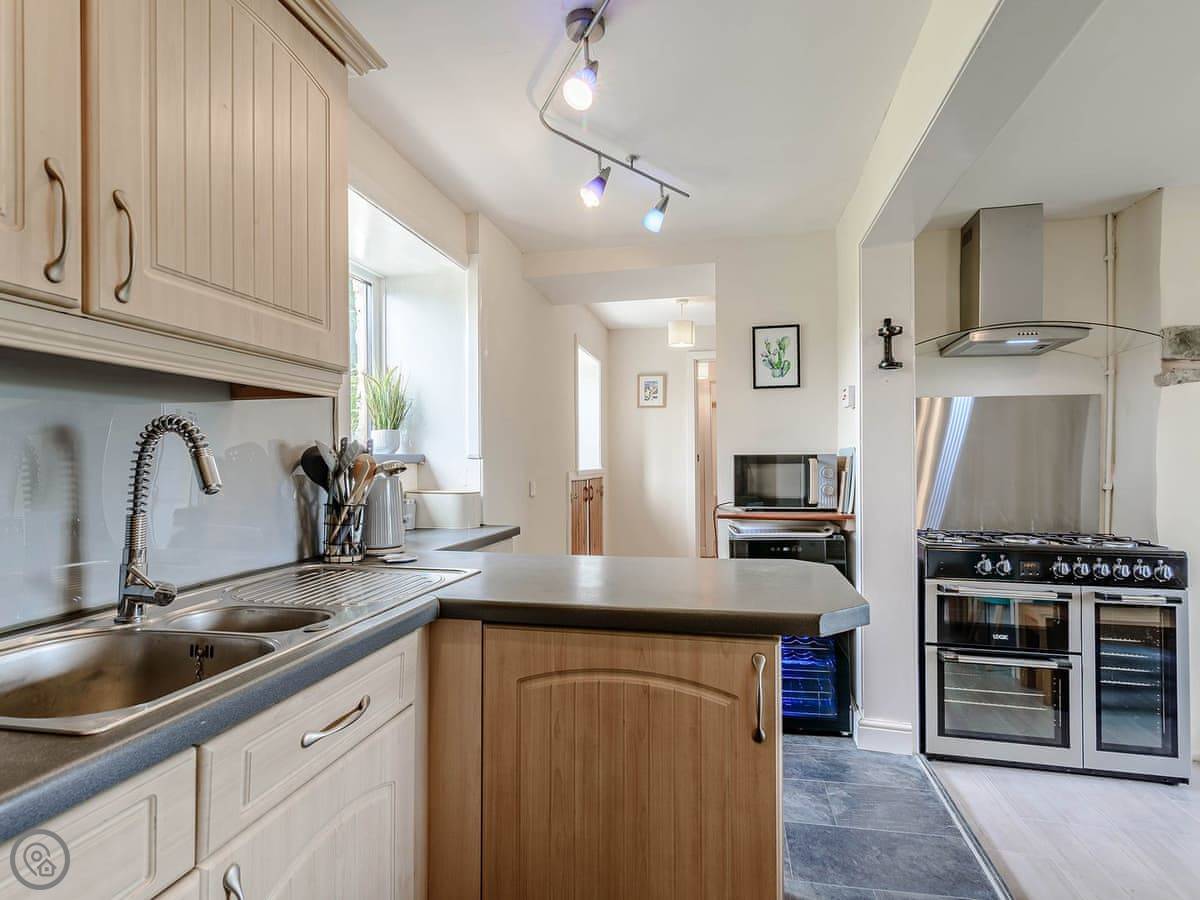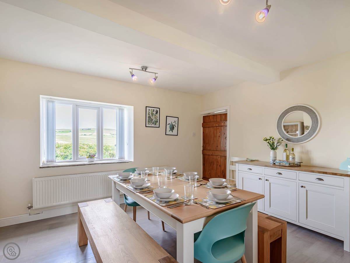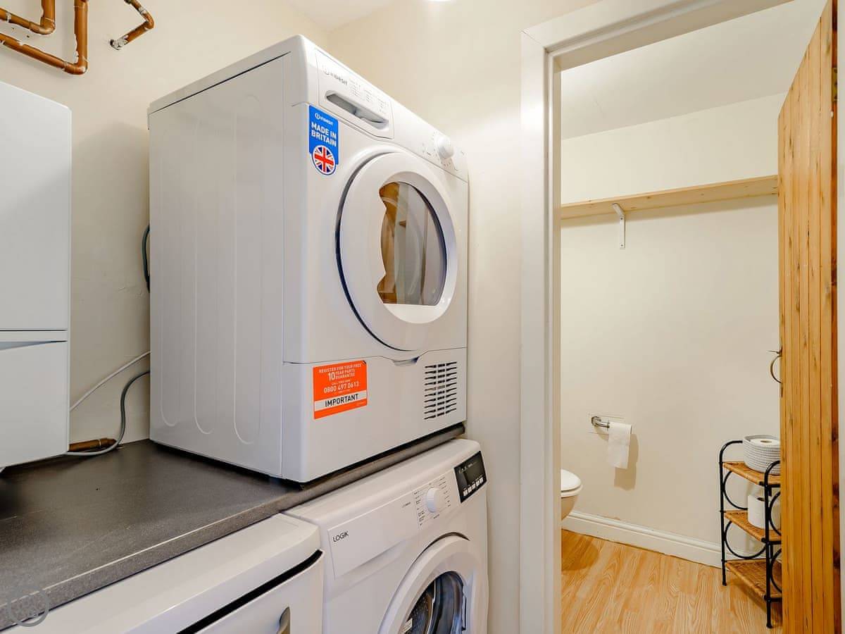Downstairs, there's a living room with a wood burner. We leave logs for you. The kitchen is large and has a dishwasher. There's a big dining table that seats everyone. The utility room has a washing machine and space for boots and coats.