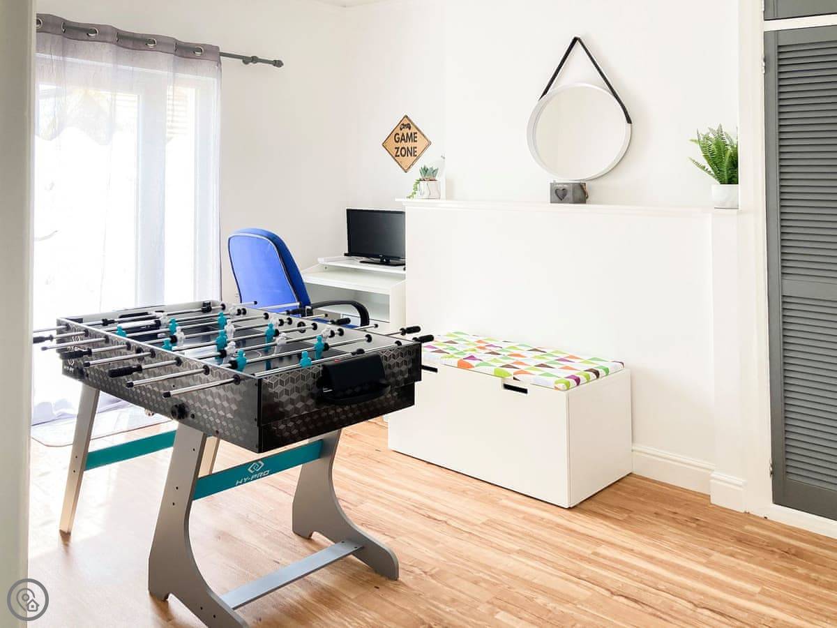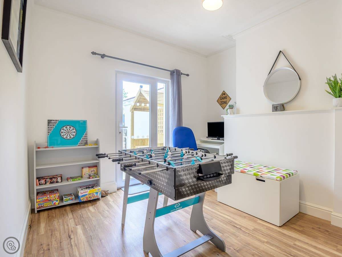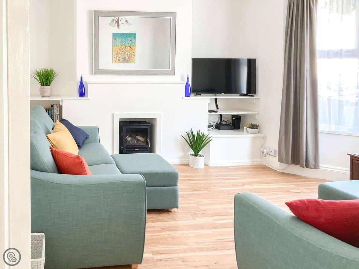 Relax in the living room with two 3-seater sofas, 2 footstools, gather for drinks in the kitchen/dining room that opens out onto the enclosed garden with garden pod while the kids enjoy the games room which also has a desk if you need to work. There are three bedrooms on the first floor, with a Victorian style bathroom. The house benefits from central heating to keep you warm but if you want to feel extra cosy, why not put on the amazing electric log burner. Its amazing steam effects make the fire so realistic so it brings all the pleasure without the hassle of lighting or cleaning up.