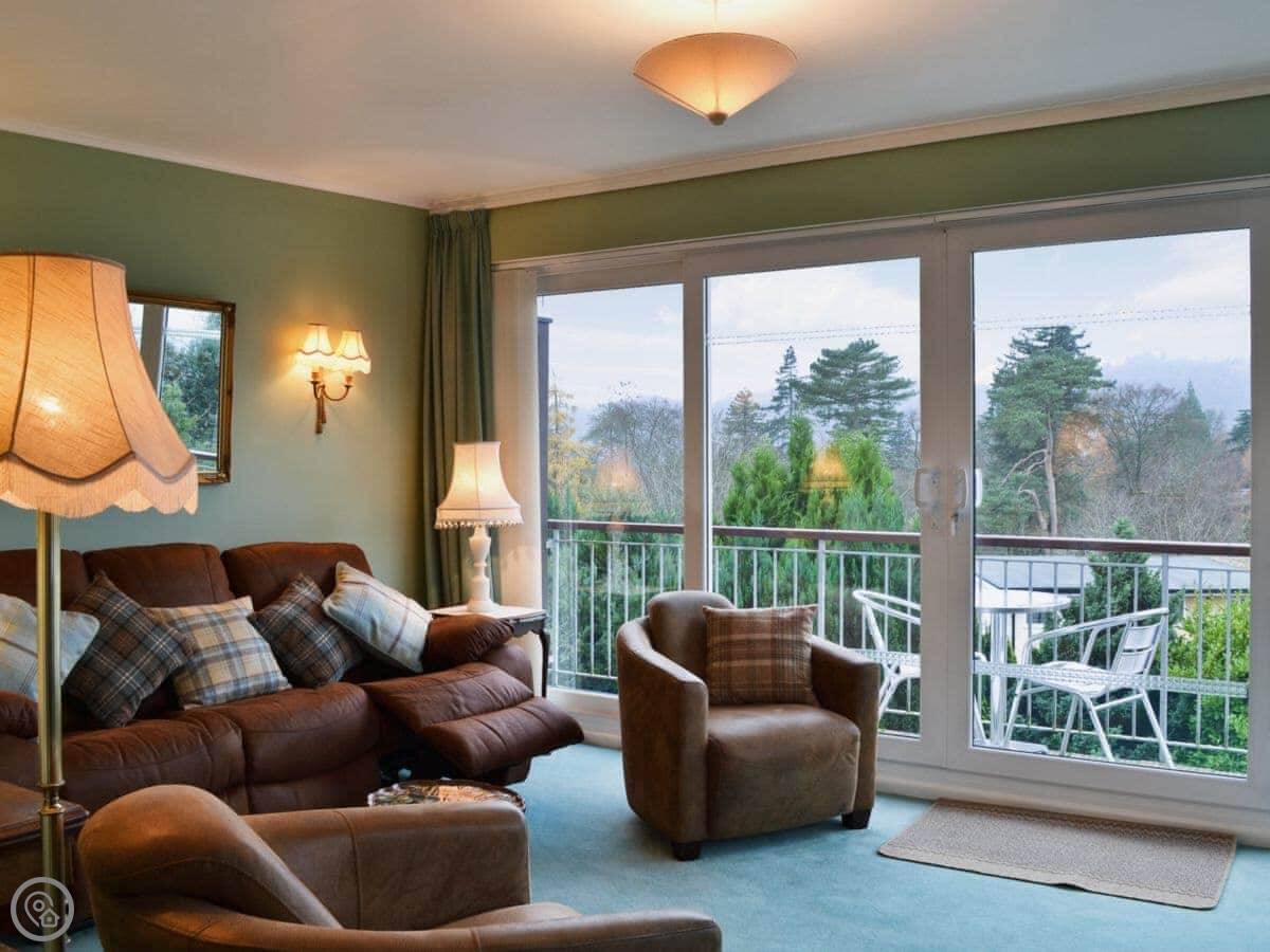 Lake View is in Bowness. It's an apartment in a modern block. The main thing is the view across Lake Windermere. The living room faces southwest, so you get the afternoon sun. There are patio doors out to a small balcony and a big window, both facing the lake.