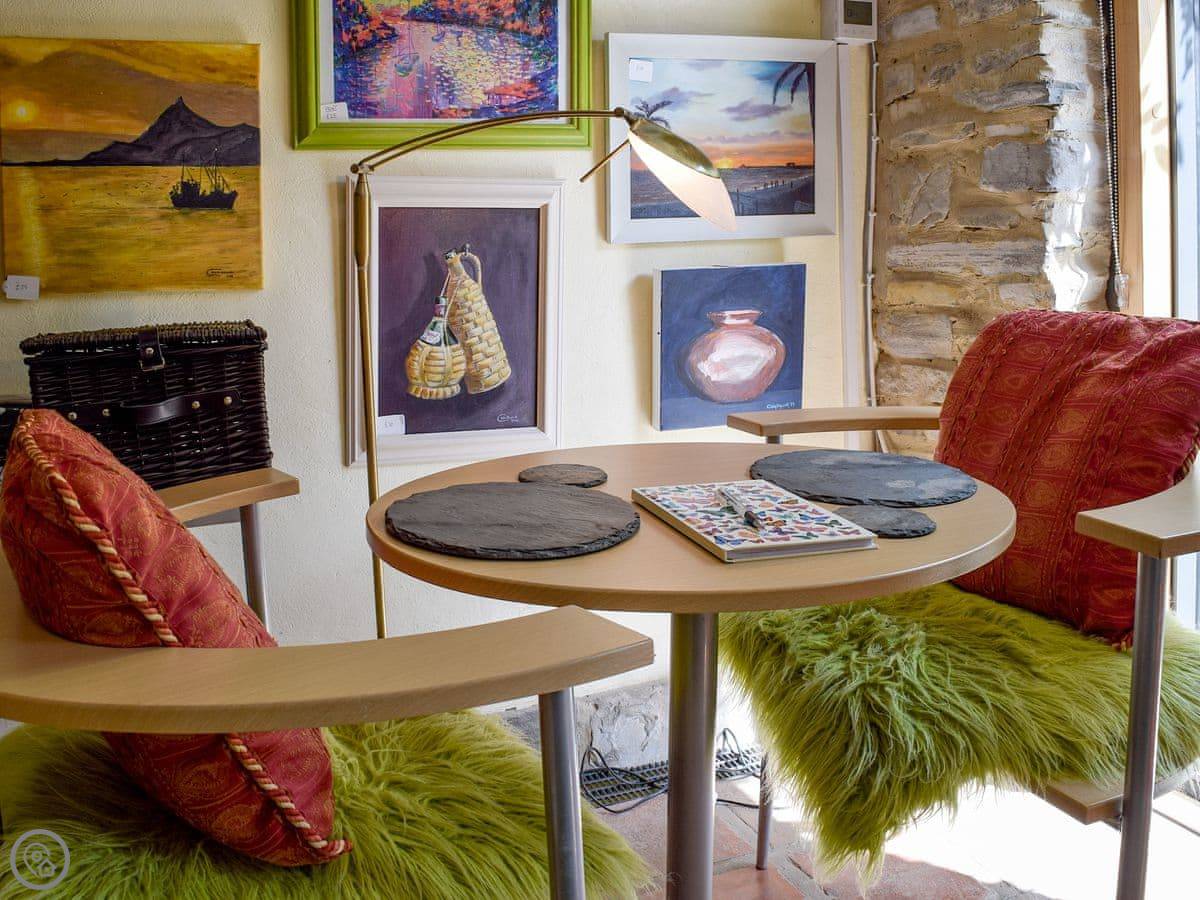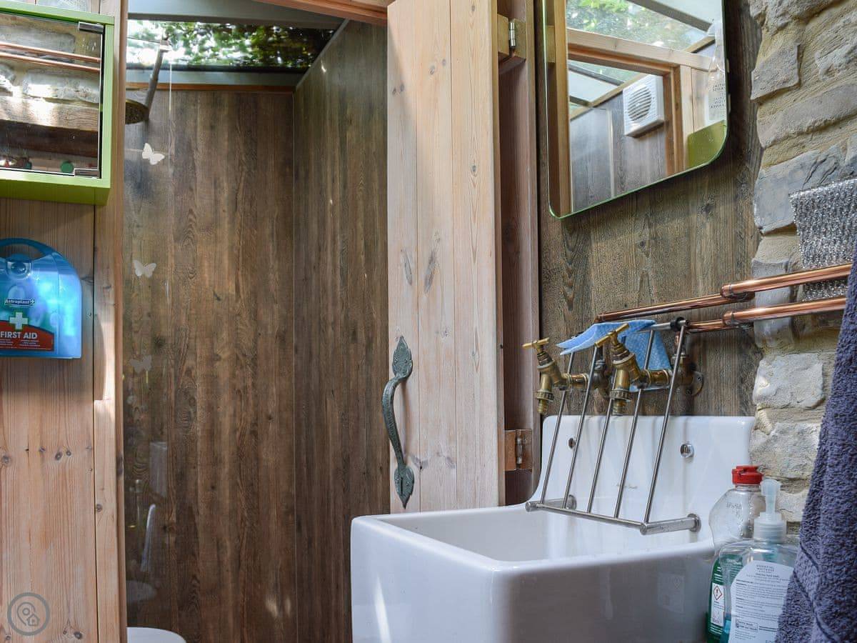 It's a 3 Star place. That means it's clean and has what you need, but it's not luxury. The layout is open plan on the ground floor. There's a kitchen, a dining area, and a living space all in one room. The kitchen has the original manger built into it, which is a nice feature. The shower room is a wet room with a glass ceiling, so it's quite bright.