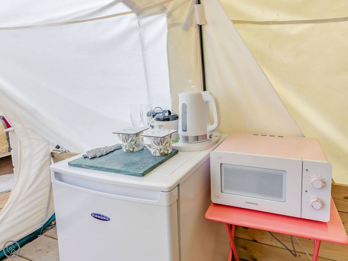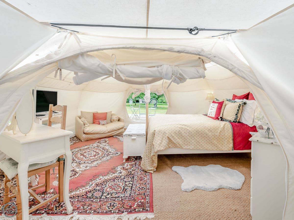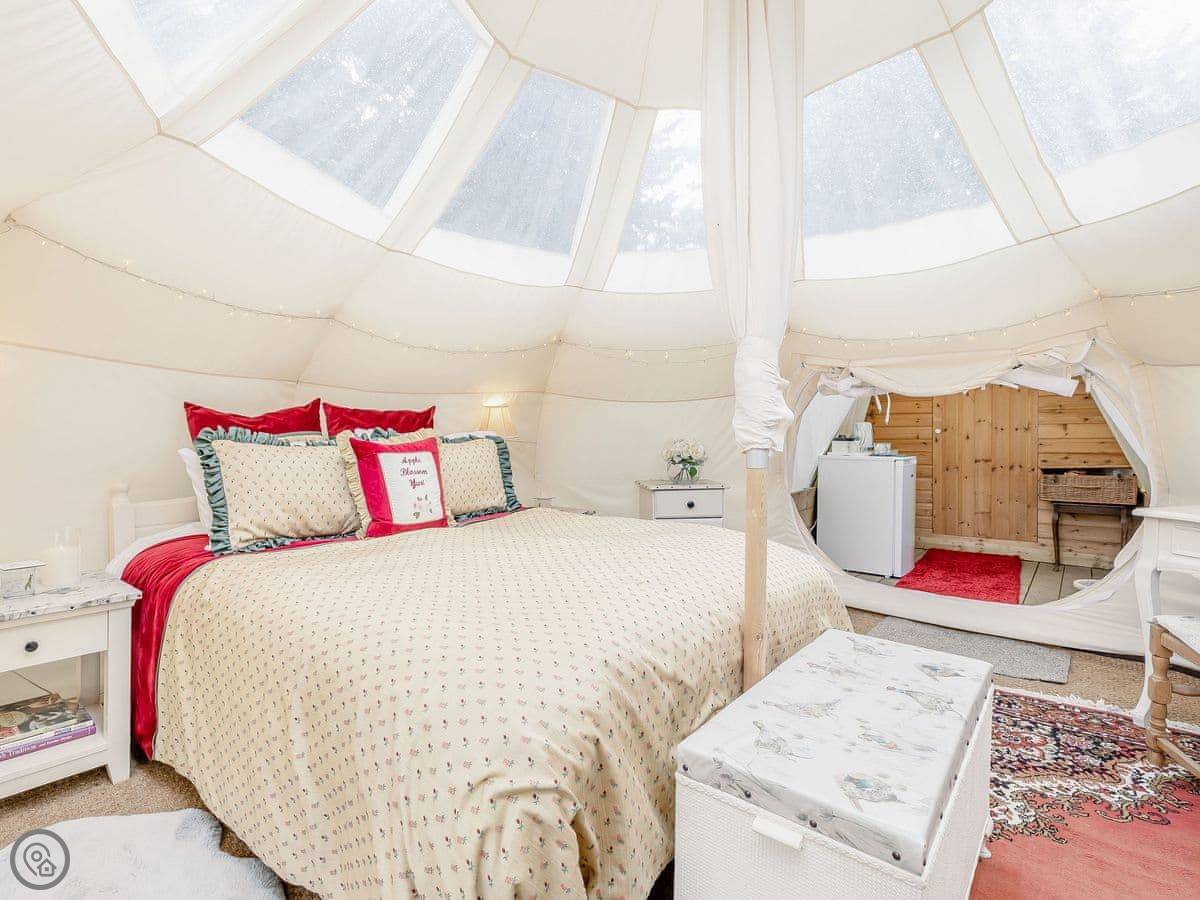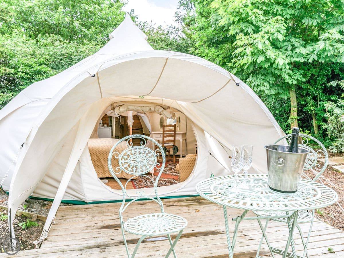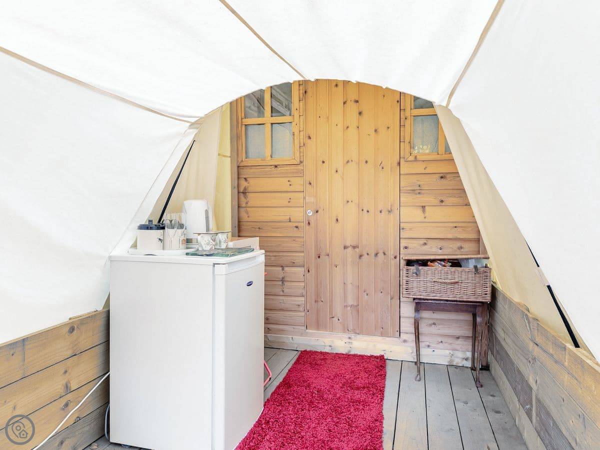 It sleeps two people. One room, and a separate bathroom bit with a shower and sink. It's got a 4 Star rating. It's comfortable and dry, but remember it's a tent, so it's glamping, not a solid building. There's a wood burner for heat.