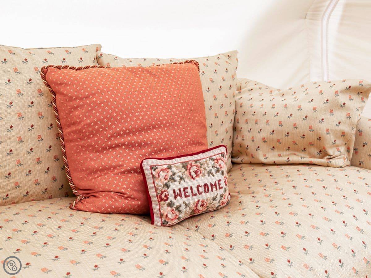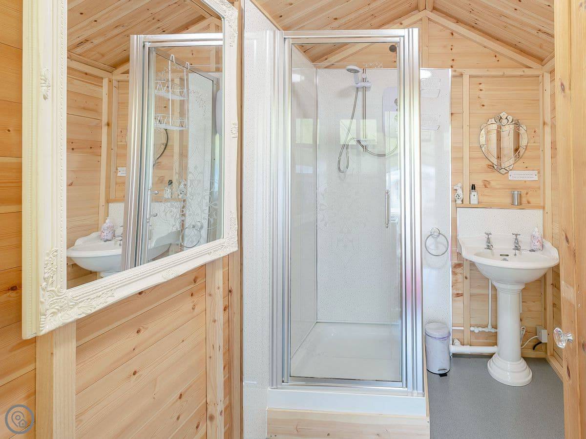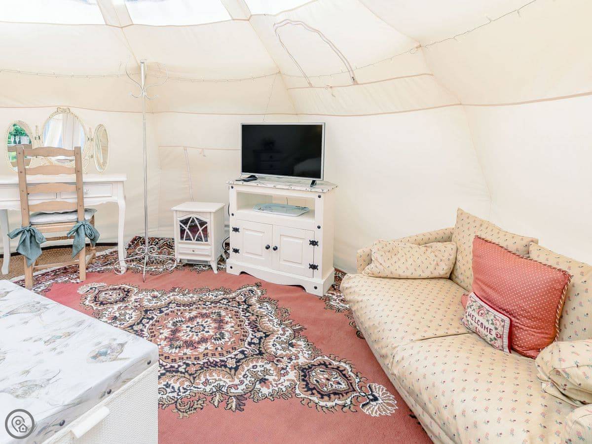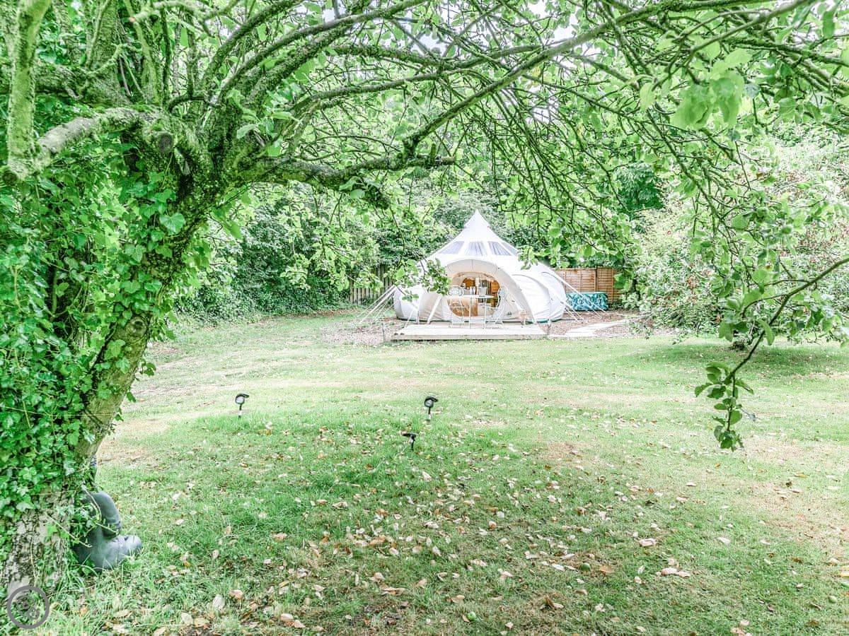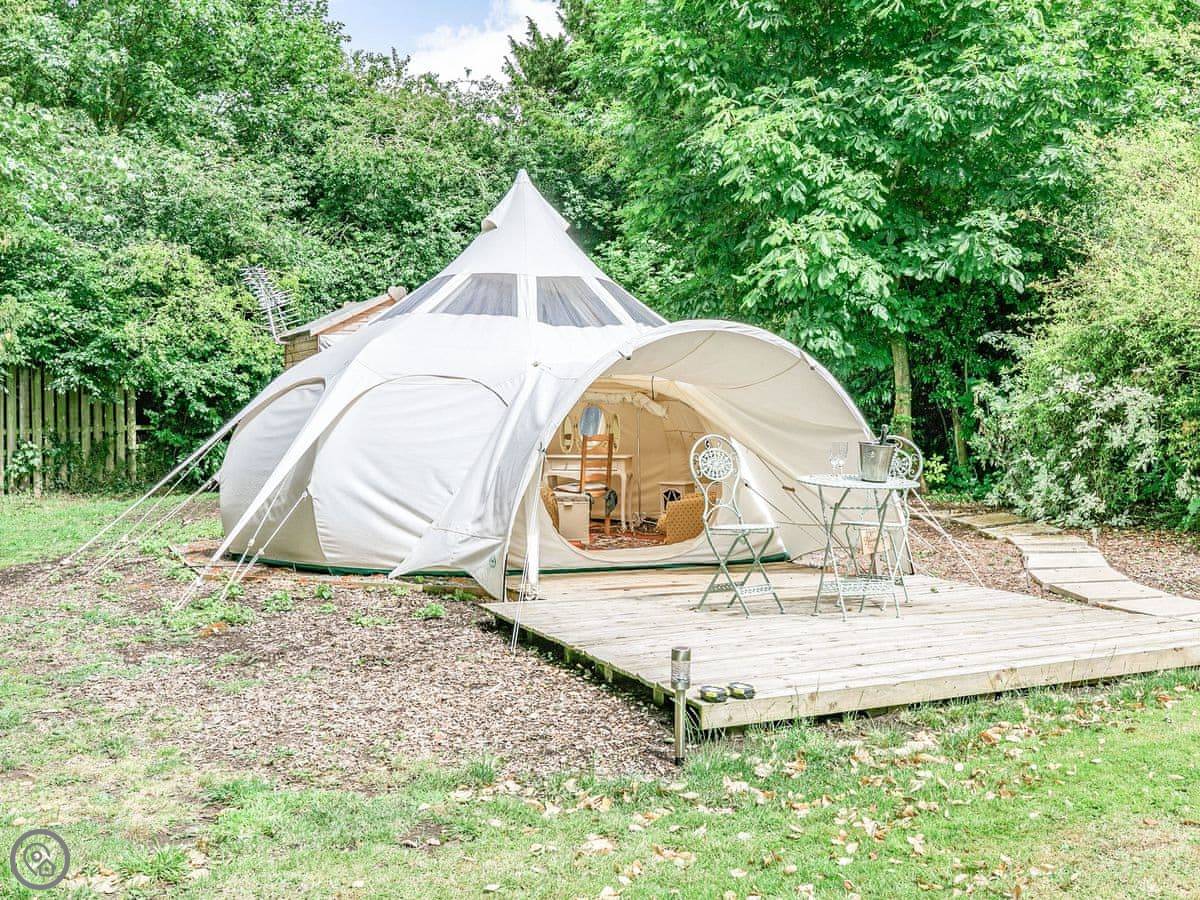 It sleeps two people. One room, and a separate bathroom bit with a shower and sink. It's got a 4 Star rating. It's comfortable and dry, but remember it's a tent, so it's glamping, not a solid building. There's a wood burner for heat.