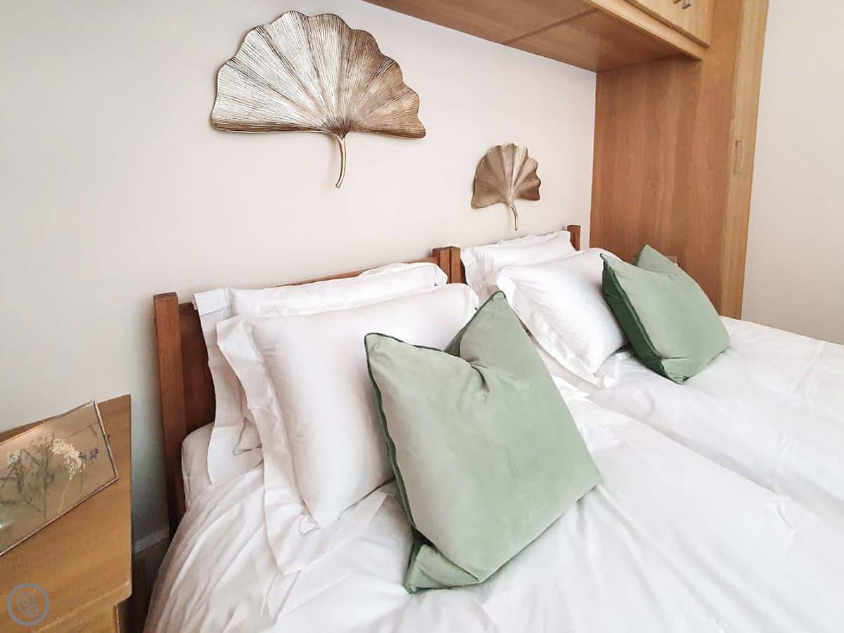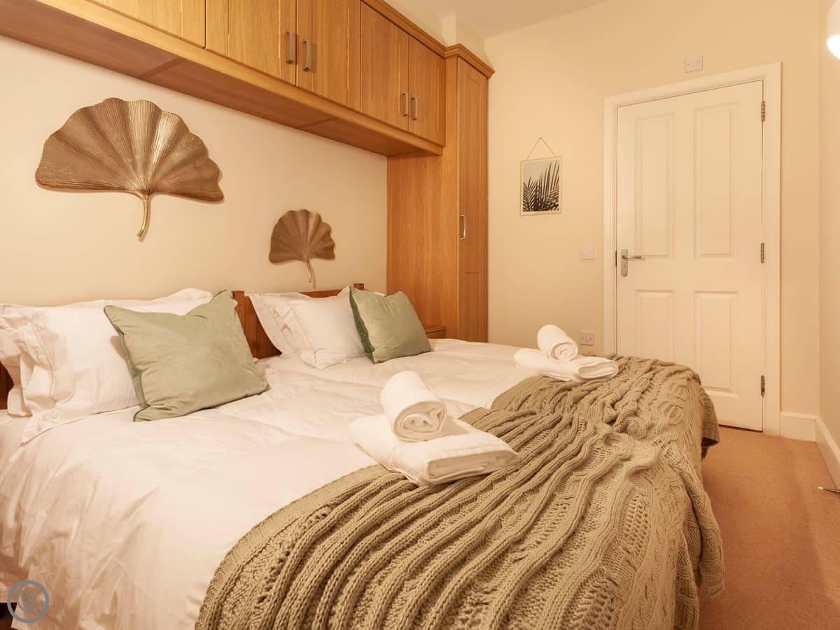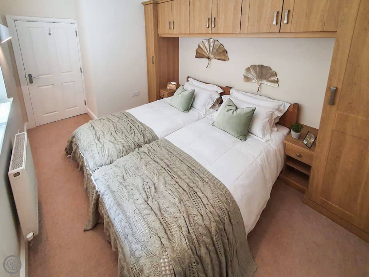 It sleeps four. Two bedrooms, both with their own bathrooms. One's a kingsize with the sea view, the other has twin beds. It's got a 4 Star rating. It's comfortable, not luxury. Everything works.
