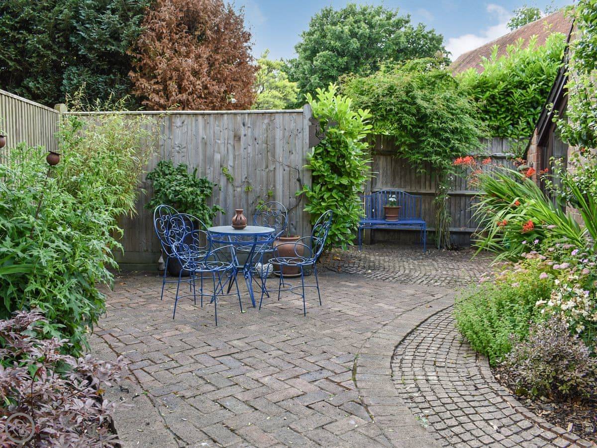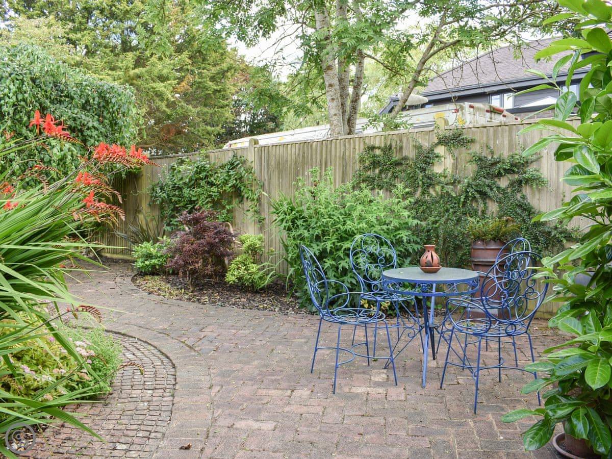 Outside, there's a private courtyard garden with a table. Parking is right next to it.