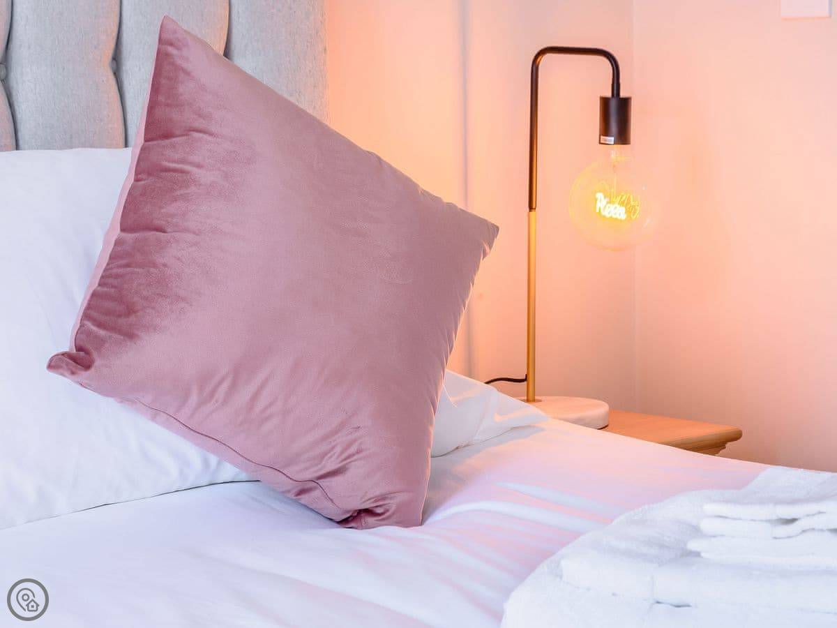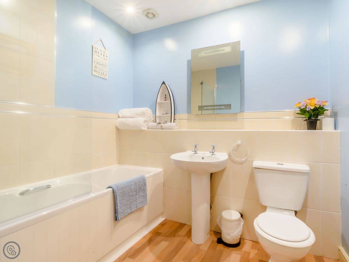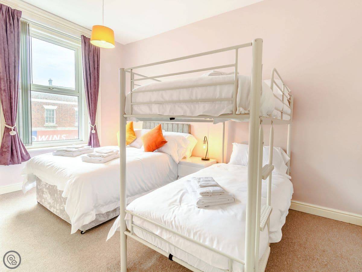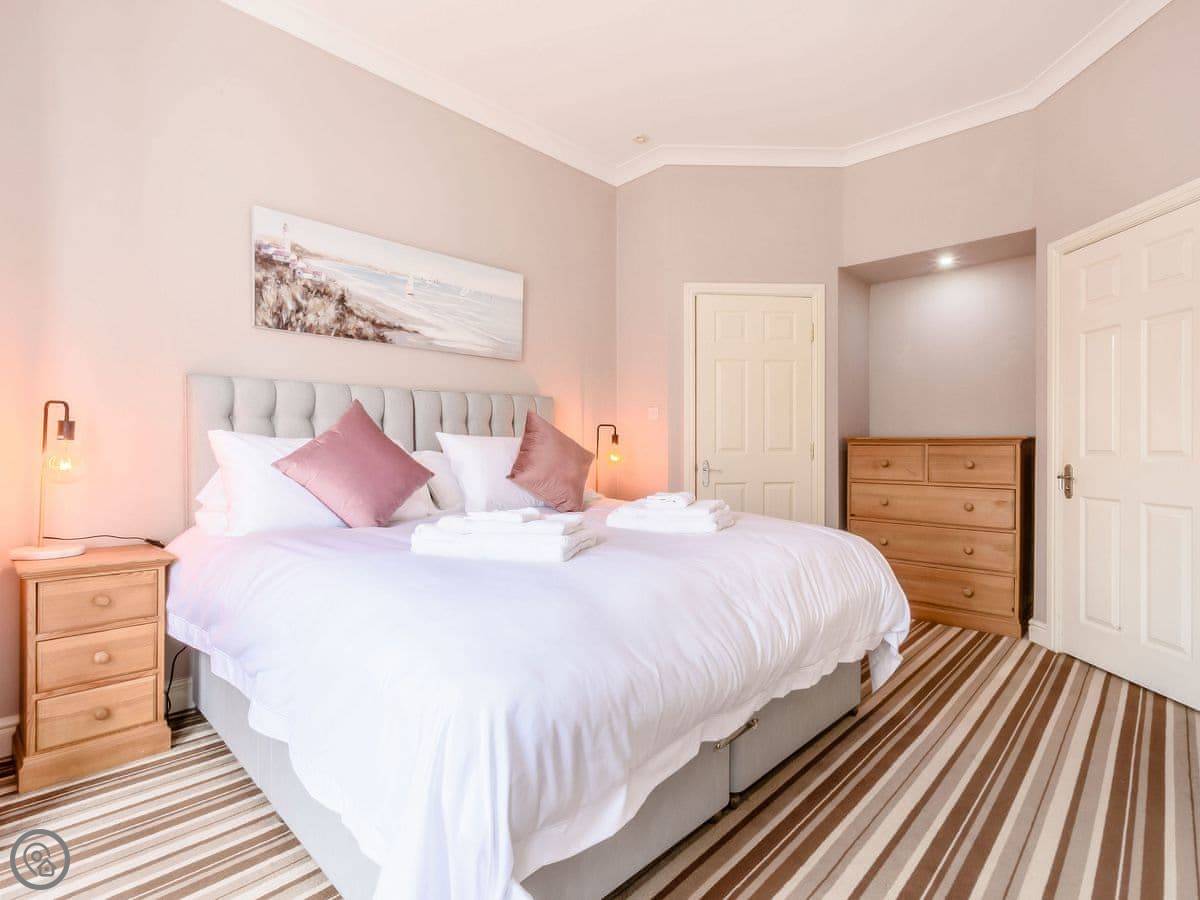 It sleeps six people. There are two bedrooms and two bathrooms. One bedroom has a super king bed that can be split into two singles, with its own shower room. The other bedroom has a double bed and a bunk bed, so it's a triple. There's a main bathroom with a bath. It's got a 4 Star rating.