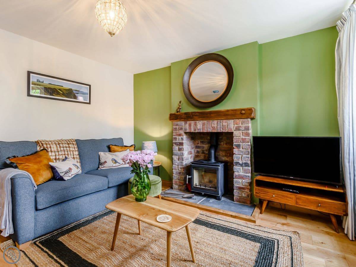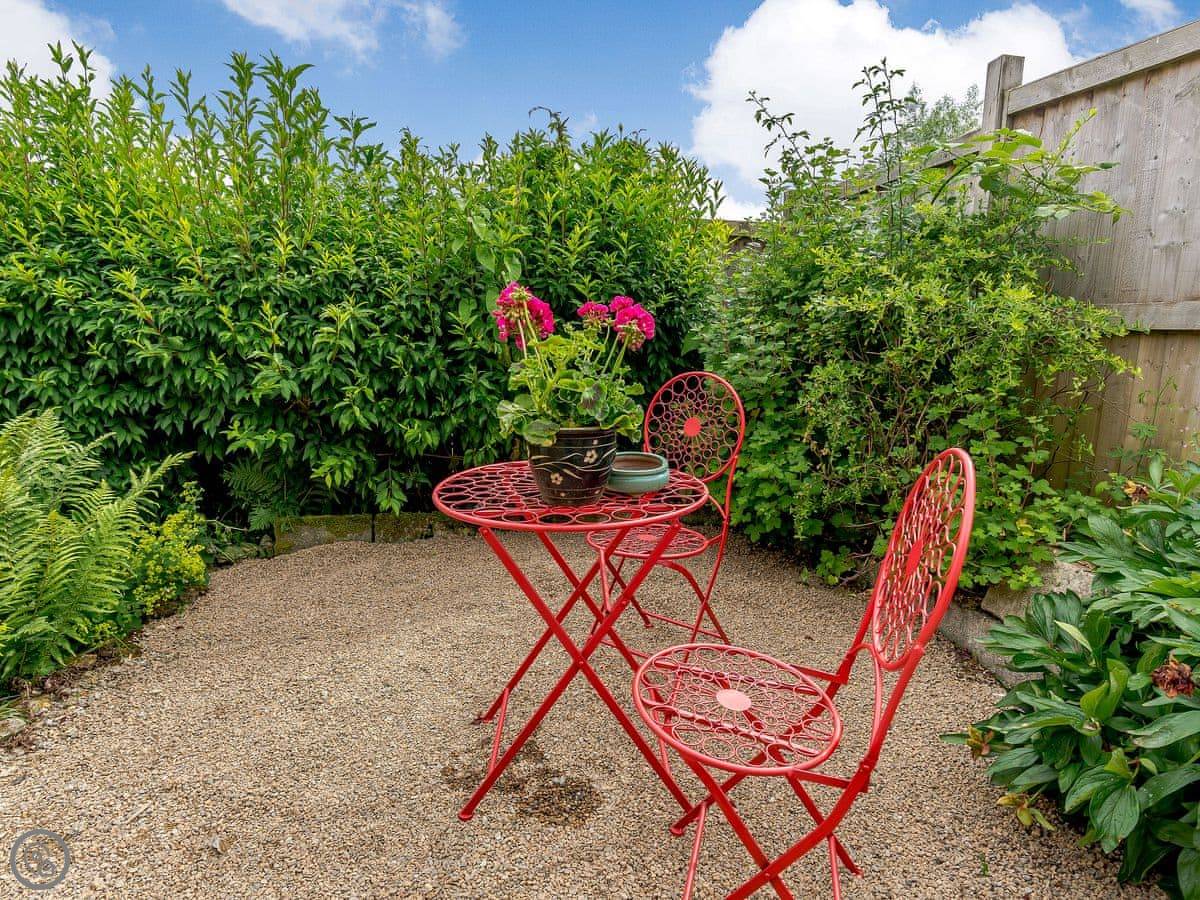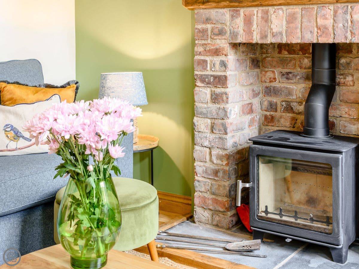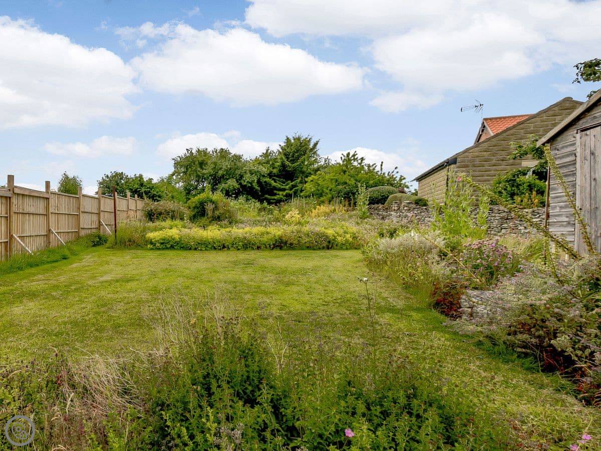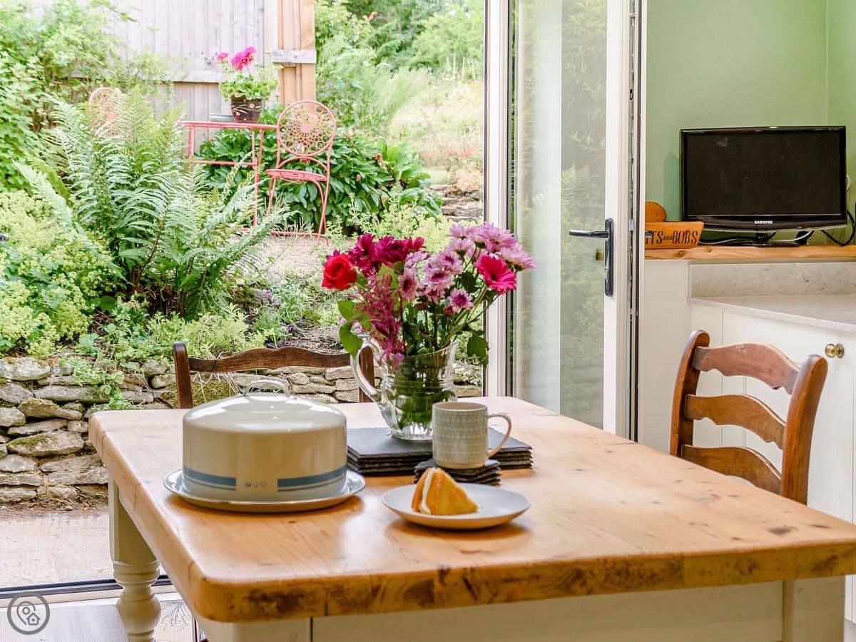 The main thing about it is the garden. It's a really big, enclosed garden, with plenty of colour. There's a seating area out there. Inside, there's a wood-burning stove. There is one step into the property, but the inside is level, so it might work if you have limited mobility, but the bathroom is upstairs. There's a stairgate and a cot available.