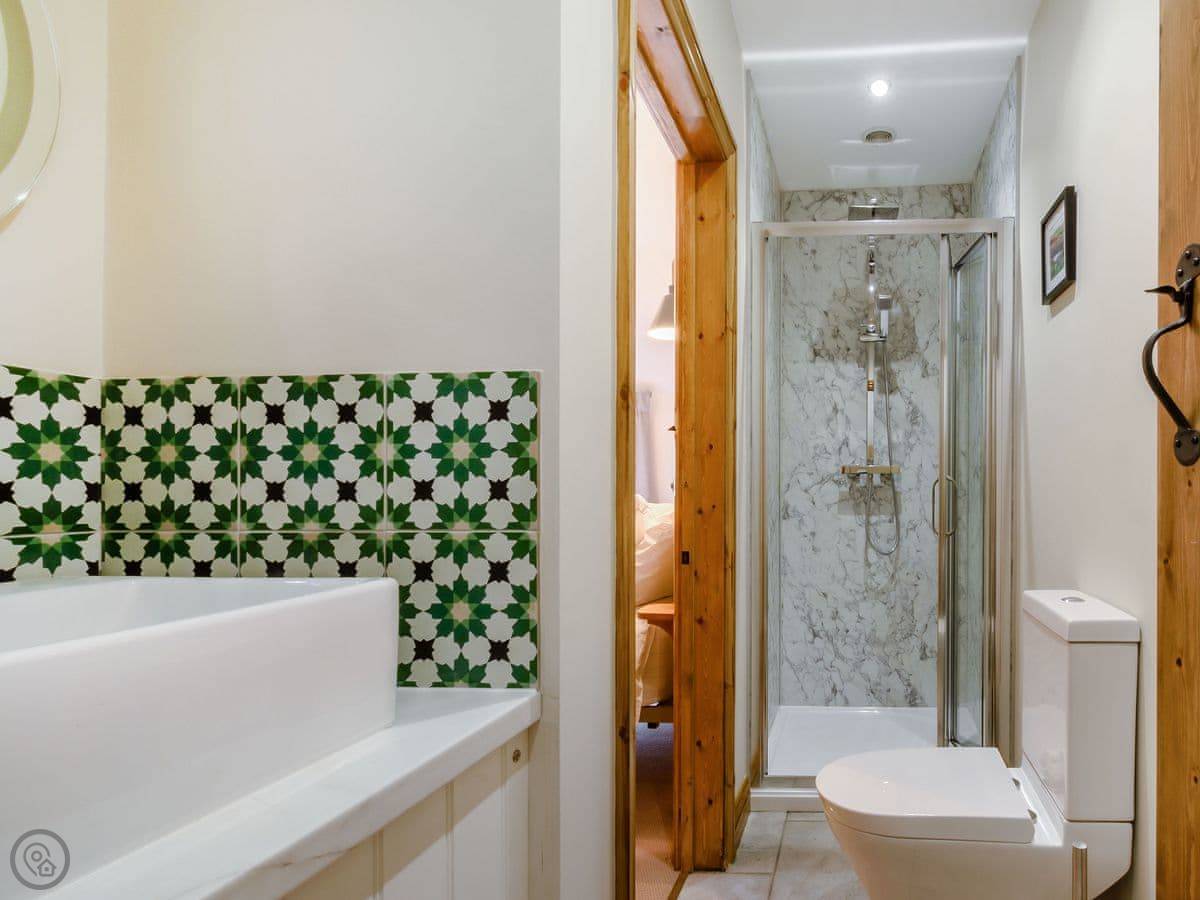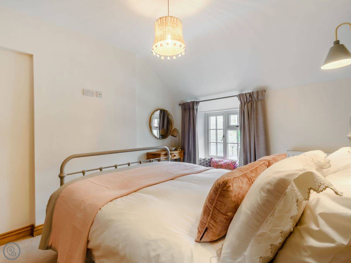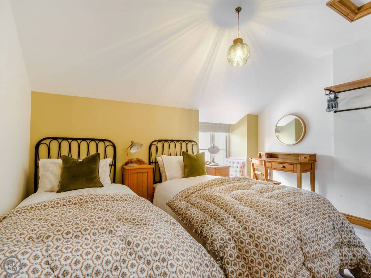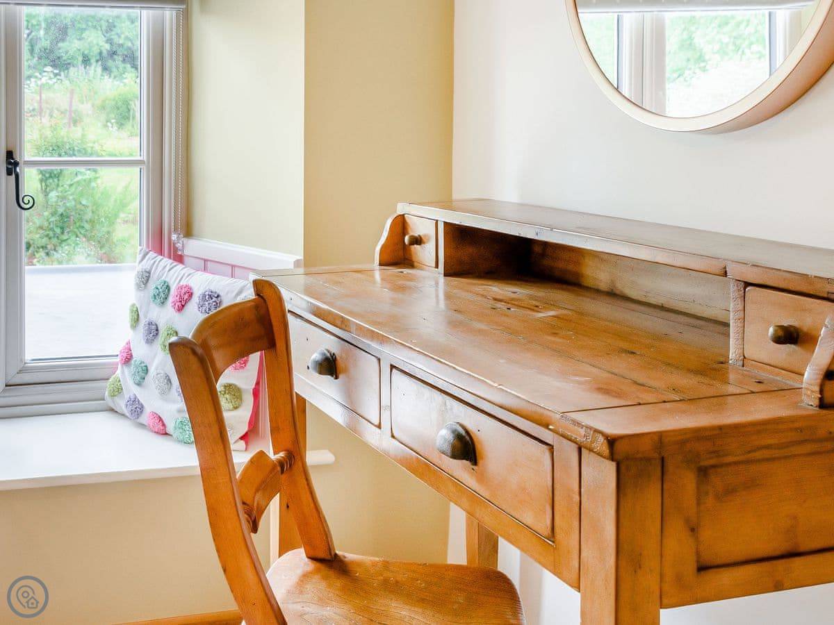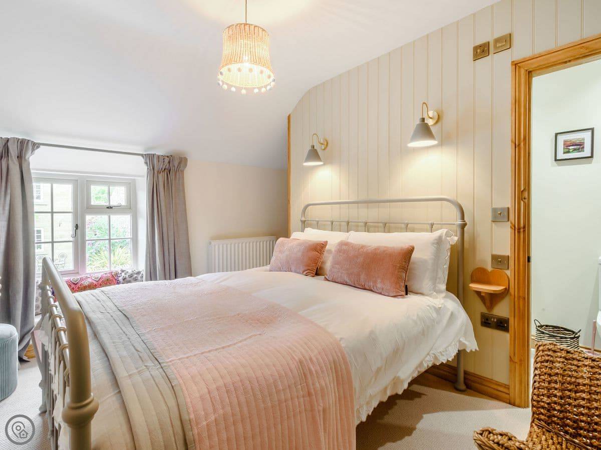 The main thing about it is the garden. It's a really big, enclosed garden, with plenty of colour. There's a seating area out there. Inside, there's a wood-burning stove. There is one step into the property, but the inside is level, so it might work if you have limited mobility, but the bathroom is upstairs. There's a stairgate and a cot available.