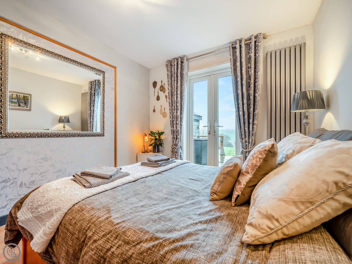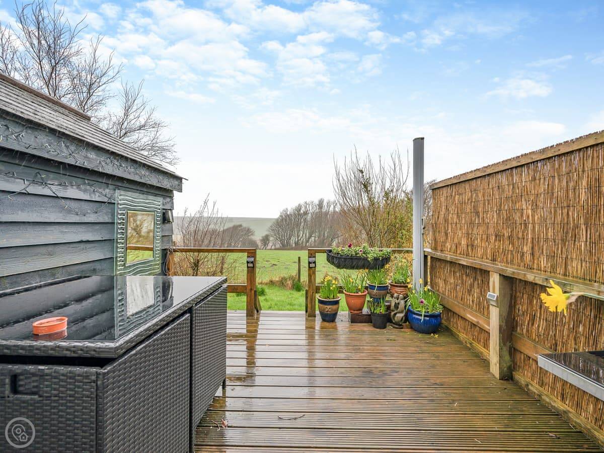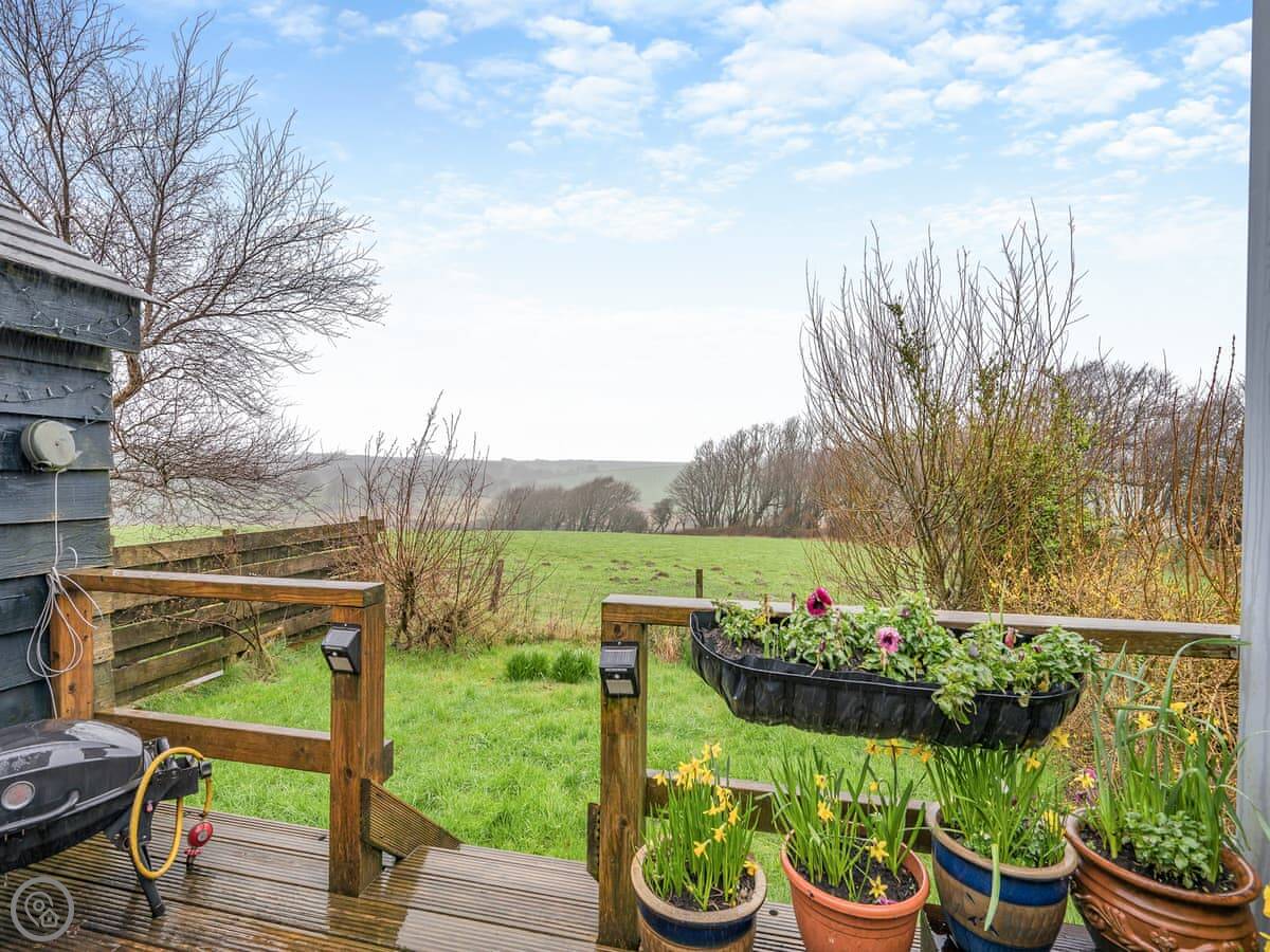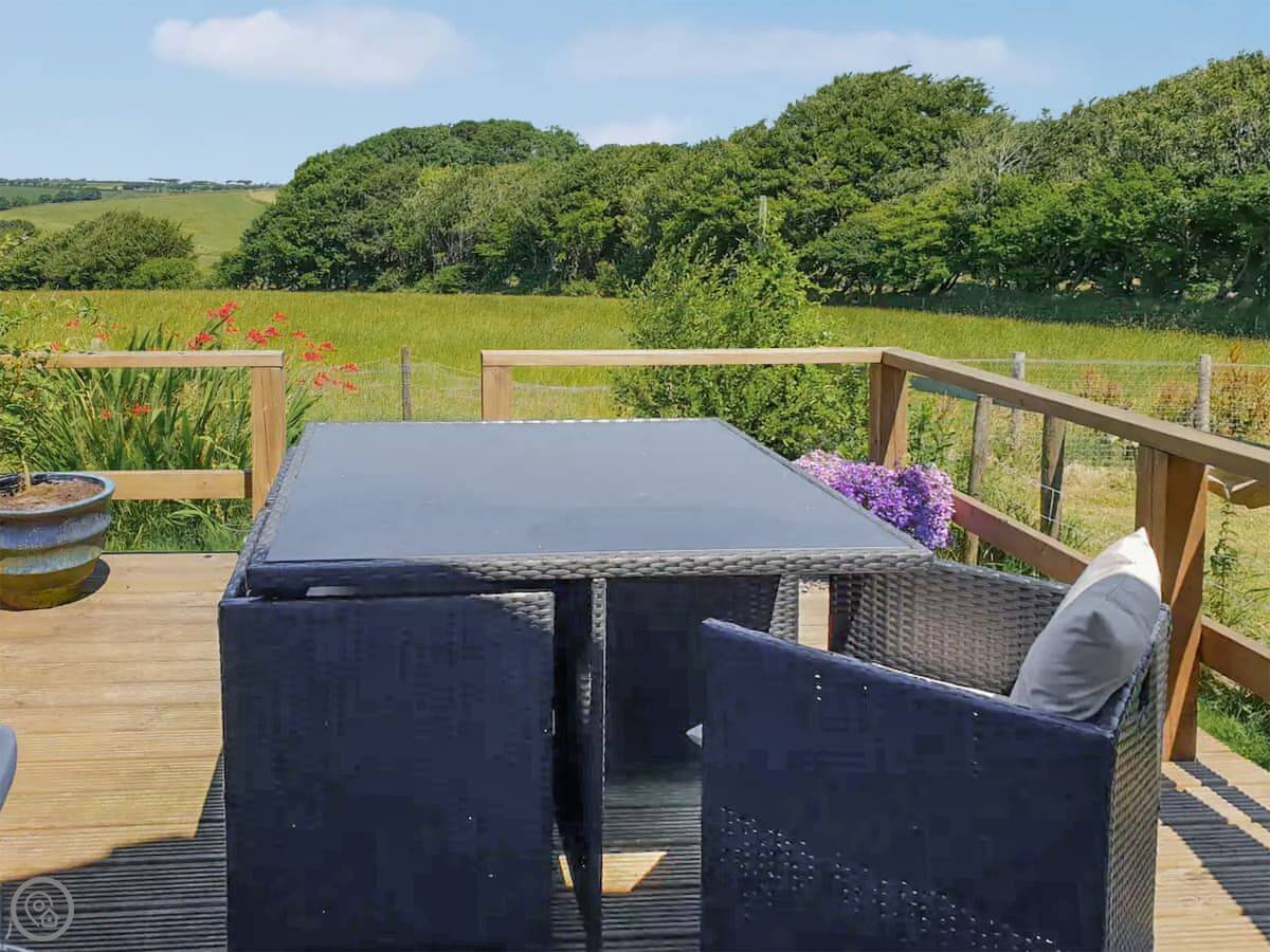This is Hindscarth Apartment. It's in Tremail, which is a hamlet just north of Bodmin Moor. It’s a first-floor apartment above the garage at the main house, so you’re up a flight of external stairs. You get the place to yourselves, and the views from the deck are over fields. It’s very quiet.