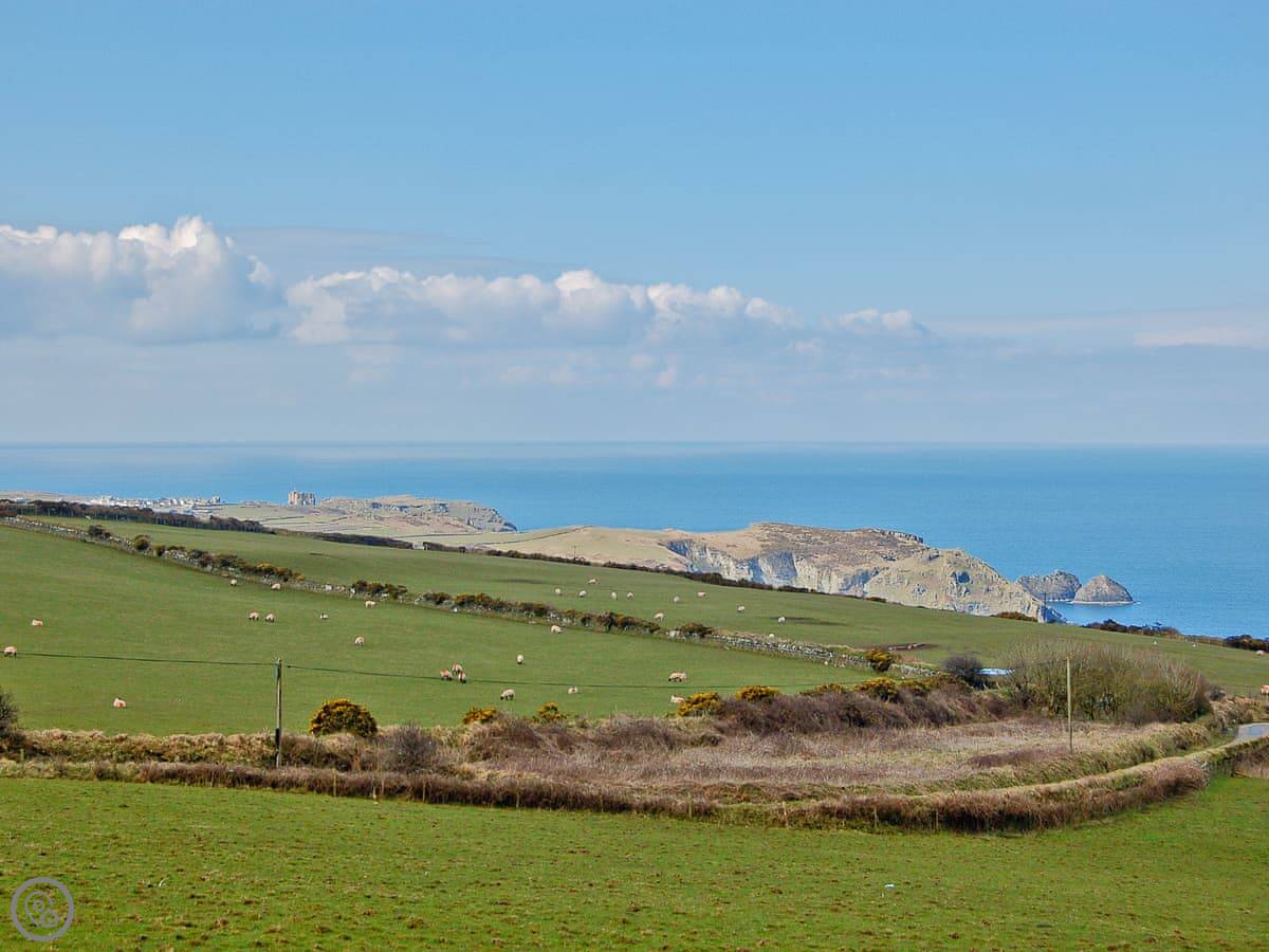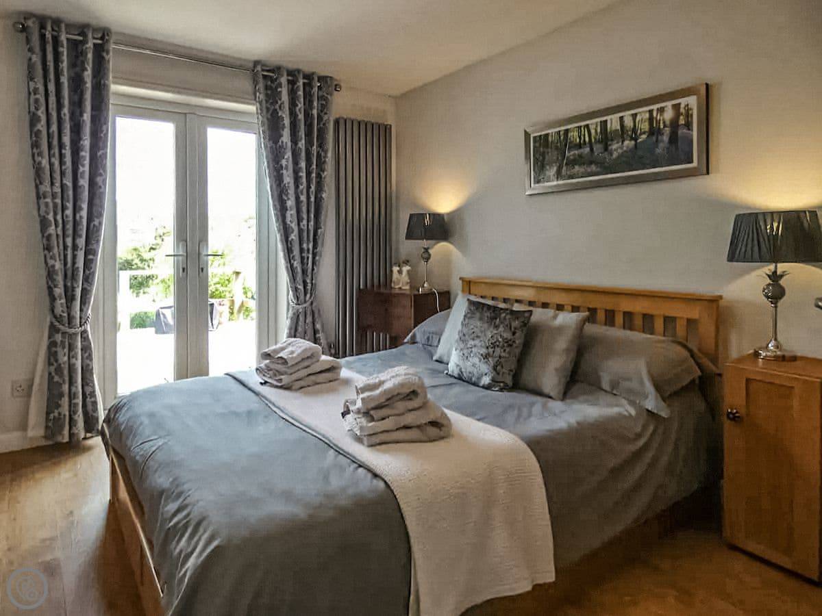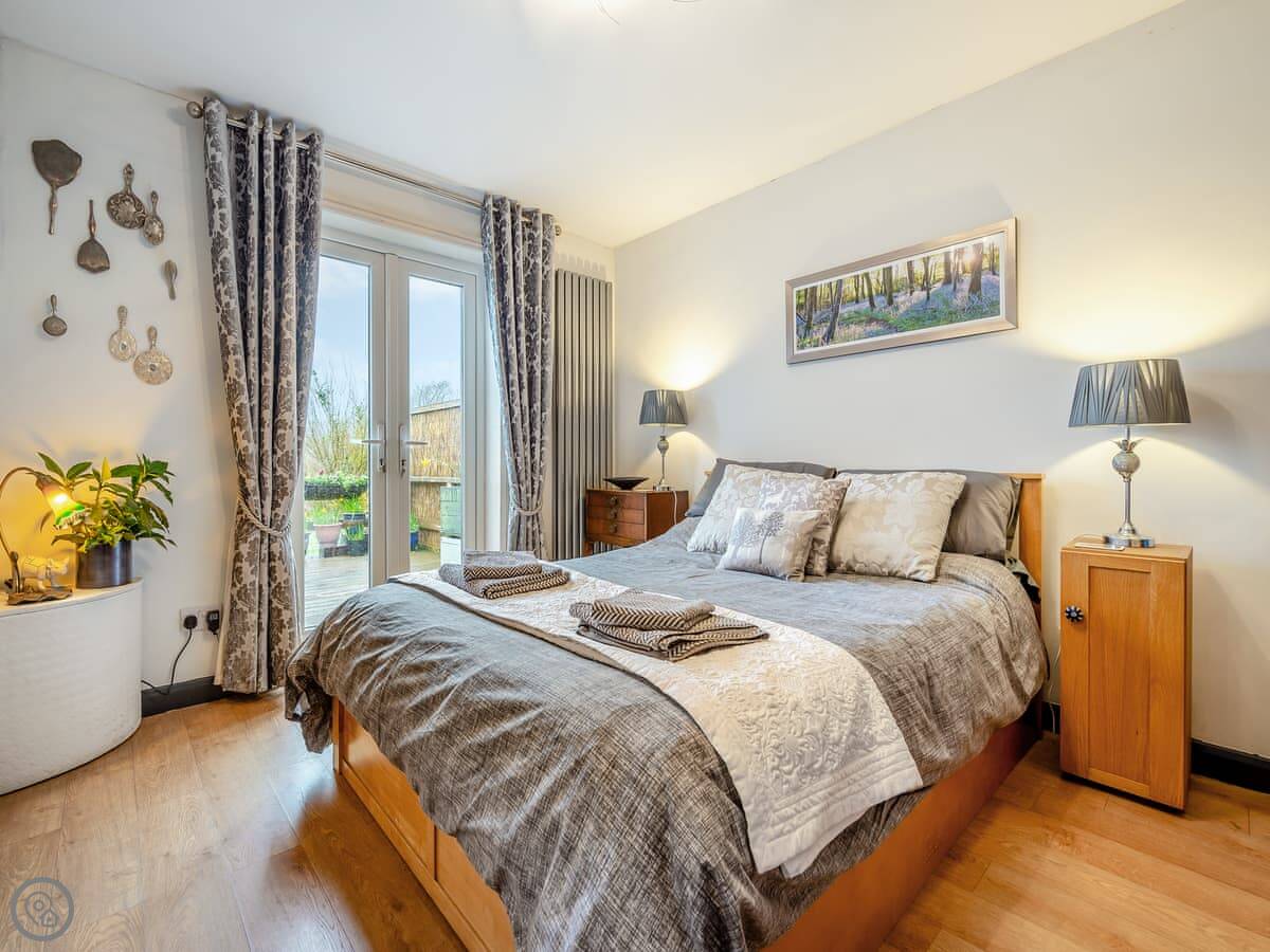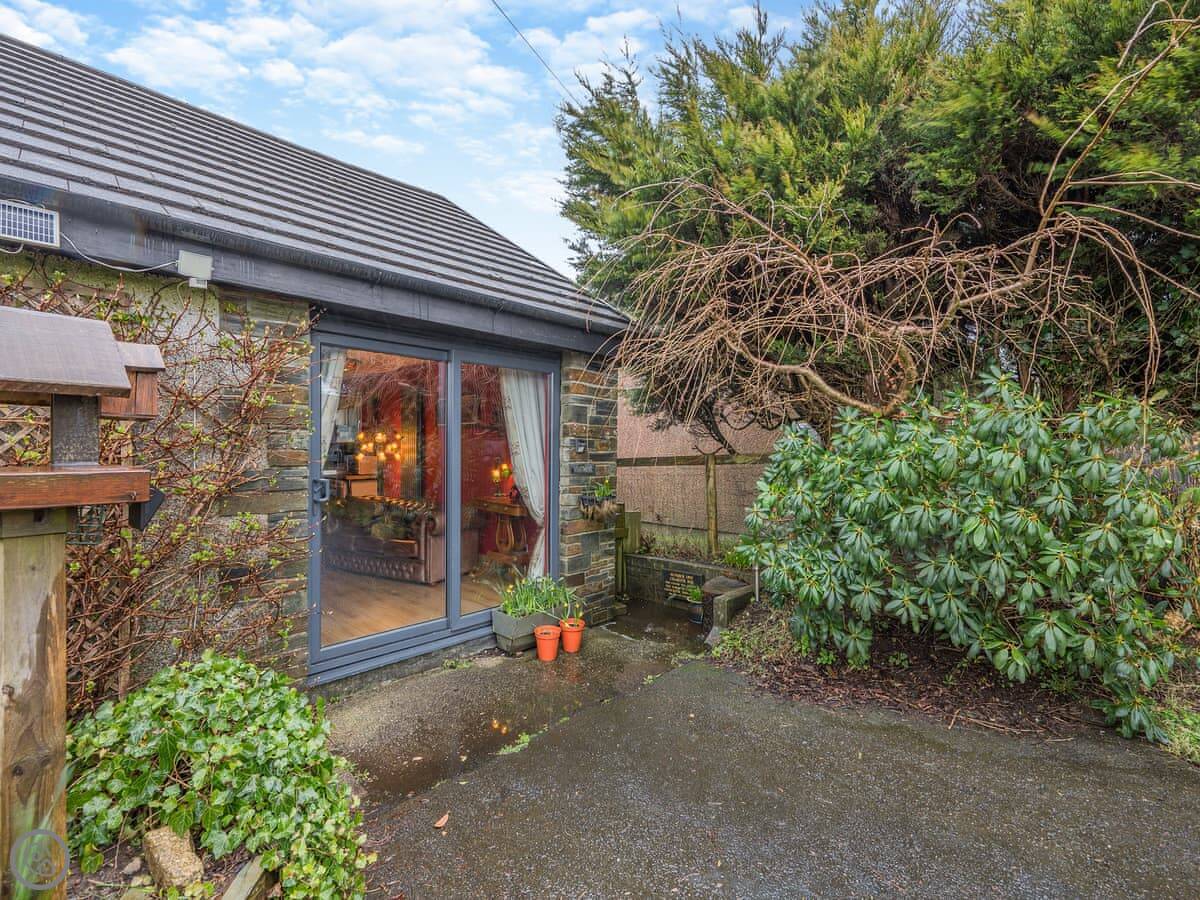 This is Hindscarth Apartment. It's in Tremail, which is a hamlet just north of Bodmin Moor. It’s a first-floor apartment above the garage at the main house, so you’re up a flight of external stairs. You get the place to yourselves, and the views from the deck are over fields. It’s very quiet.
