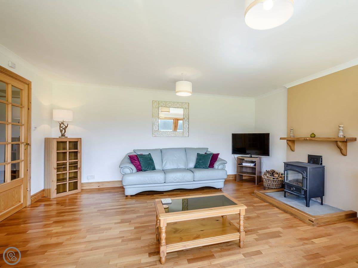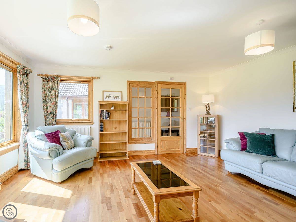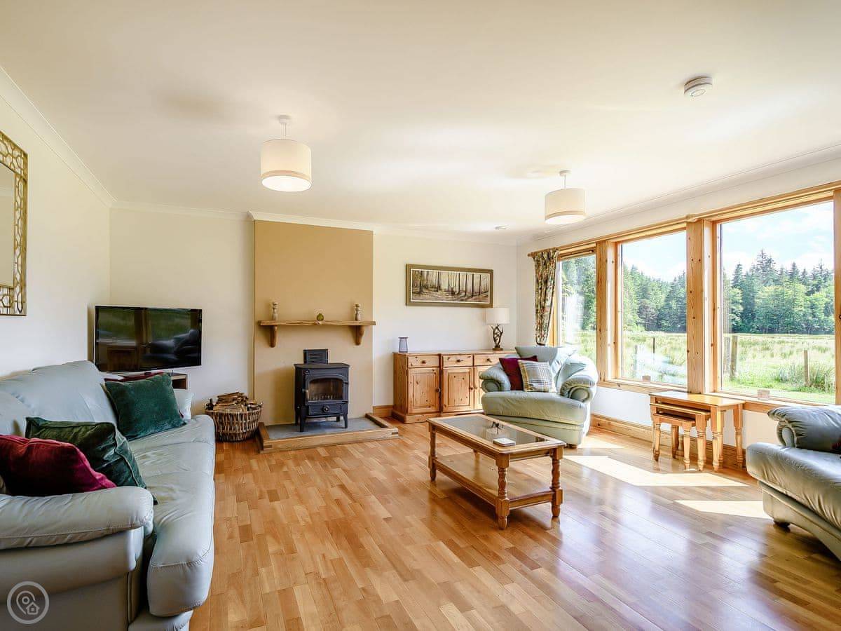 The main living area is open plan. There's also a second sitting room that has the best view. Big windows looking out over the glen.