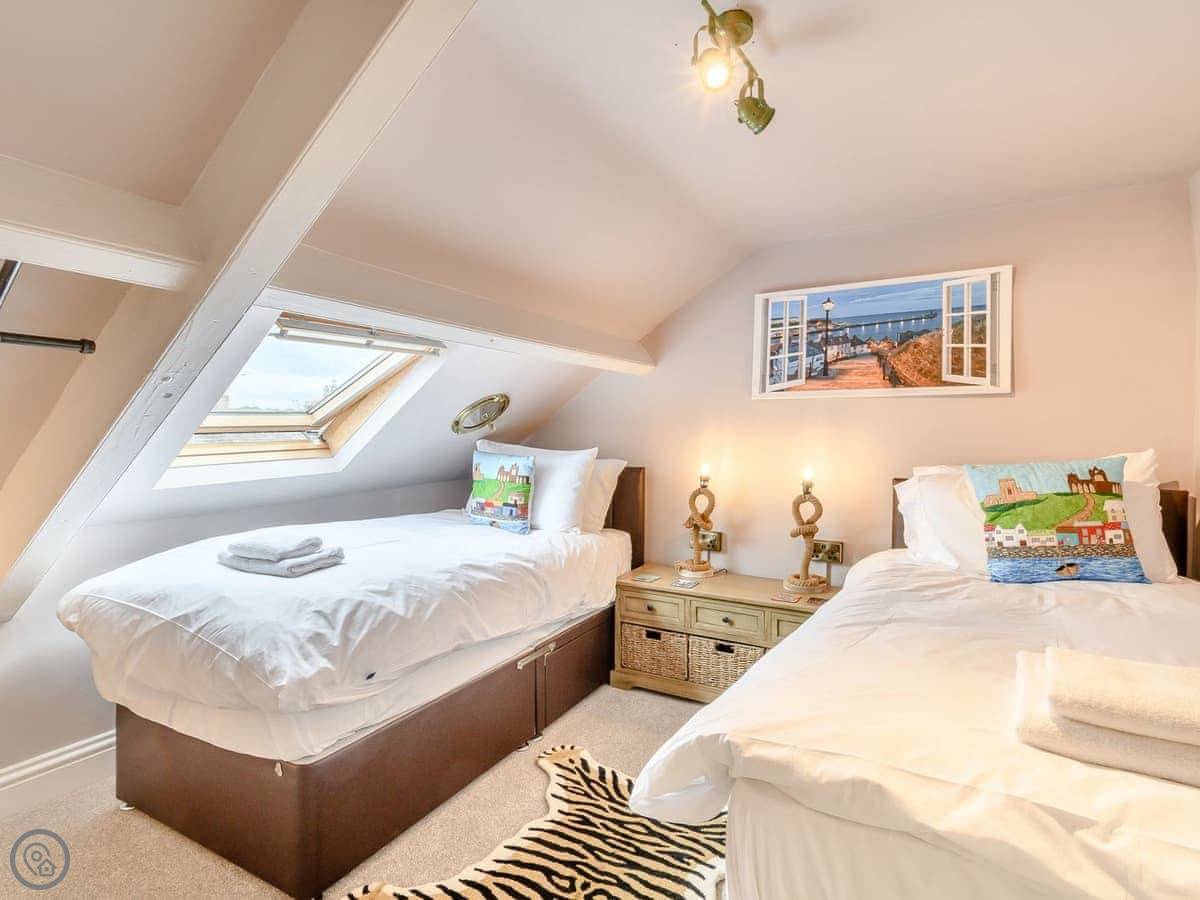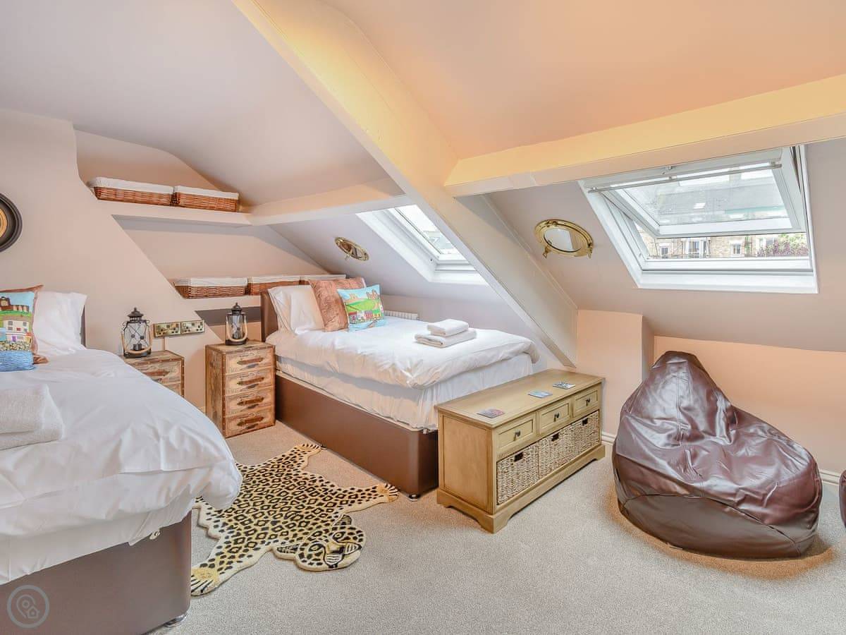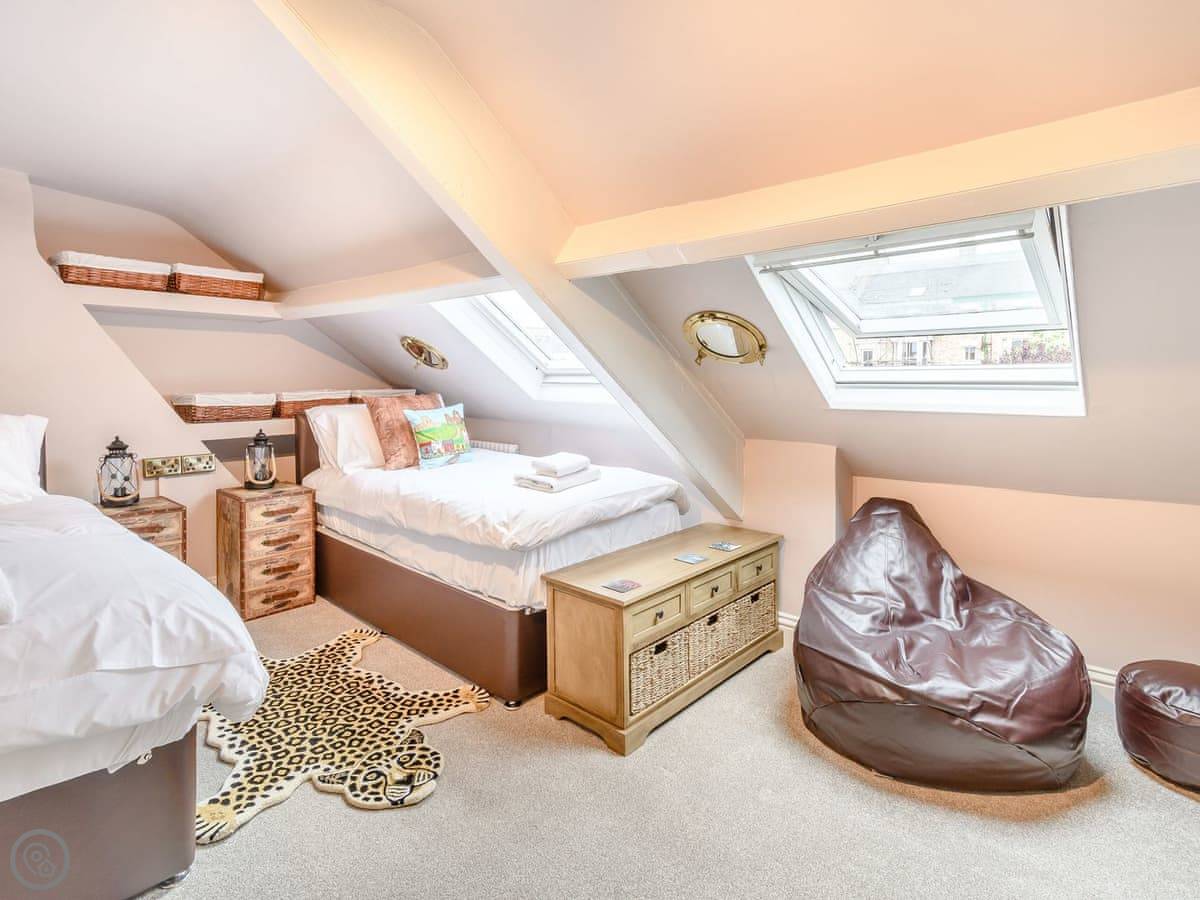 Inside, the rooms are tall with big windows. The stairs are standard for a house like this, so they're a bit steep and winding. The two twin bedrooms are up in the attic. One of them has a skylight you can see Whitby Abbey from. The beds under the eaves are fine for adults, but you do need to mind your head getting in and out.
