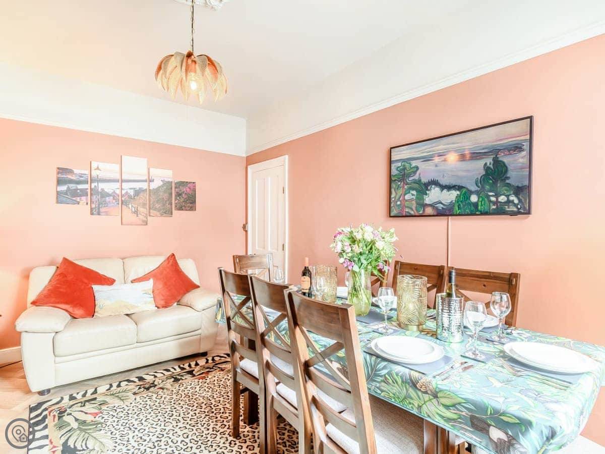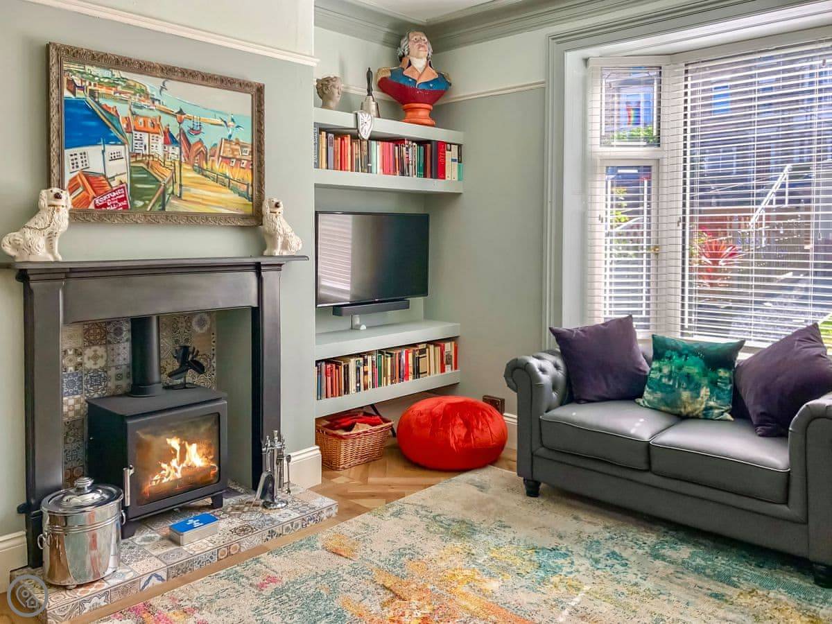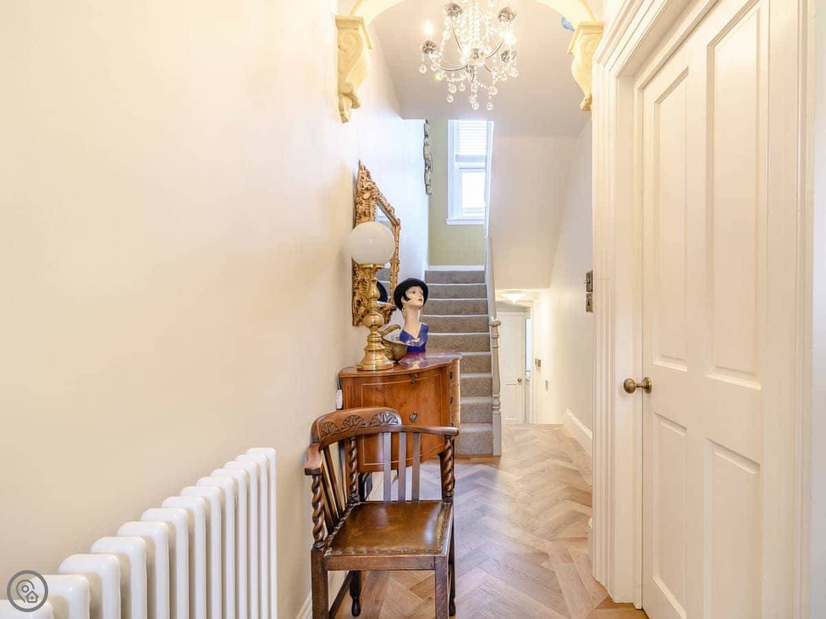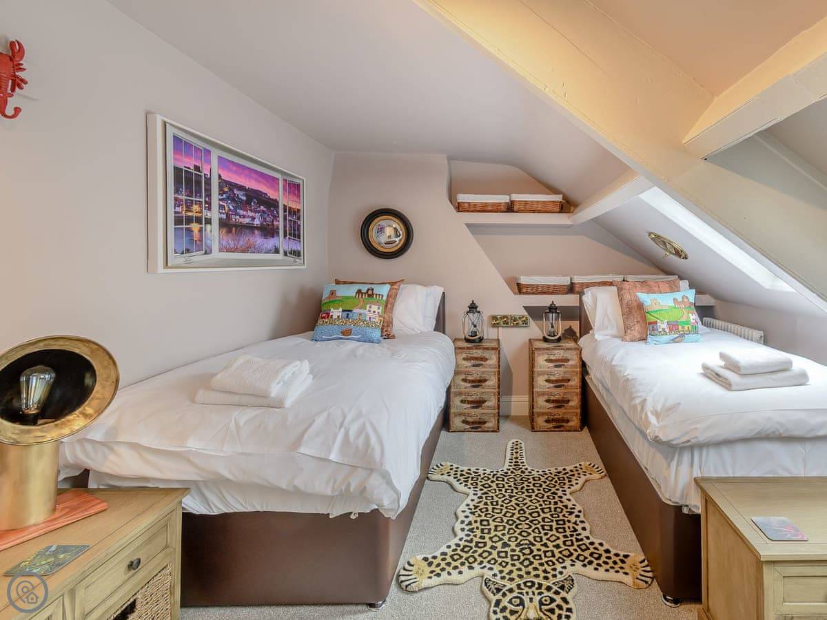 Inside, the rooms are tall with big windows. The stairs are standard for a house like this, so they're a bit steep and winding. The two twin bedrooms are up in the attic. One of them has a skylight you can see Whitby Abbey from. The beds under the eaves are fine for adults, but you do need to mind your head getting in and out.