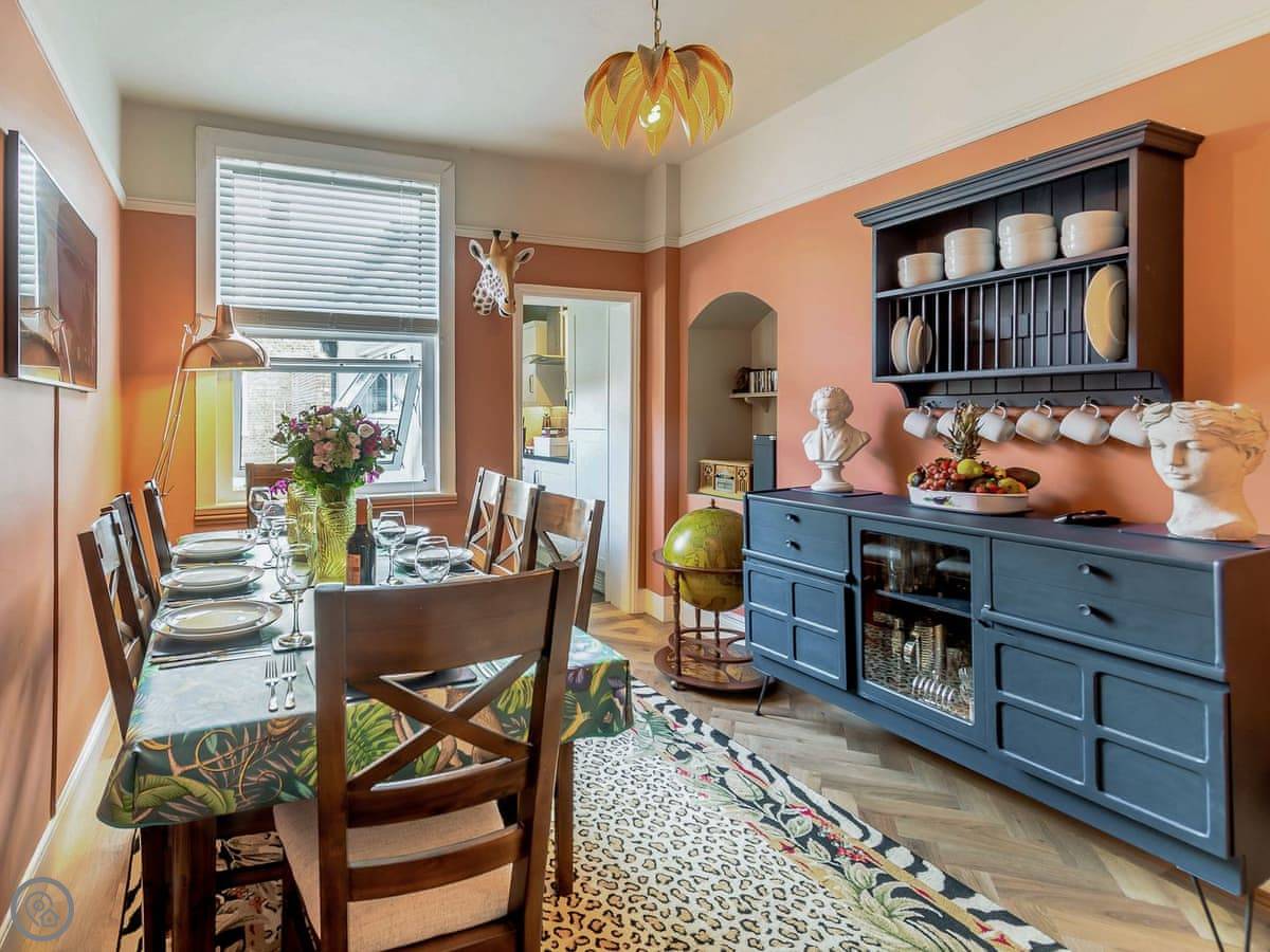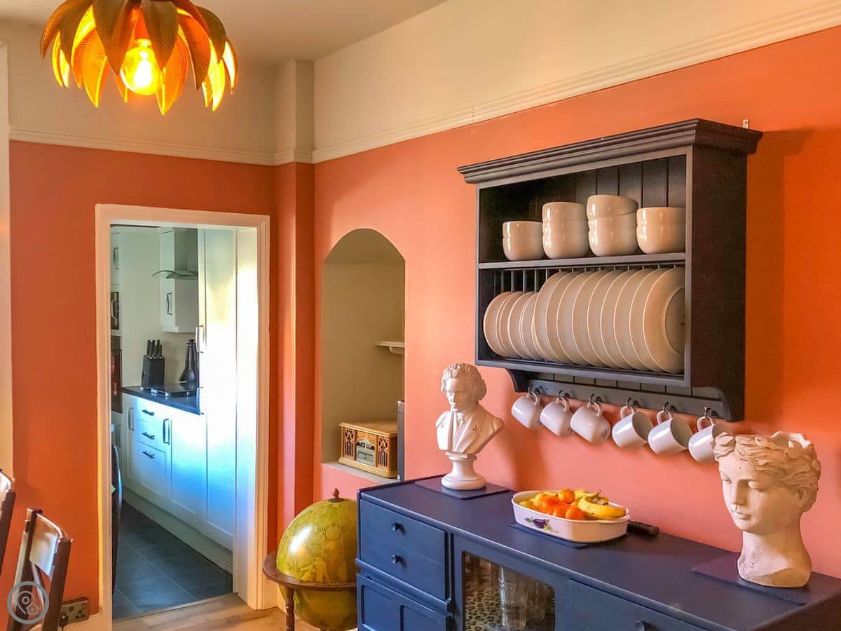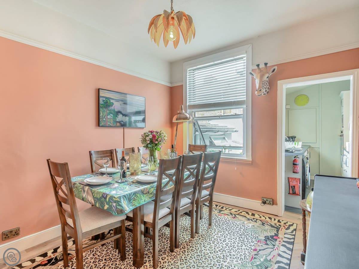 There's a wood burner in the living room. We leave a fire guard for it. The kitchen is a galley style, but it's got everything: dishwasher, washing machine, a coffee machine. The dining room has a big table for everyone.