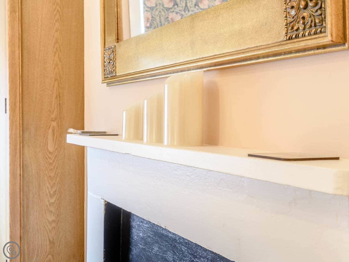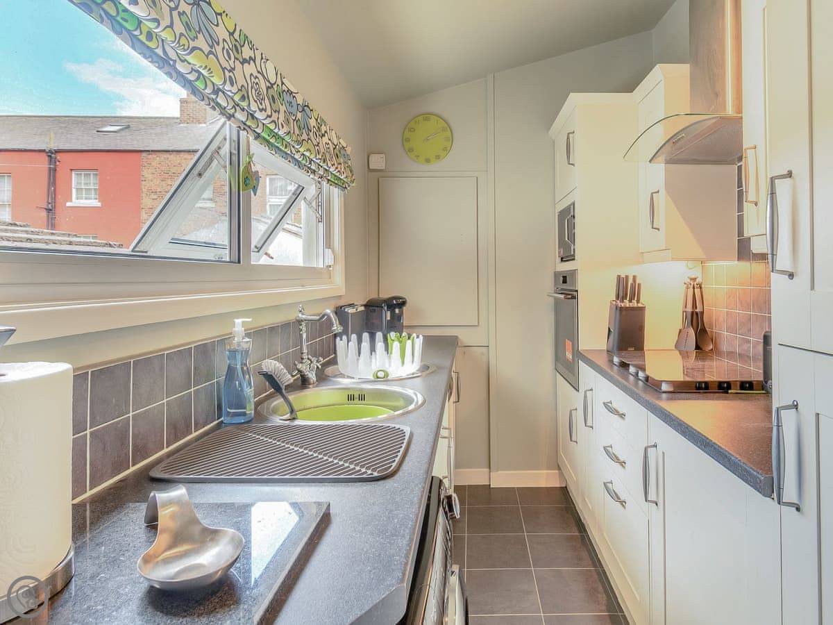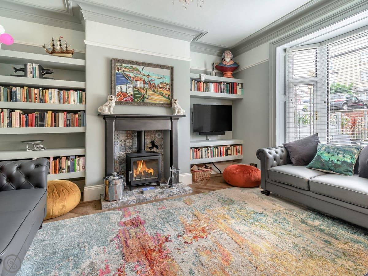 There's a wood burner in the living room. We leave a fire guard for it. The kitchen is a galley style, but it's got everything: dishwasher, washing machine, a coffee machine. The dining room has a big table for everyone.