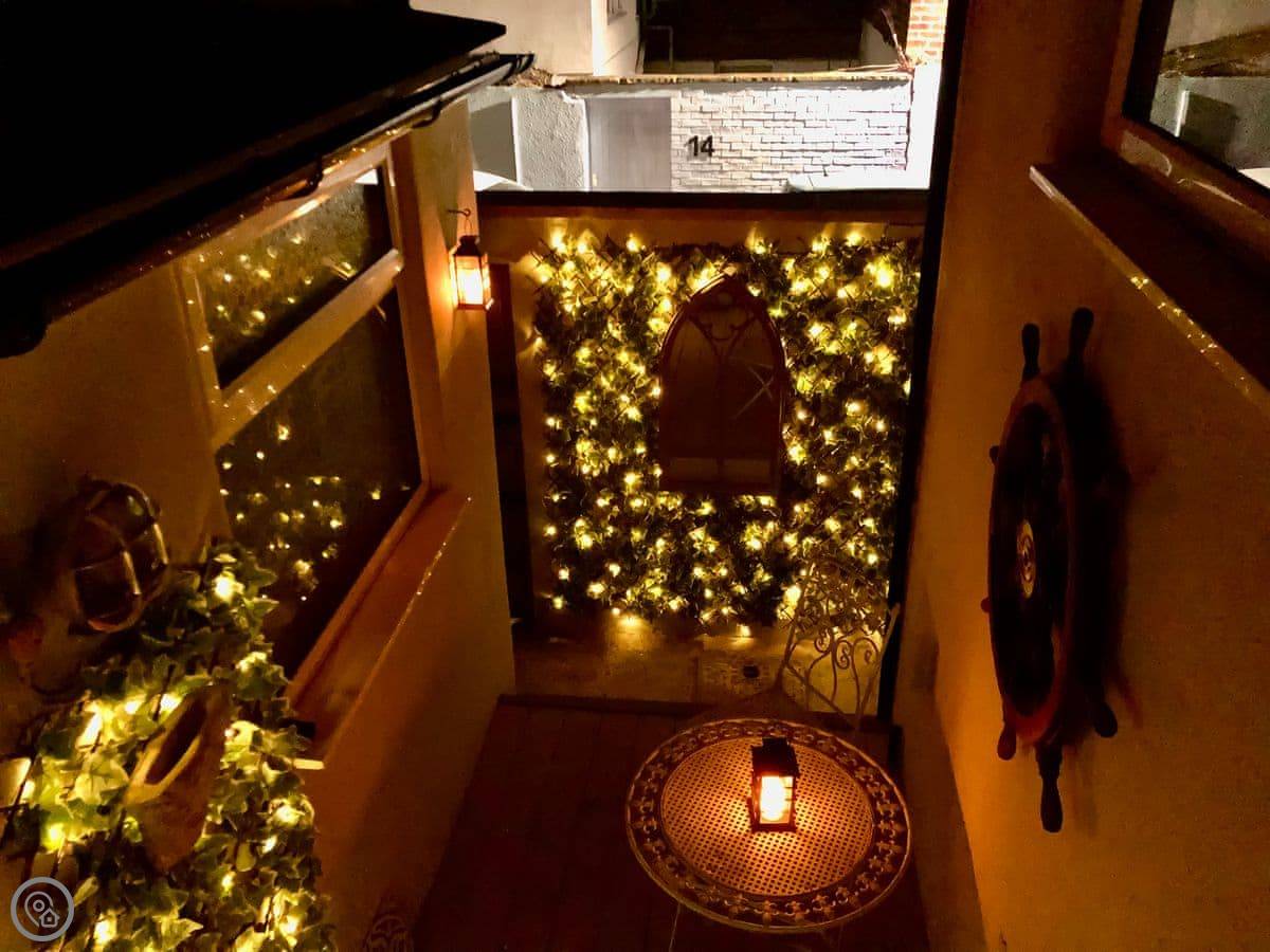 You can park one car off the street at the front. There's a small front garden with a table and chairs. Out the back is a little decked courtyard with a seat for two. It's got fairy lights.