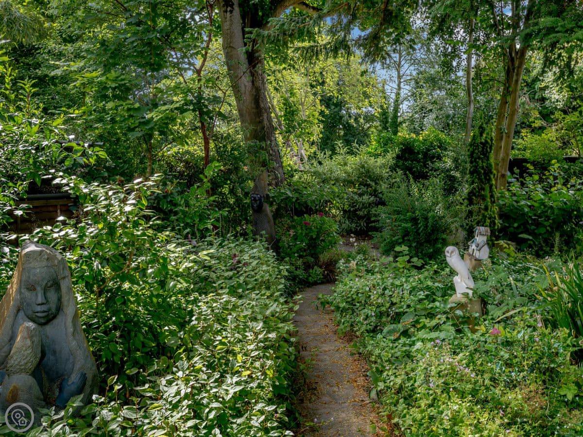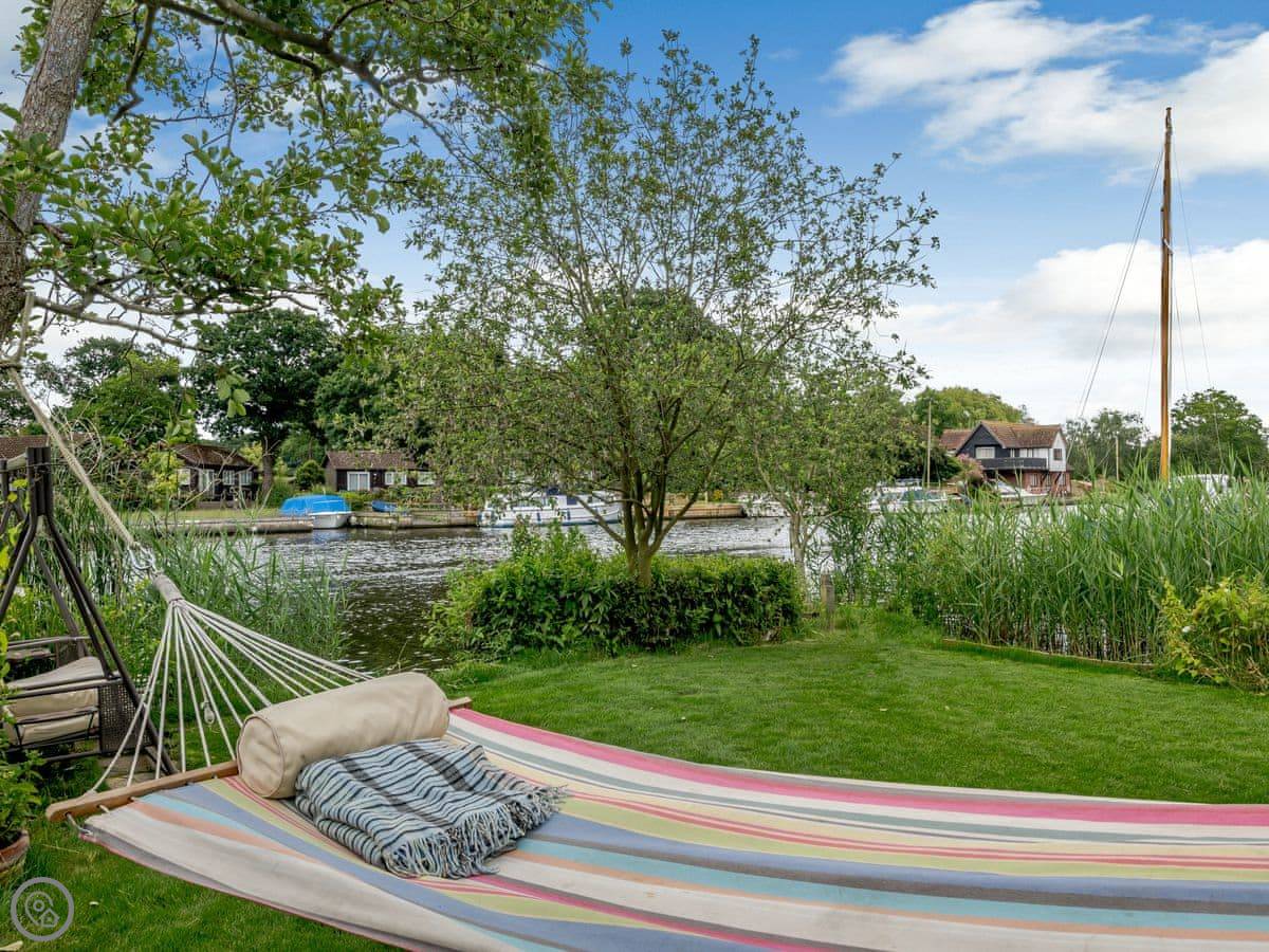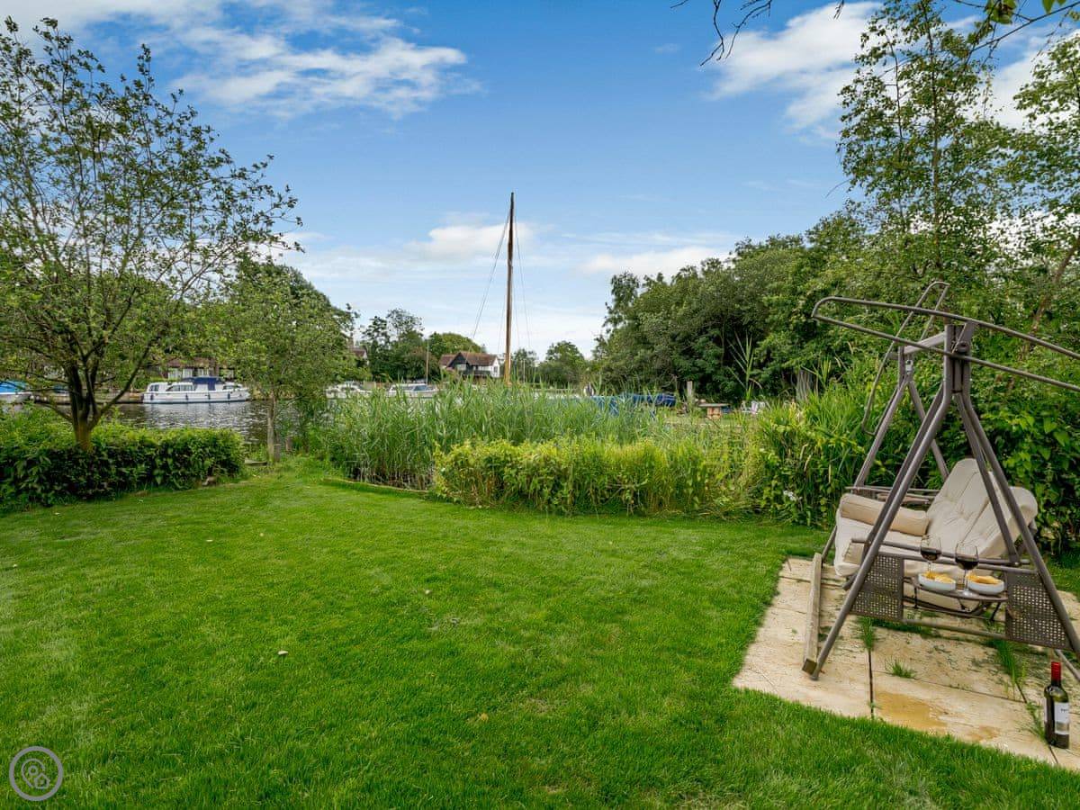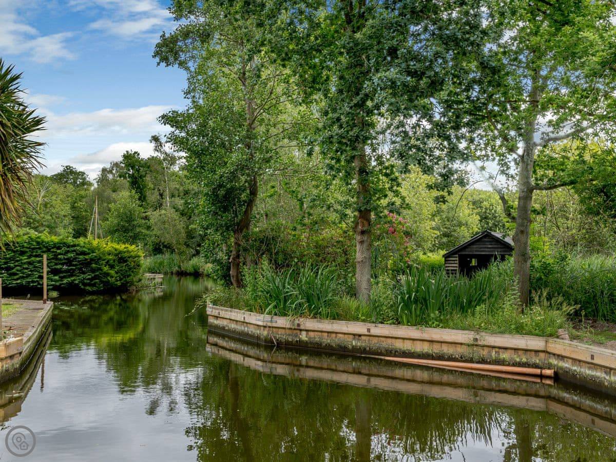 The main thing is the garden. It's large, about an acre, and it's not just a lawn. There are streams and ponds. It goes right down to the water. You have a private quayside mooring if you bring a boat. At the bottom of the garden, over a river bridge, there's a little separate bit of riverbank called Mowle Point. It's got a sun house and seats. You can sit there and watch the boats on Womack Water. It's good for fishing.