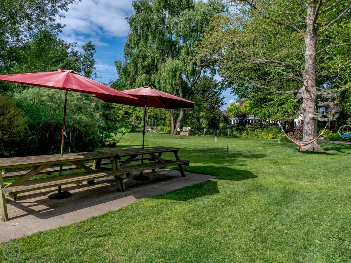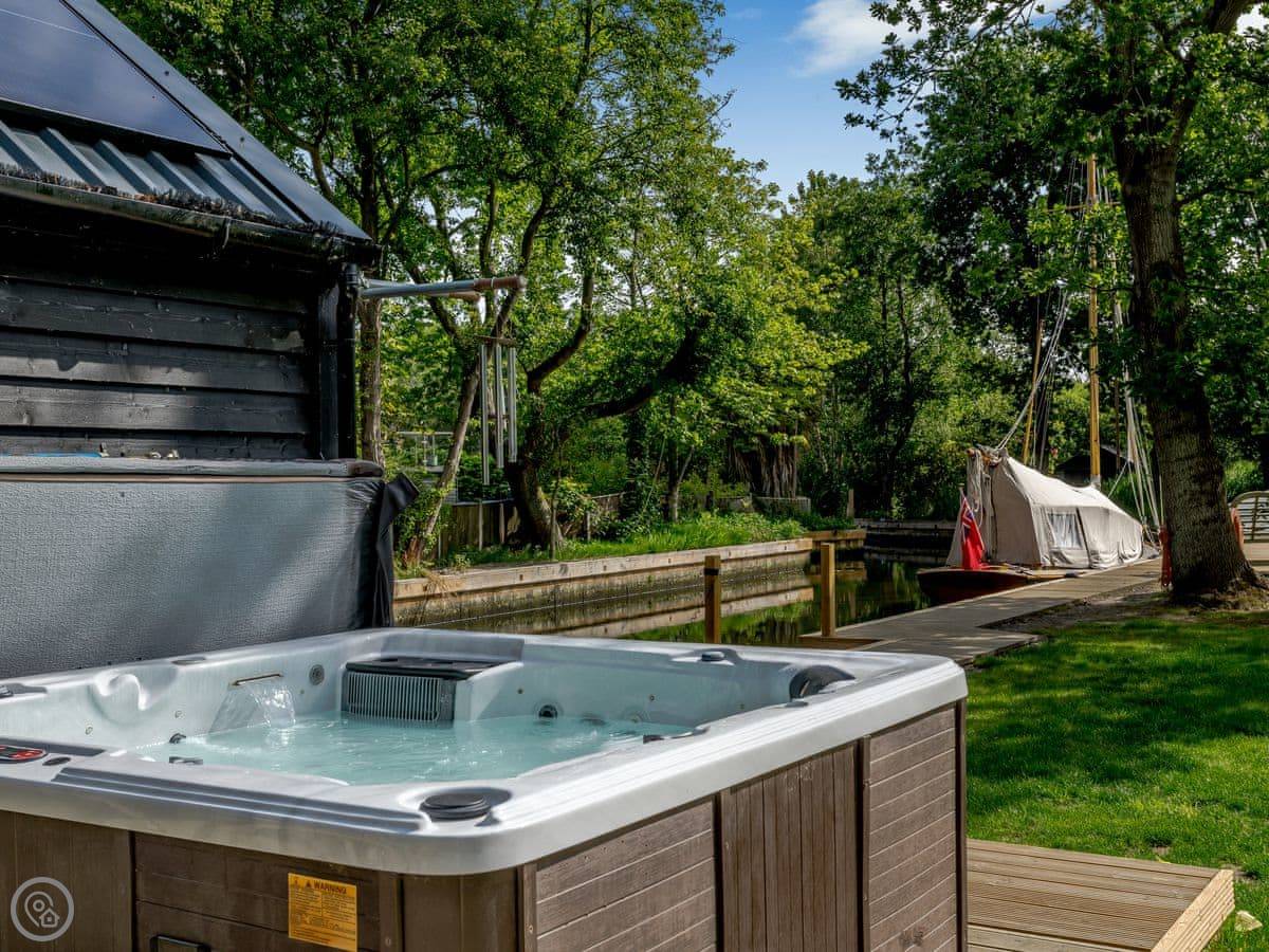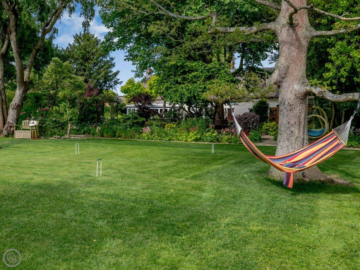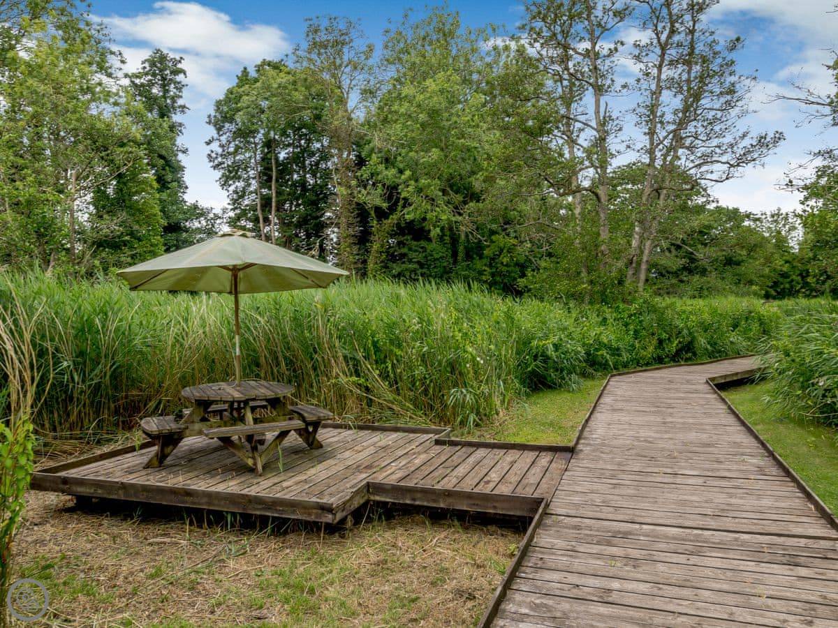 The main thing is the garden. It's large, about an acre, and it's not just a lawn. There are streams and ponds. It goes right down to the water. You have a private quayside mooring if you bring a boat. At the bottom of the garden, over a river bridge, there's a little separate bit of riverbank called Mowle Point. It's got a sun house and seats. You can sit there and watch the boats on Womack Water. It's good for fishing.