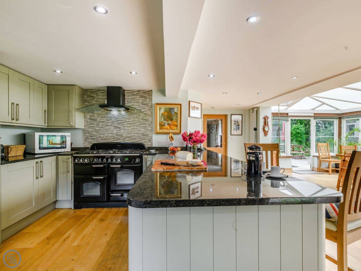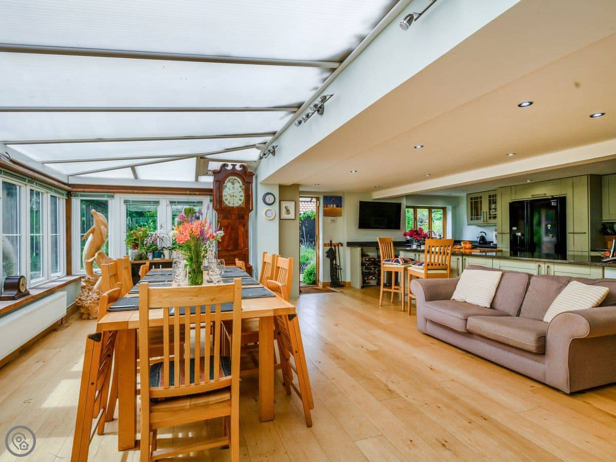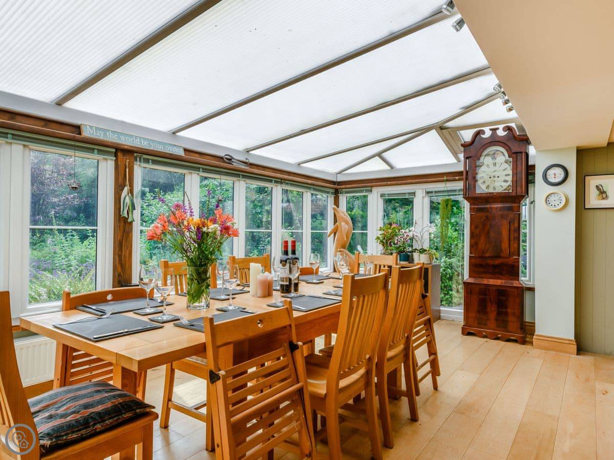 Inside, it's spacious. The kitchen is big enough for cooking for a crowd. The dining room is a conservatory, which is light. The dining table converts into a table tennis table. There's a games room with a pool table. The lounge has a woodburning stove.