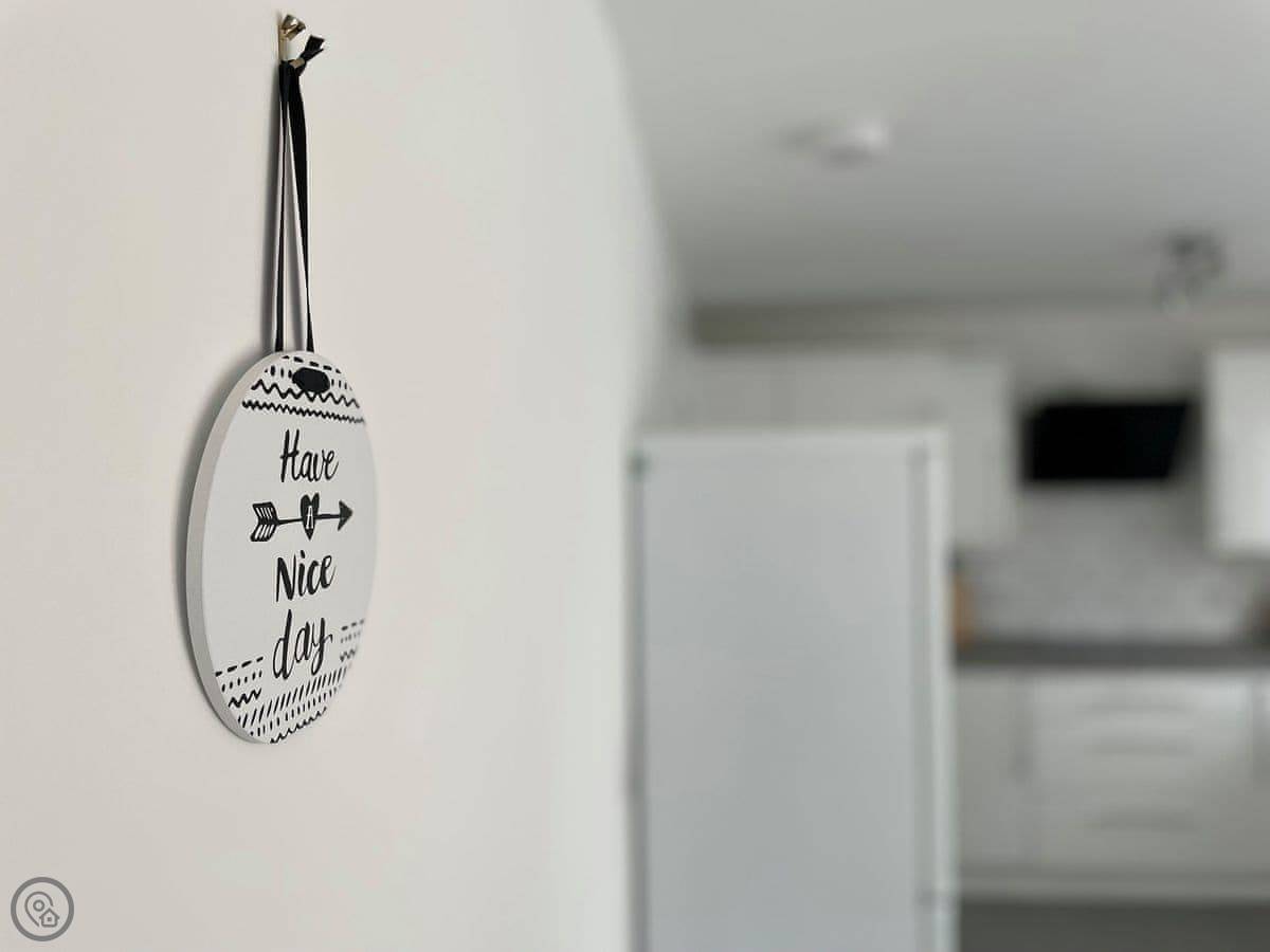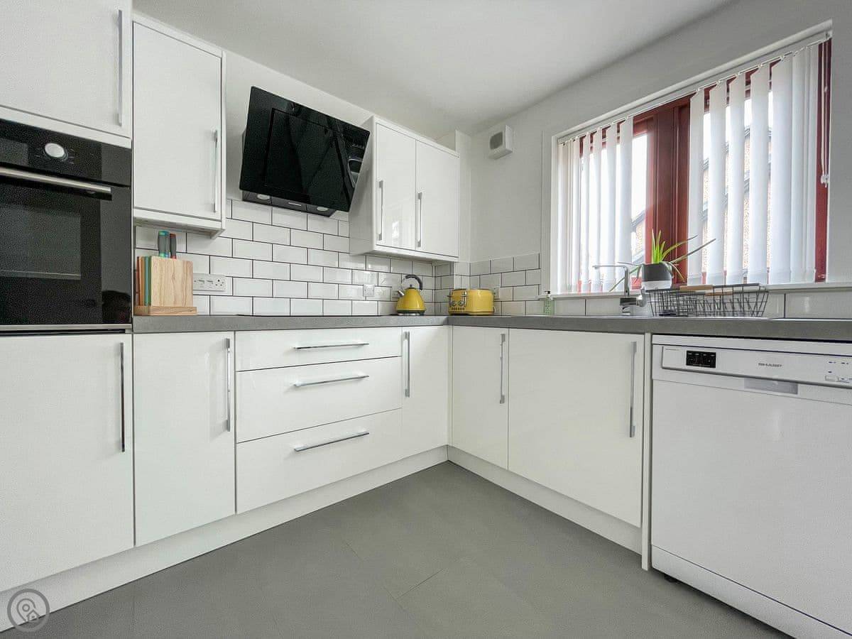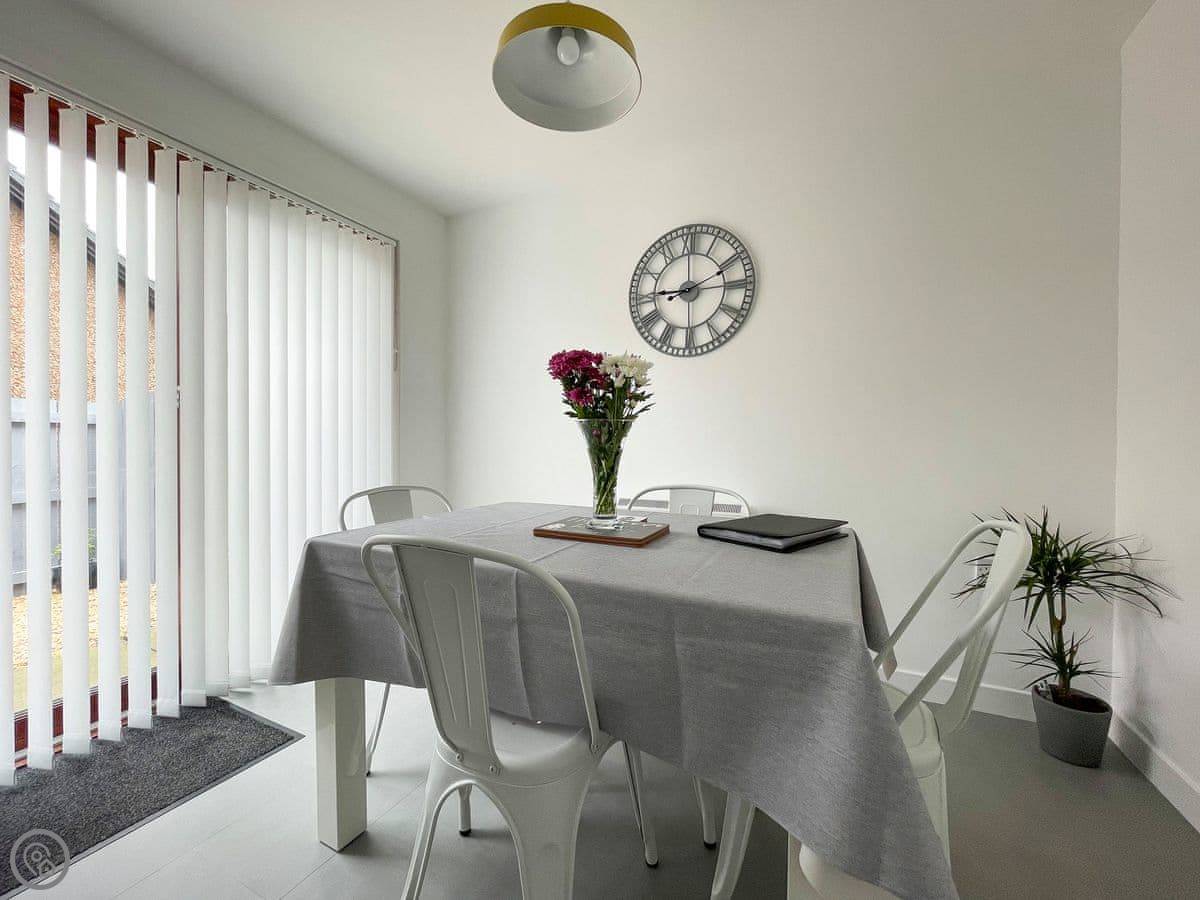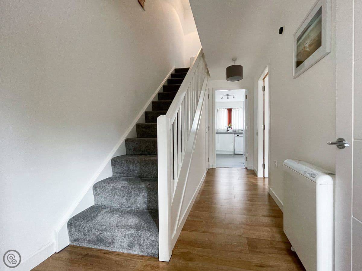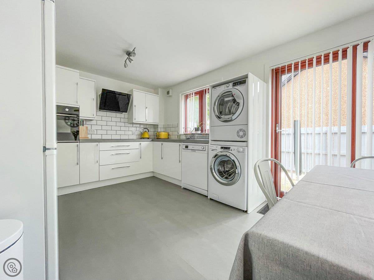So, when you arrive and enter through the front door you have a hallway ahead of you leading to the spacious and comfortable living room on the right, and the kitchen/dining room straight ahead of you. By the front door there is a useful vestibule area with thoughtful items in a wee cupboard, such as a beach towels and tennis racquets for those so inclined. The kitchen/dining room is so lovely and fresh with lots of natural light pouring in through windows and patio doors. The kitchen has everything you would need and want.