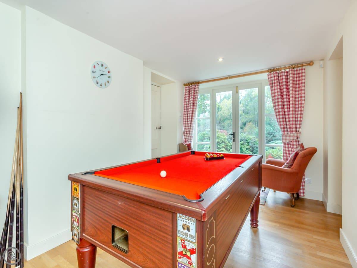 Downstairs, you come into the living room. There's a woodburning stove. Through the back is a dining room, then a pool room with French doors to the garden. The kitchen leads off from there, and there's a utility room with a washing machine.