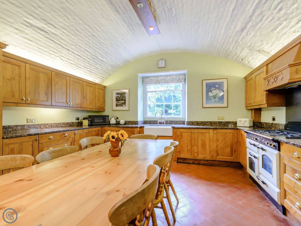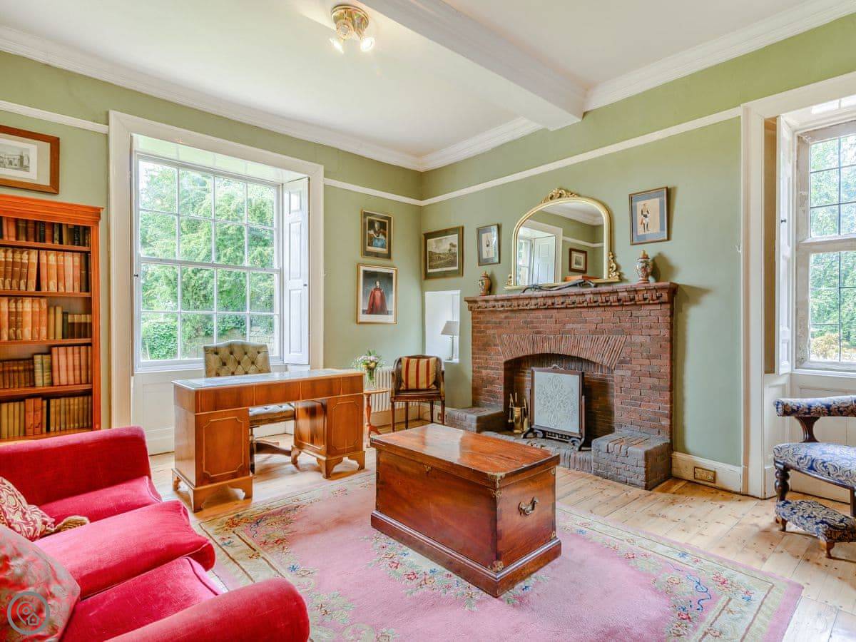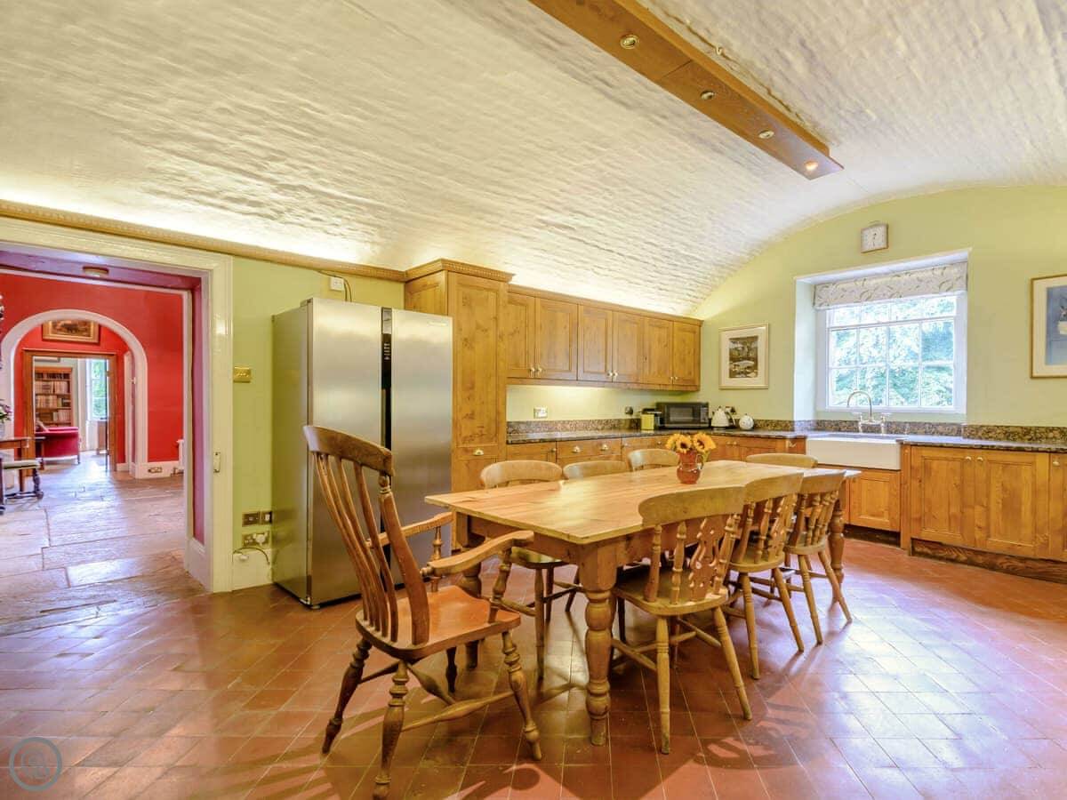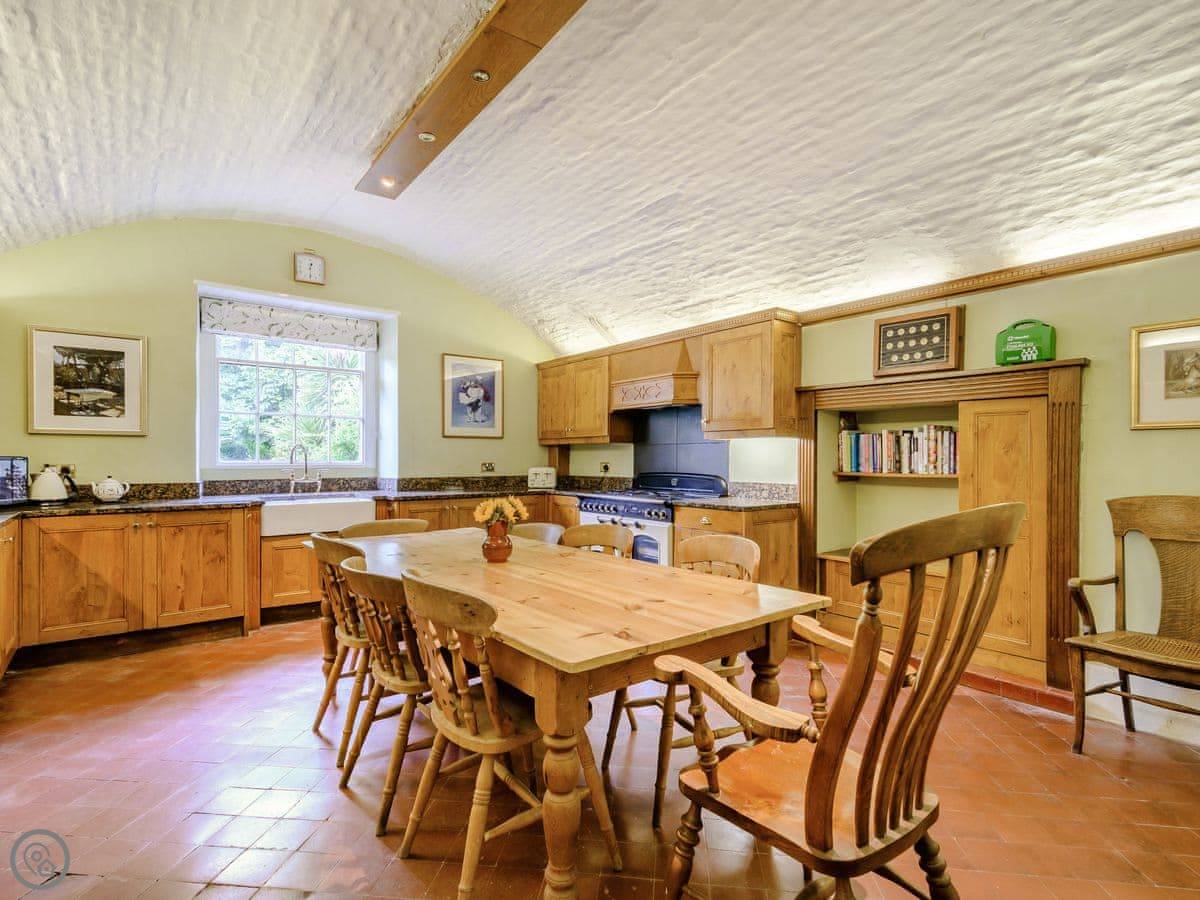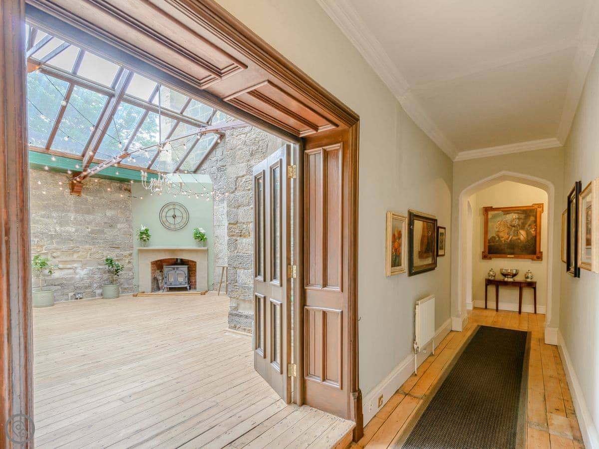 Downstairs is a lot of space. There's a big hall with a staircase, a library, a snug, a formal dining room, and an orangery off the kitchen. The kitchen itself is large, with a table. It's a family house, not a museum, so you can use the rooms. The garden is landscaped. There's a courtyard that gets the sun.
