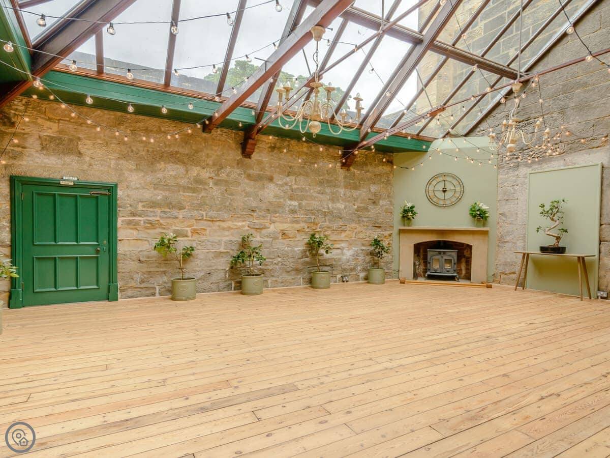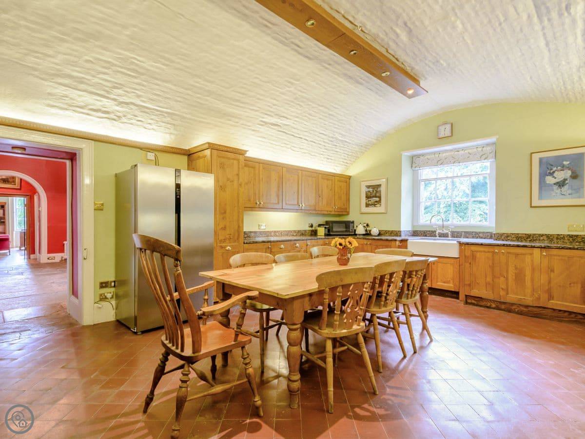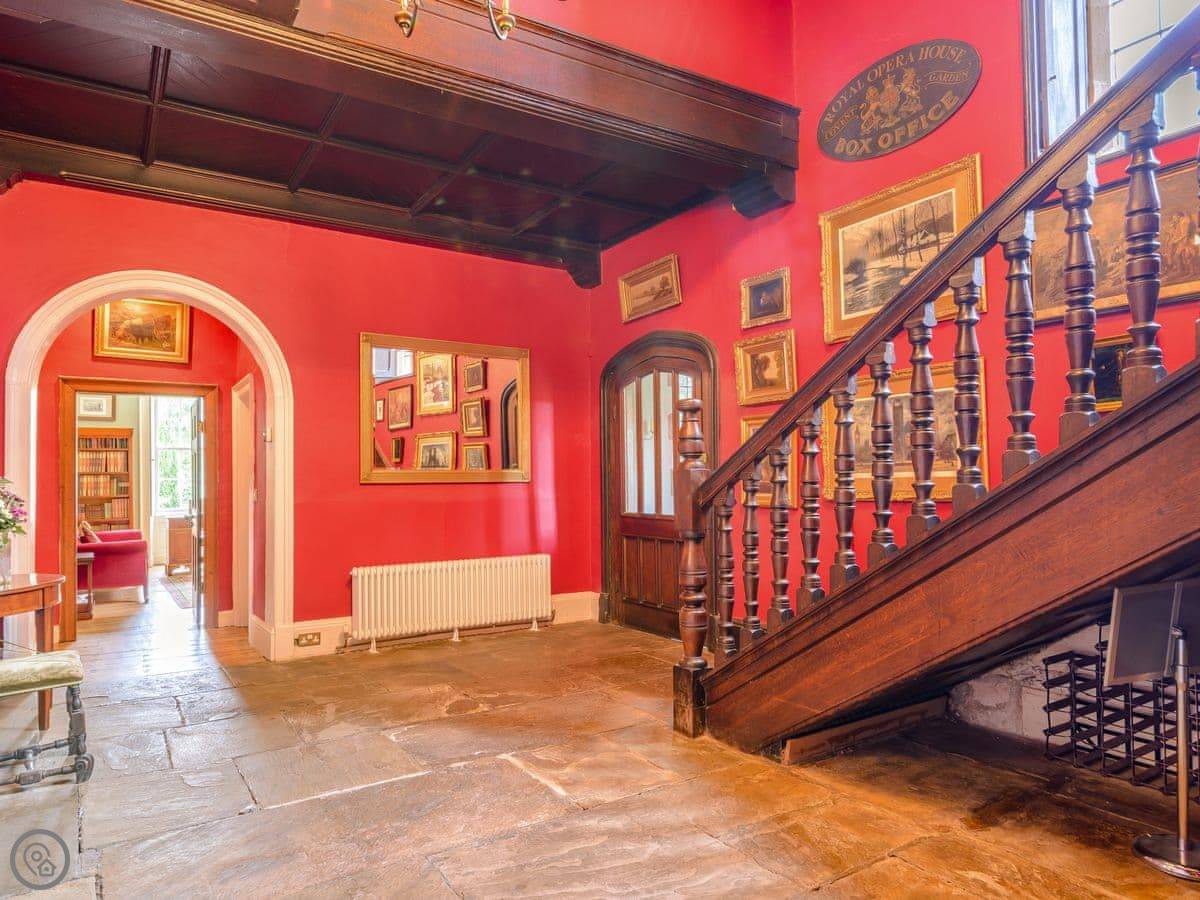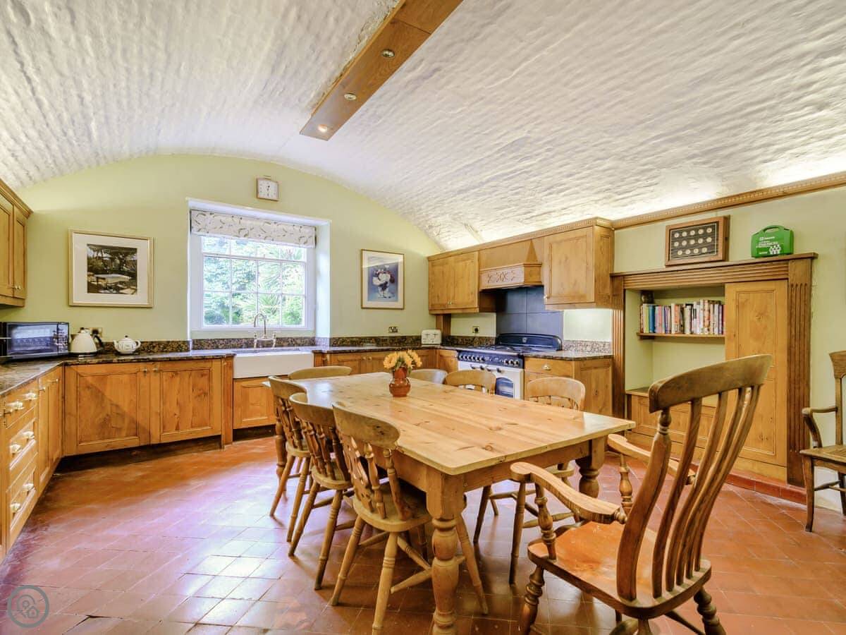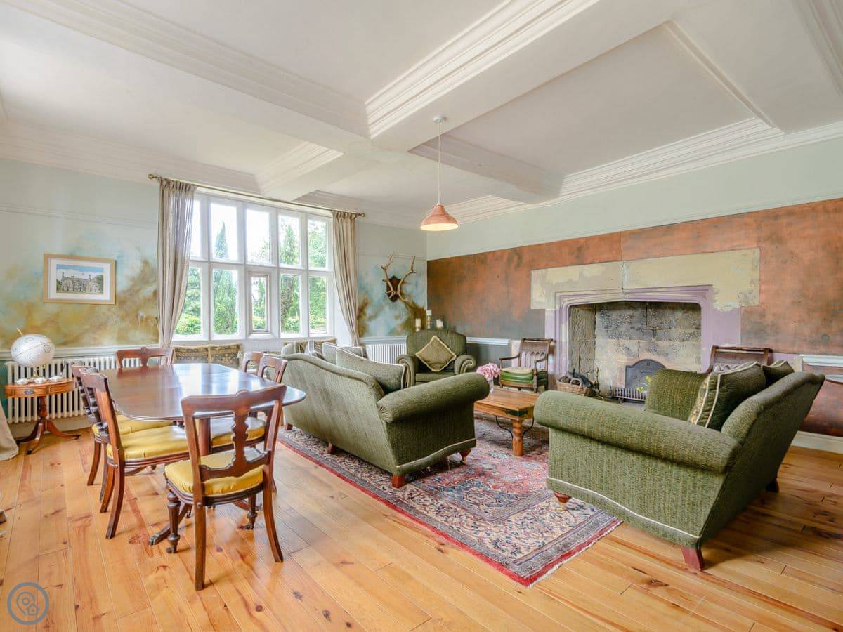Downstairs is a lot of space. There's a big hall with a staircase, a library, a snug, a formal dining room, and an orangery off the kitchen. The kitchen itself is large, with a table. It's a family house, not a museum, so you can use the rooms. The garden is landscaped. There's a courtyard that gets the sun.