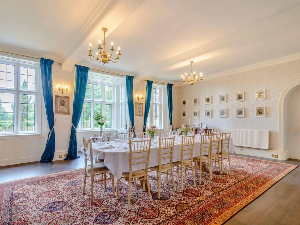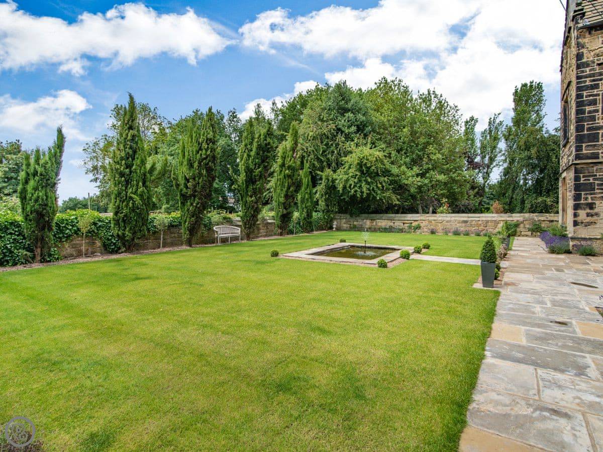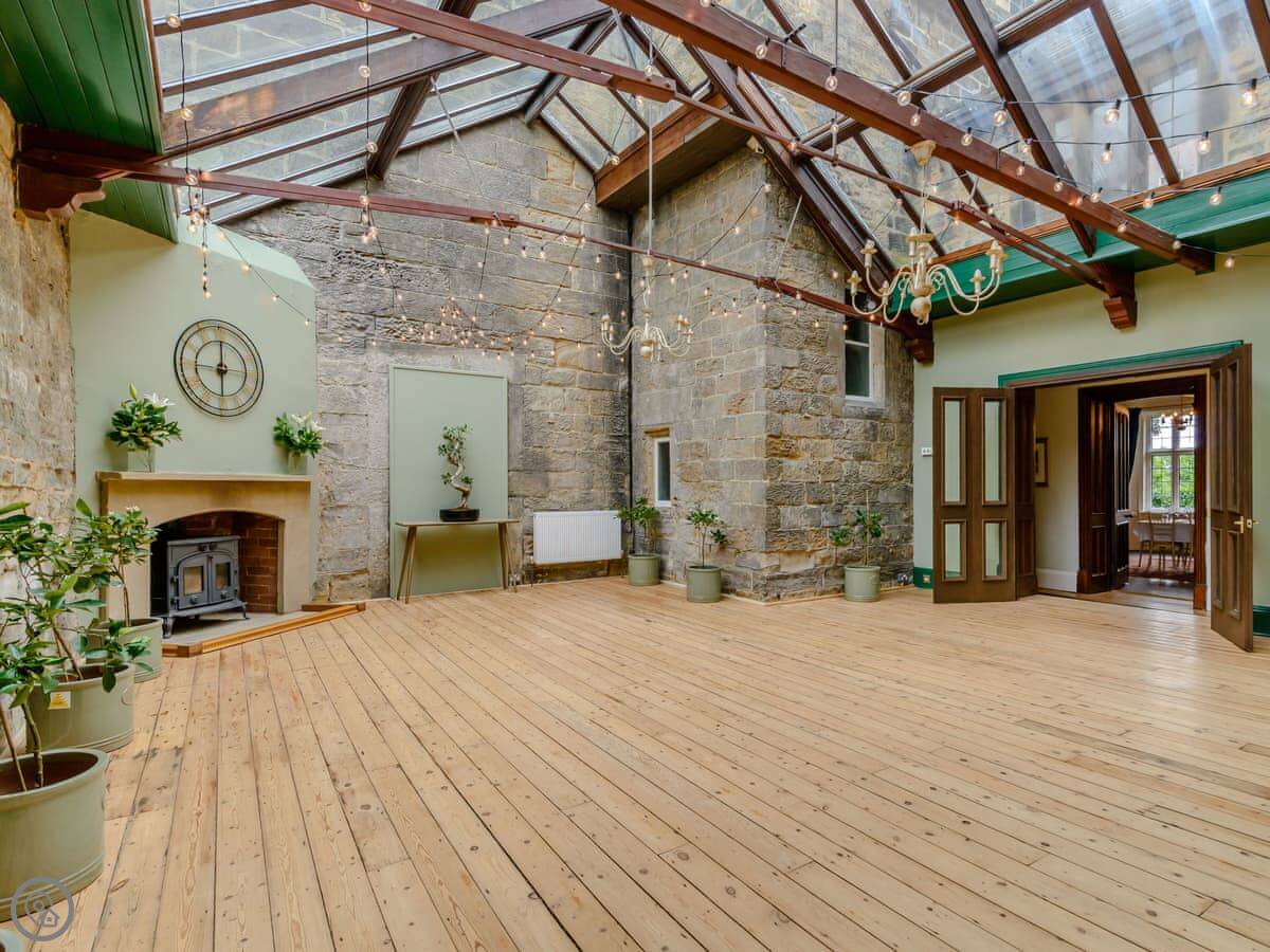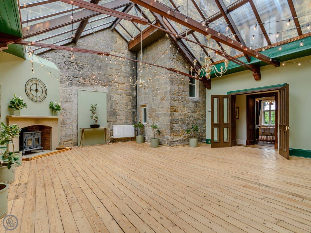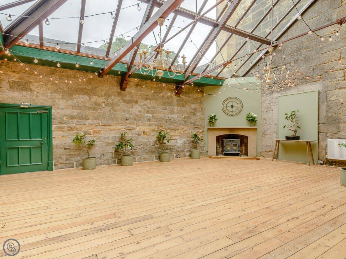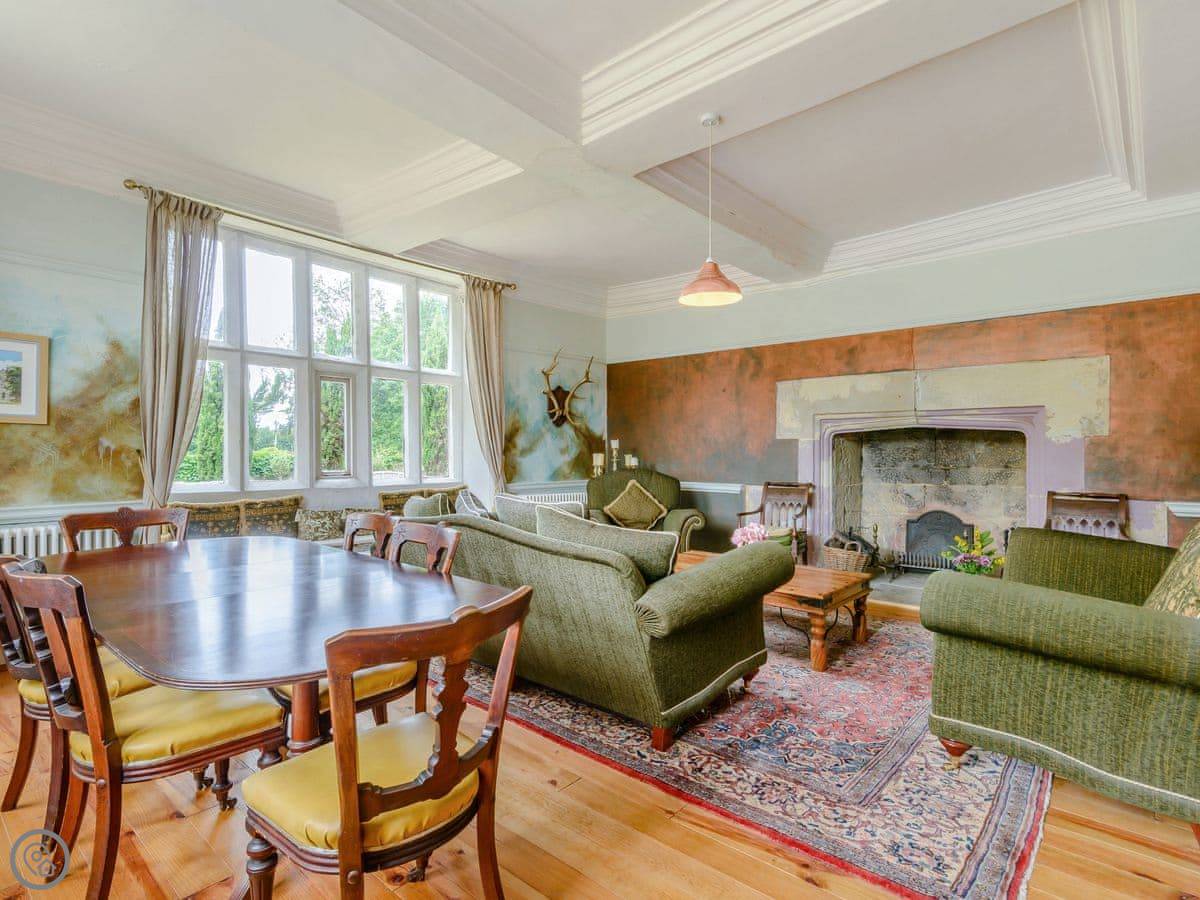 Downstairs is a lot of space. There's a big hall with a staircase, a library, a snug, a formal dining room, and an orangery off the kitchen. The kitchen itself is large, with a table. It's a family house, not a museum, so you can use the rooms. The garden is landscaped. There's a courtyard that gets the sun.