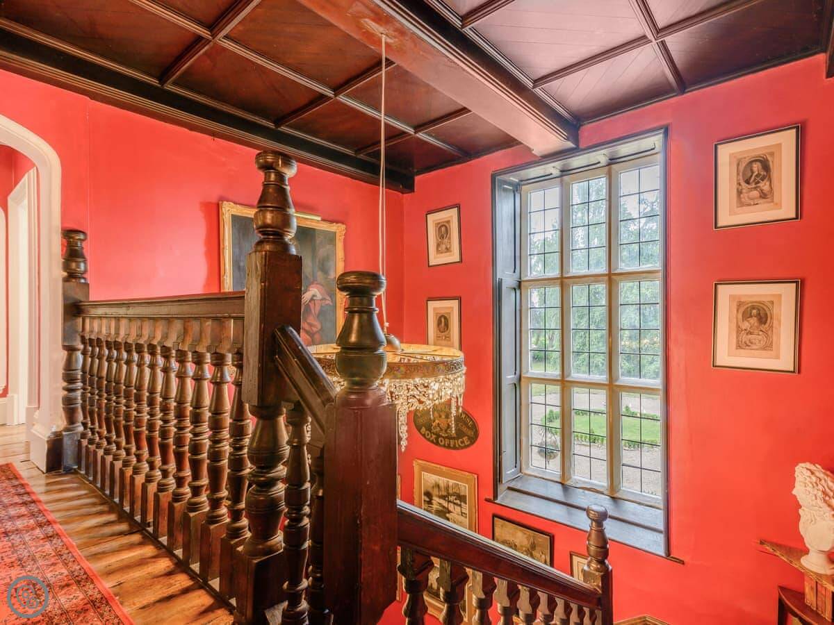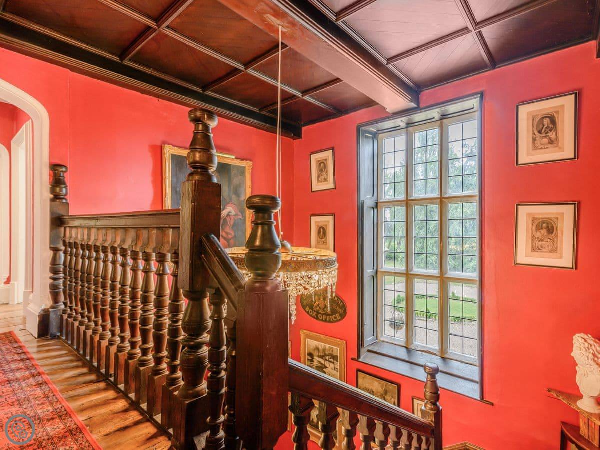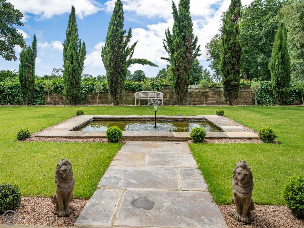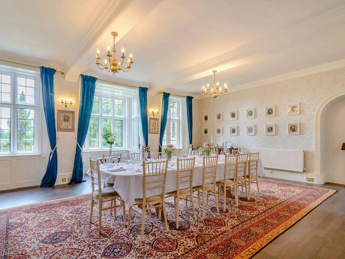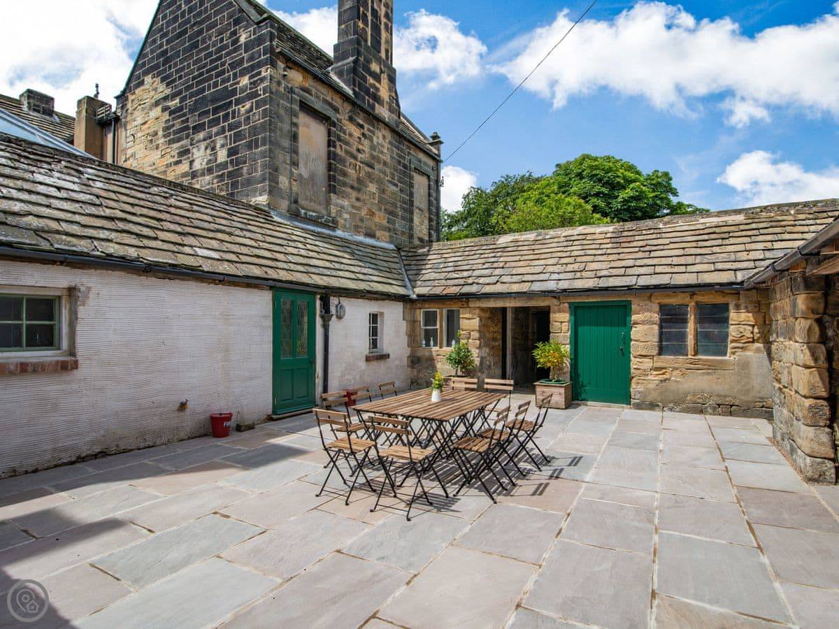 Downstairs is a lot of space. There's a big hall with a staircase, a library, a snug, a formal dining room, and an orangery off the kitchen. The kitchen itself is large, with a table. It's a family house, not a museum, so you can use the rooms. The garden is landscaped. There's a courtyard that gets the sun.